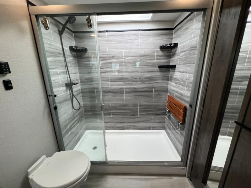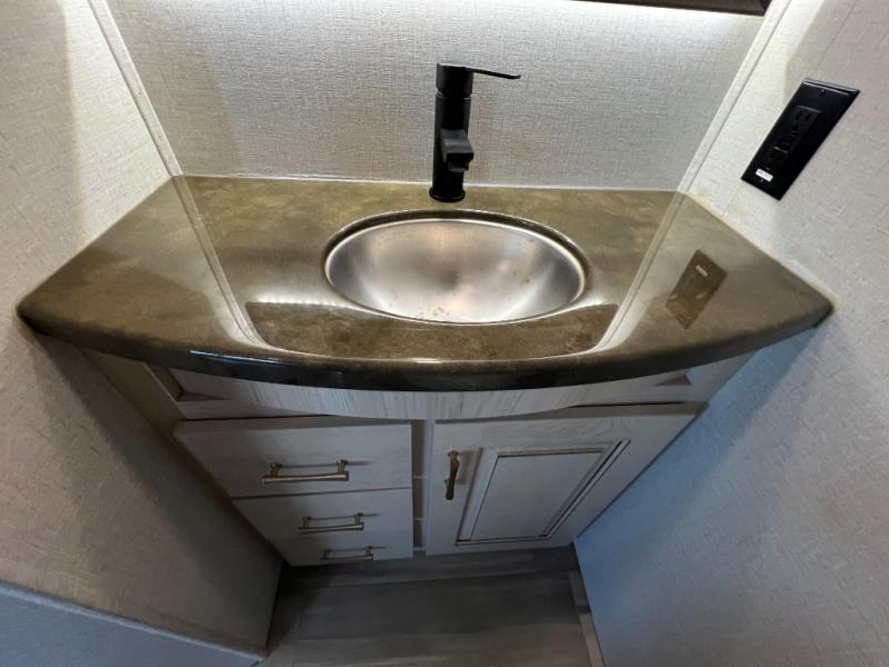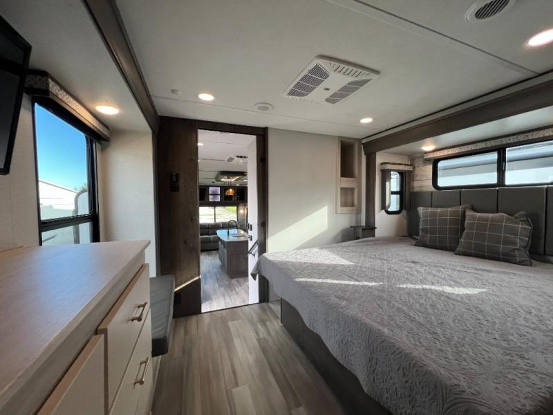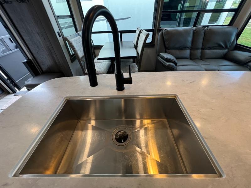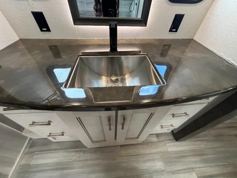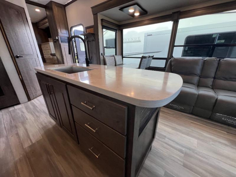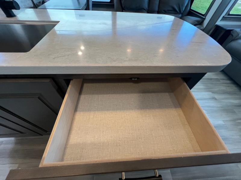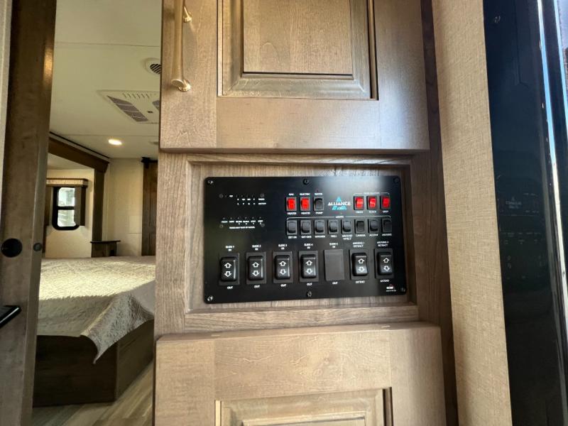 The Paradigm fifth wheel from Alliance RV is absolutely a dream to own because it combines high quality and luxury with features that you have specifically requested over the years! Some of the exterior customer-driven features are the Benchmark chassis, the G-range tires rated at 4,400 pounds, and the MorRyde CRE3000 suspension, and the Paradigm offers some of the industry's largest tank sizes at 98 gallons for fresh water and 106 gallons for gray water. The PVC roof covering will do an excellent job at protecting your RV from water intrusion, and it has increased solar reflectivity. You won't find any carpet in the Paradigm, and another great feature that has been reconstructed to meet the customer's needs is the flush-floor slide. The soft-close doors and drawers with magnetic catch are a high-end residential feature that isn't typically found on other RVs, and the excellent hidden storage capabilities of the Paradigm will surprise you when you find them.