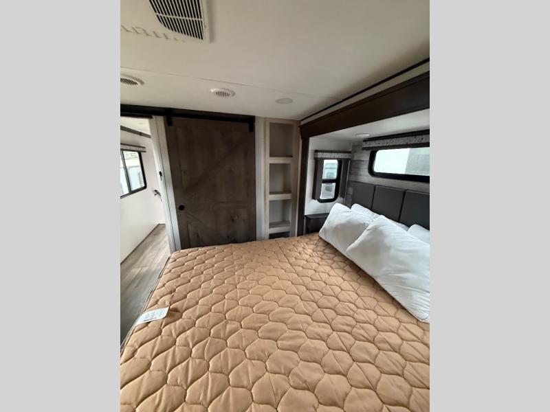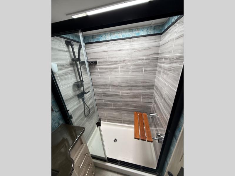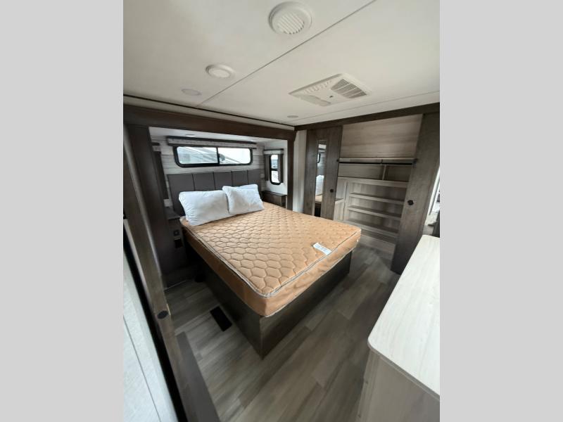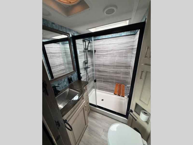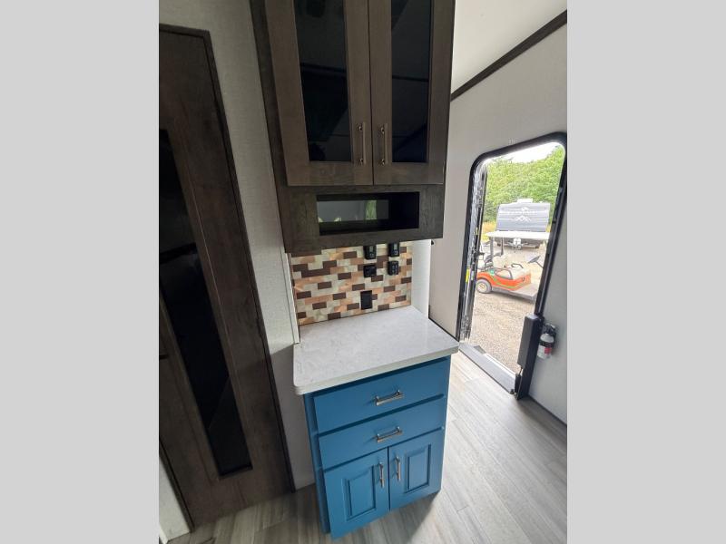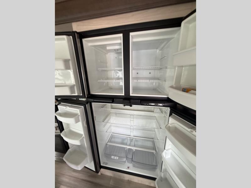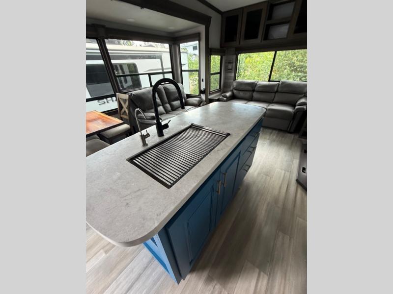 The Paradigm fifth wheel from Alliance RV is absolutely a dream to own because it combines high quality and luxury with features that you have specifically requested over the years! Some of the exterior customer-driven features are the Benchmark chassis, the G-range tires rated at 4,400 pounds, and the MorRyde CRE3000 suspension, and the Paradigm offers some of the industry's largest tank sizes at 98 gallons for fresh water and 106 gallons for gray water. The PVC roof covering will do an excellent job at protecting your RV from water intrusion, and it has increased solar reflectivity. You won't find any carpet in the Paradigm, and another great feature that has been reconstructed to meet the customer's needs is the flush-floor slide. The soft-close doors and drawers with magnetic catch are a high-end residential feature that isn't typically found on other RVs, and the excellent hidden storage capabilities of the Paradigm will surprise you when you find them.
