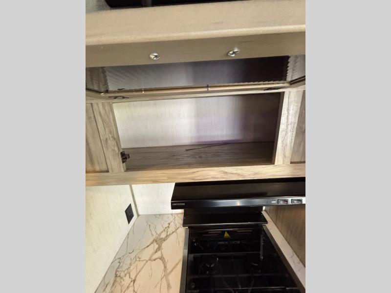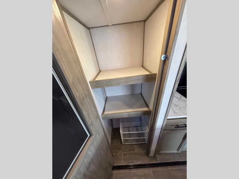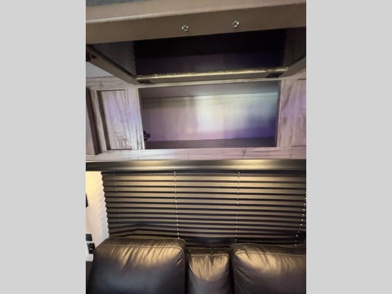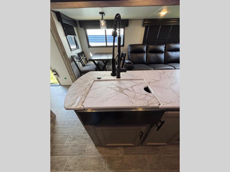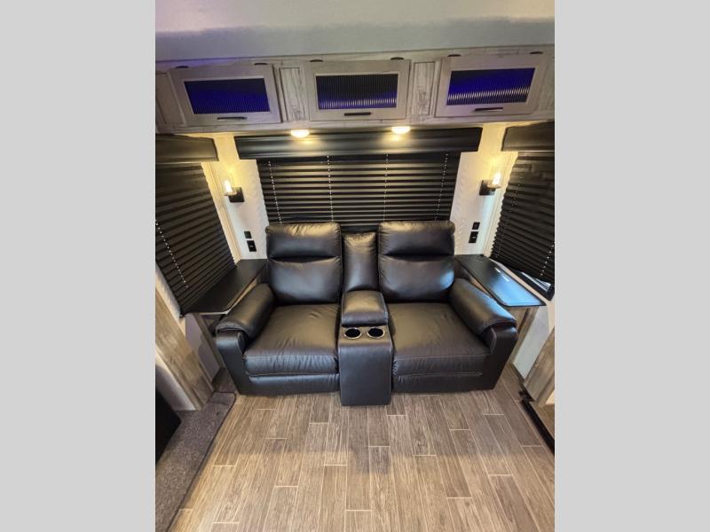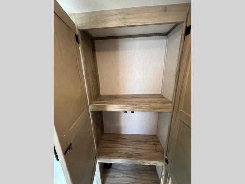 Come see how popular and spacious this couples travel trailer is! An extra guest or two can join in on the fun too with the rear tri-fold hide-a-bed sofa to convert into a sleeping space. The chef of your group will have an easy time preparing dinner with the kitchen island, and the coffee lover will appreciate the coffee bar. The free standing table comes with four chairs to enjoy your meals at, and after dinner you can relax at the home theatre seating for a relaxing, heated massage with a cozy fire roaring in the electric fireplace. Everyone can easily access the dual entry bathroom and take a hot shower in the radius shower with a skylight above to let in some natural lighting, plus you can head right into the front private bedroom from the bathroom. Grab your pajamas from one of the shirt closets on either side of the queen bed, and if you choose to add the optional TV then you can watch your favorite movie in true relaxation!