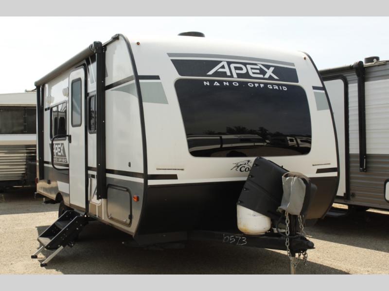 The Coachmen Apex Nano travel trailers and expandables should be at the top of your list because they are lightweight, easy to tow, and comfortable! Built upon an aluma-cage construction, the Apex Nano has a vacuum-bonded, aluminum trussed roof, a corrosion-resistant powder-coated frame, a front stone guard, Dexter E-Z Lube axles, and nitrogen-filled radial tires. Some of the modern features include a digital TV antenna with cable hook-ups and Wi-Fi capability, an AM/FM stereo with Bluetooth, exterior speakers, a DSI gas/electric water heater, and a power awning with LED lighting.