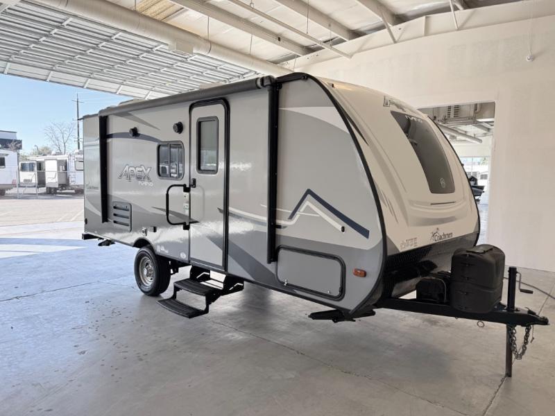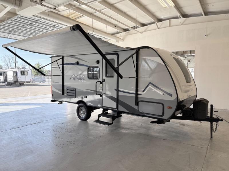 The Coachmen Apex Nano travel trailers and expandables should be at the top of your list because they are lightweight, easy to tow, and comfortable! Built upon an aluma-cage construction, the Apex Nano has a vacuum-bonded, aluminum trussed roof, a corrosion-resistant powder-coated frame, a front stone guard, Dexter E-Z Lube axles, and nitrogen-filled radial tires. Some of the modern features include a digital TV antenna with cable hook-ups and Wi-Fi capability, an AM/FM stereo with Bluetooth, exterior speakers, a DSI gas/electric water heater, and a power awning with LED lighting.