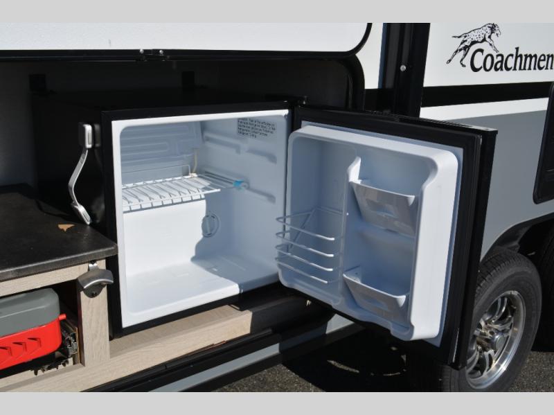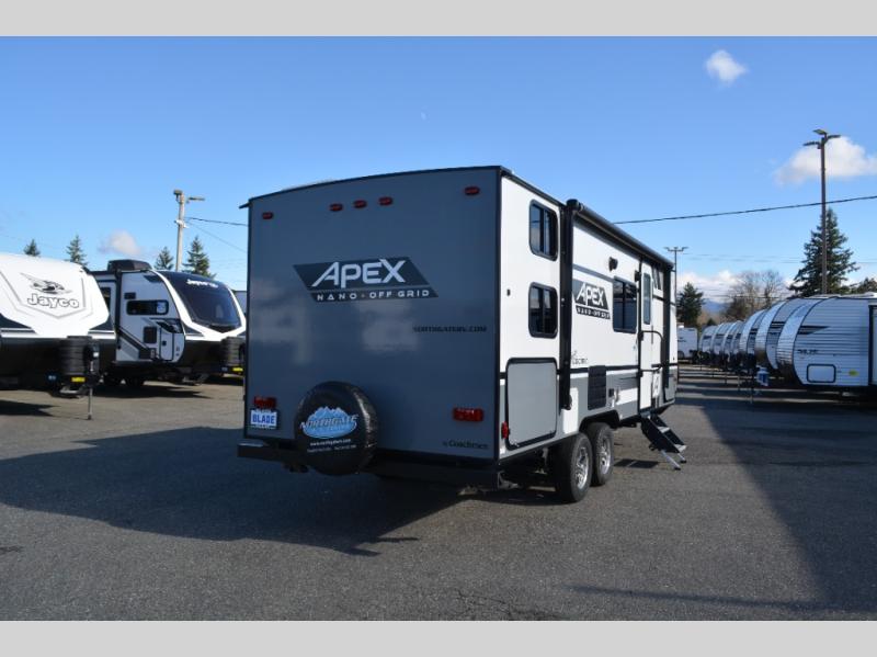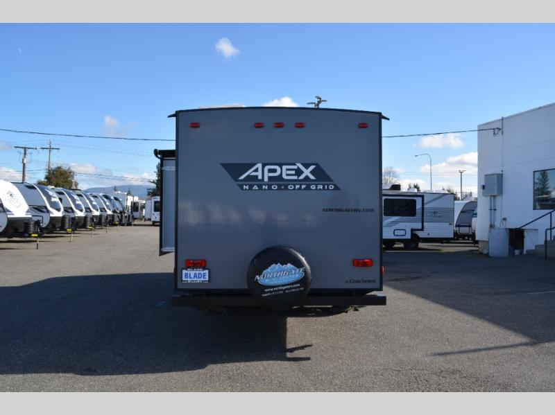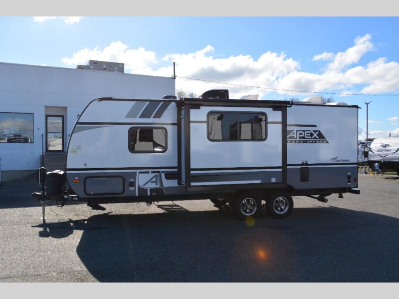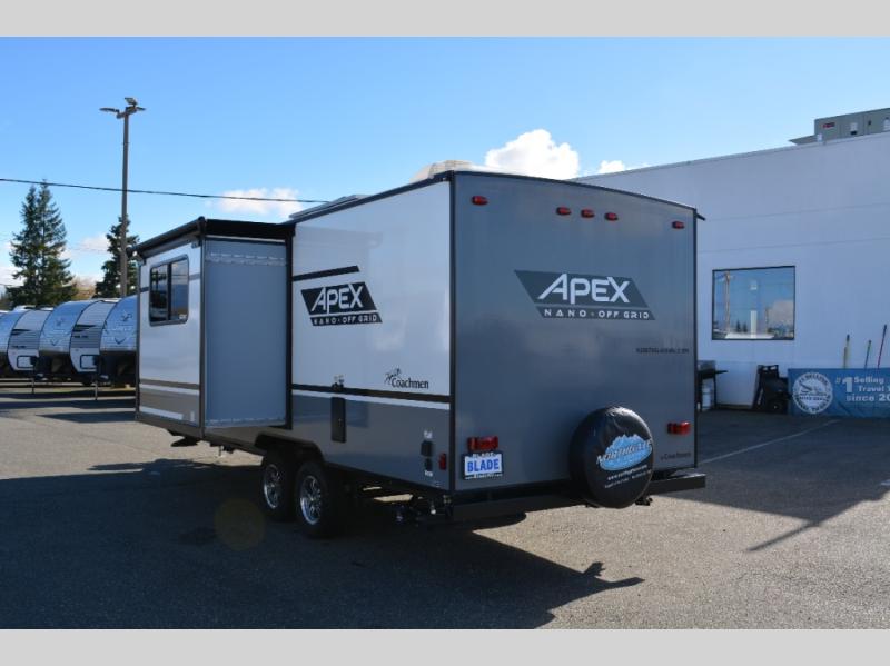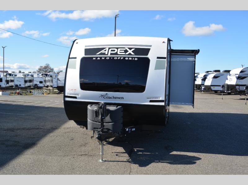 The Coachmen Apex Nano travel trailers and expandables should be at the top of your list because they are lightweight, easy to tow, and comfortable! Built upon an aluma-cage construction, the Apex Nano has a vacuum-bonded, aluminum trussed roof, a corrosion-resistant powder-coated frame, a front stone guard, Dexter E-Z Lube axles, and nitrogen-filled radial tires. Some of the modern features include a digital TV antenna with cable hook-ups and Wi-Fi capability, an AM/FM stereo with Bluetooth, exterior speakers, a DSI gas/electric water heater, and a power awning with LED lighting.