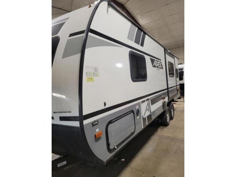 Enjoy each camping adventure with this Apex Nano travel trailer as your home base! This unit features all of the necessities, plus some added space thanks to the sofa slide. This model offers sleeping for four to five people with a queen bed up front and the furniture provided. You can make meals for the family with the kitchen amenities and wash up after a fun day in the full bathroom. There is plenty of storage throughout the interior along with a front exterior pass-through compartment for those larger items. Load up your family and gear and start making memories!