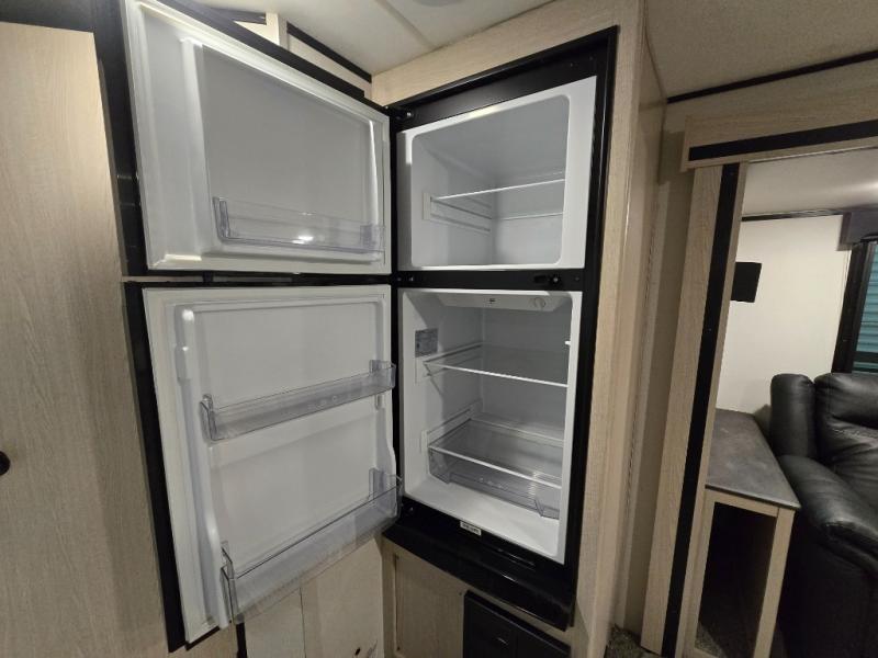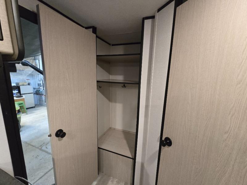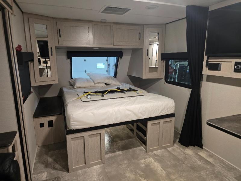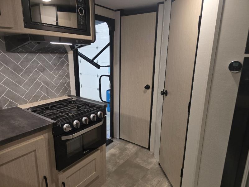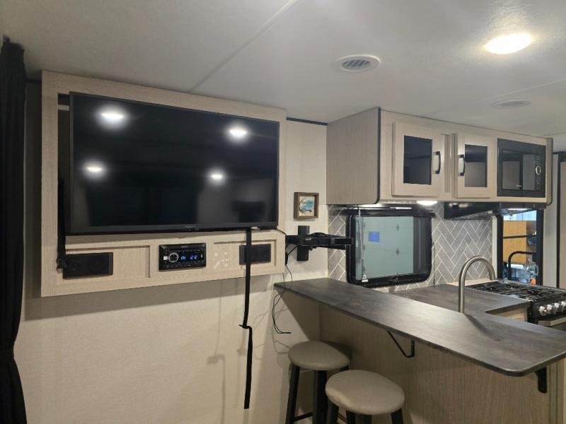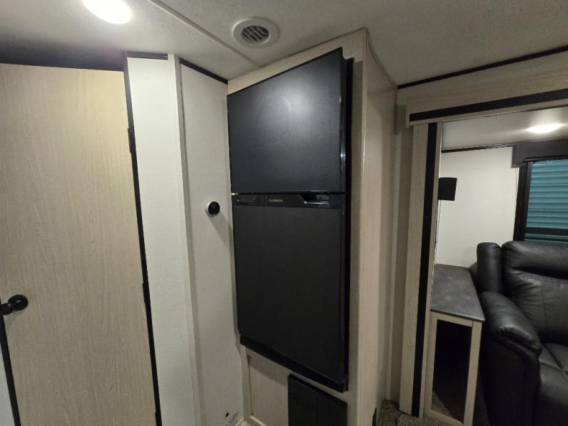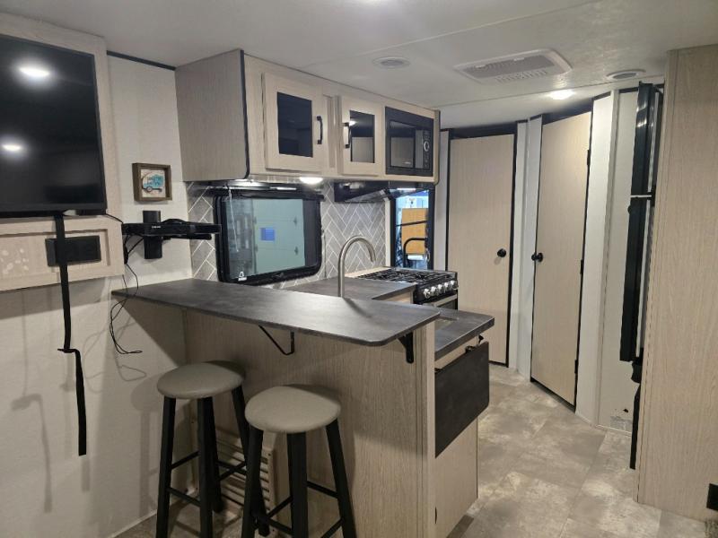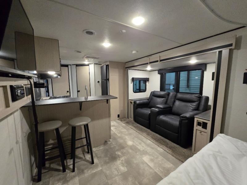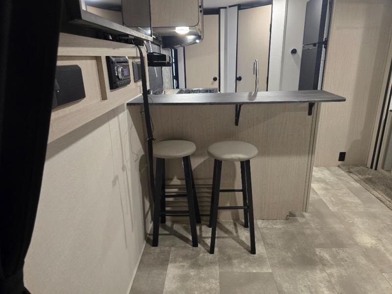 Enjoy a home away from home with this travel trailer! You can start and end each day in true comfort laying on the front queen bed with wardrobes on either side and super storage below it. Grab some eggs and bacon from the 8 cu. ft. 12V refrigerator then fry them up on the three burner cooktop. Once the coffee is brewed and the food is fried, you can head to the bar top and sit on one of the two bar stools to enjoy your breakfast. The sofa has end tables on either side to set your snacks on while you enjoy the entertainment center at night. There is also an entry closet to hang your coats and store your shoes!