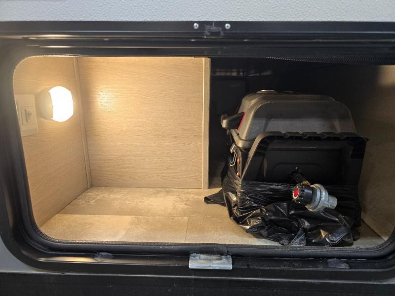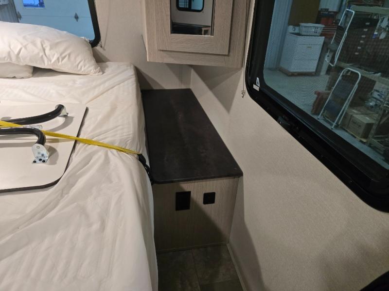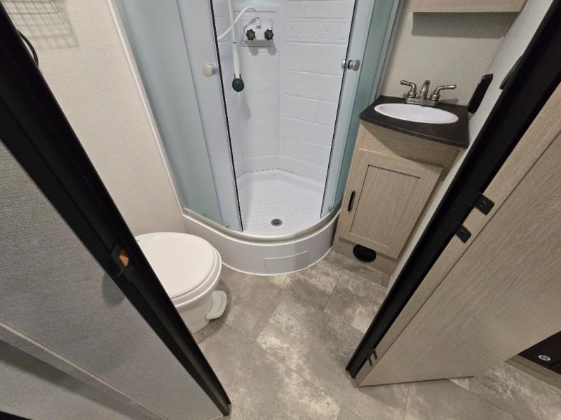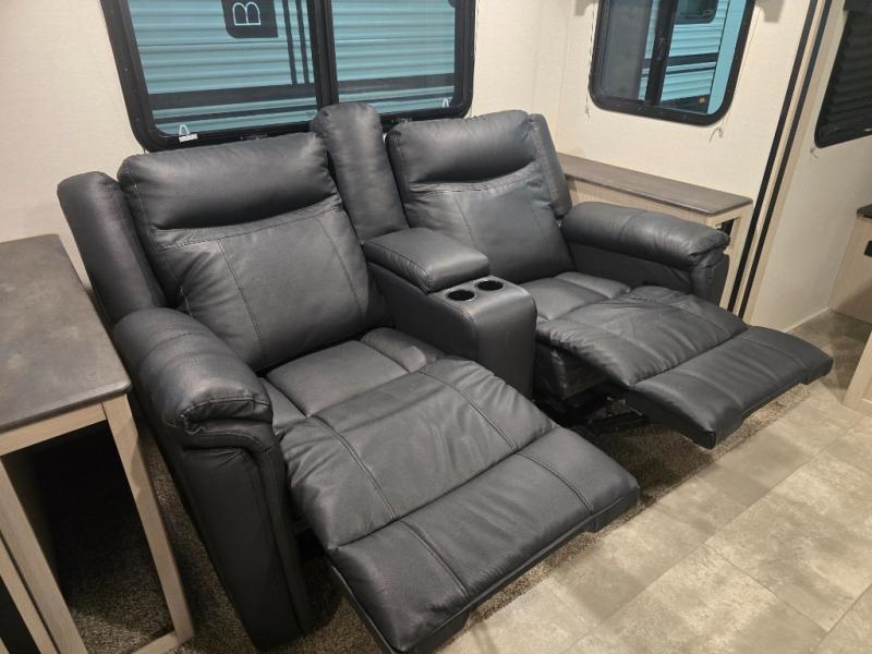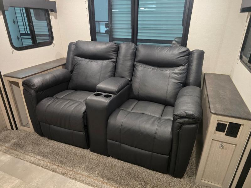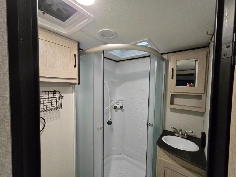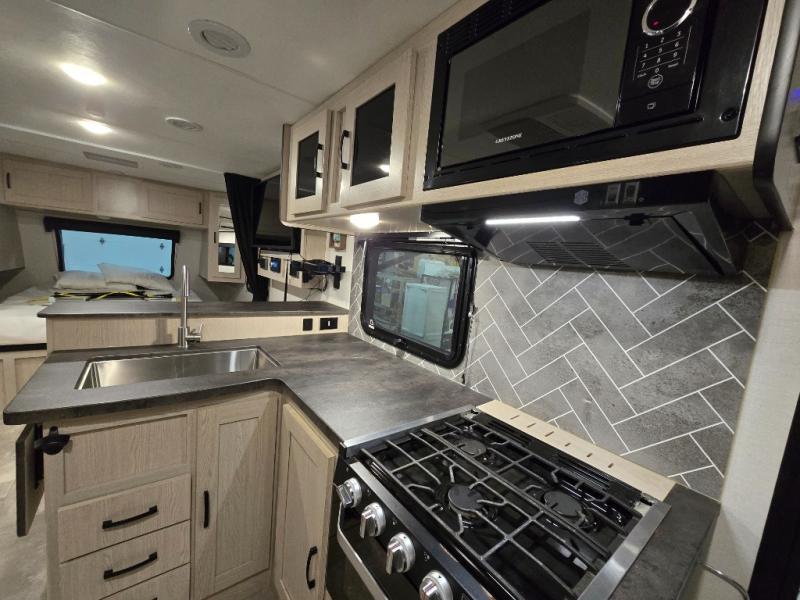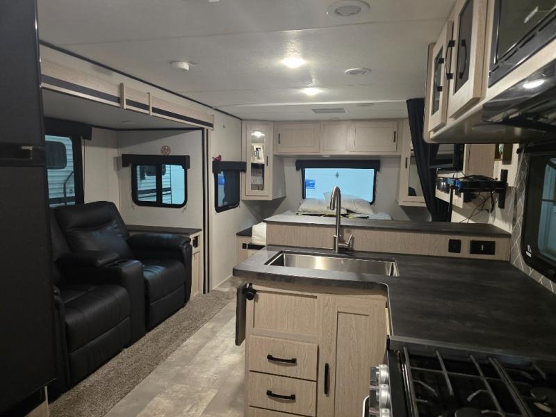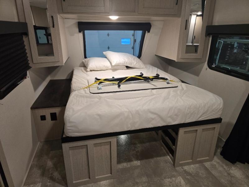 Enjoy a home away from home with this travel trailer! You can start and end each day in true comfort laying on the front queen bed with wardrobes on either side and super storage below it. Grab some eggs and bacon from the 8 cu. ft. 12V refrigerator then fry them up on the three burner cooktop. Once the coffee is brewed and the food is fried, you can head to the bar top and sit on one of the two bar stools to enjoy your breakfast. The sofa has end tables on either side to set your snacks on while you enjoy the entertainment center at night. There is also an entry closet to hang your coats and store your shoes!