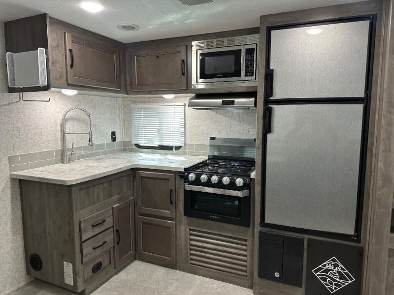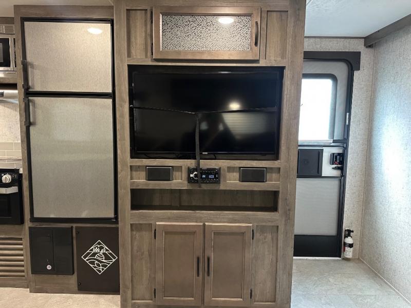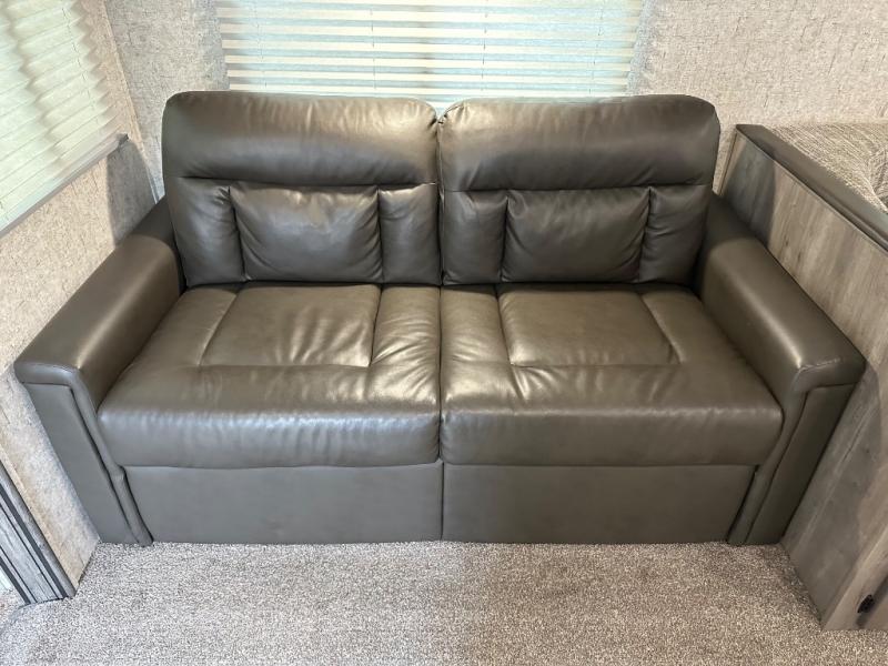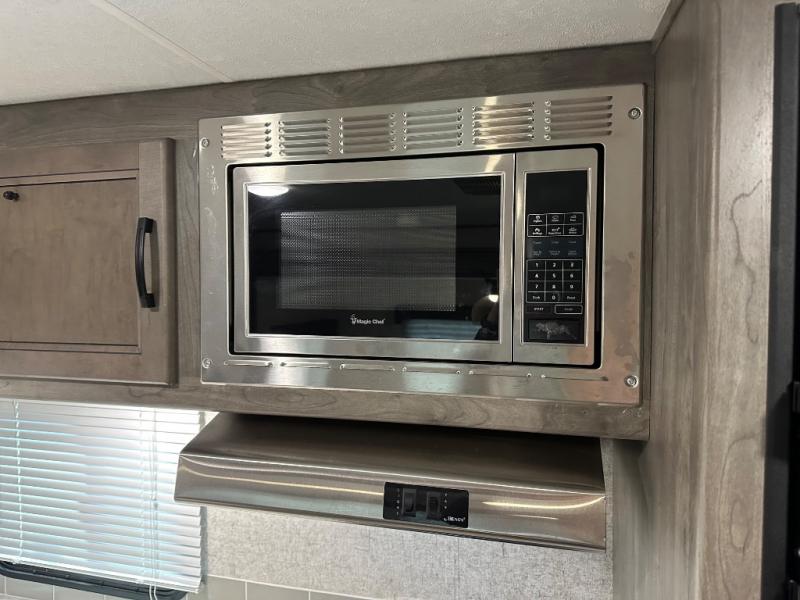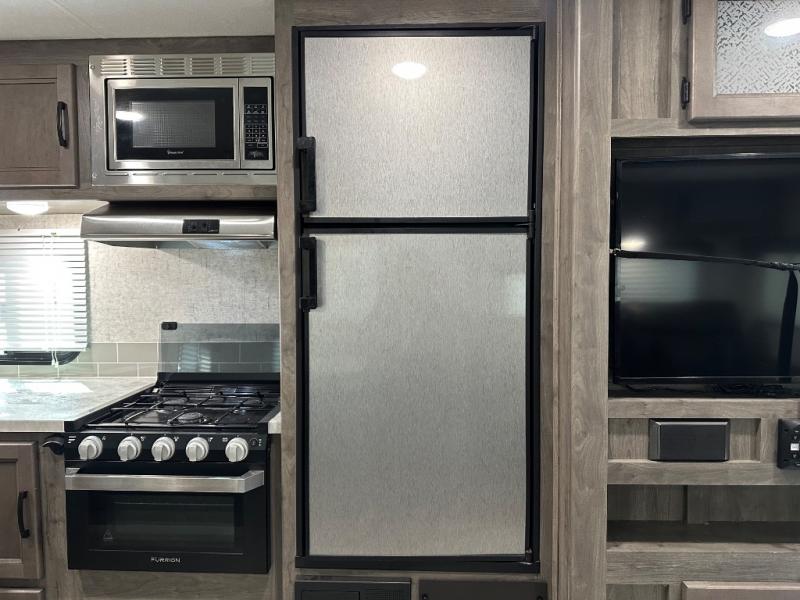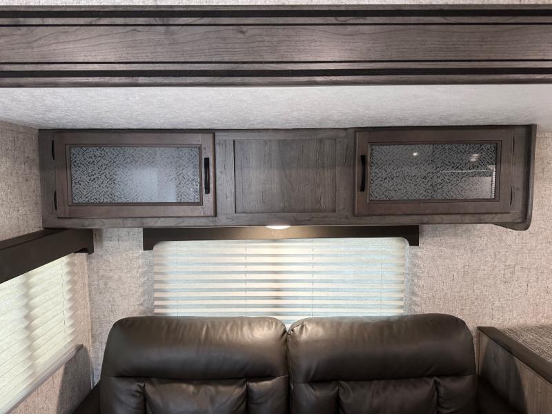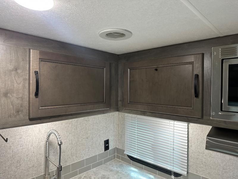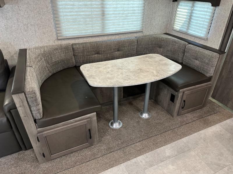 Take one look at this travel trailer and you can be sure you've just found your new RV. You'll love the extra interior space the large slide provides and here you'll find a U-shaped dinette and a hide-a-bed sofa that is great for enjoying meals together, relaxing, and additional sleeping space. You can also choose to switch it out for the optional theatre seating or recliners. The chef of the family will have everything they need to prepare breakfast, lunch, and dinner with a three burner range. Bring along all of your valuables since this unit includes overhead compartments, dual wardrobes in the bedroom, a walk-in closet, plus an exterior pass-through storage for all your camp gear.