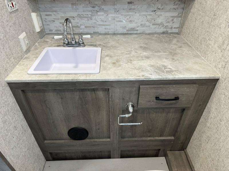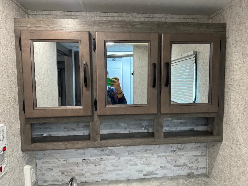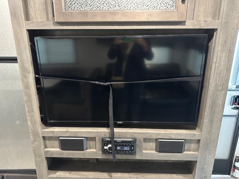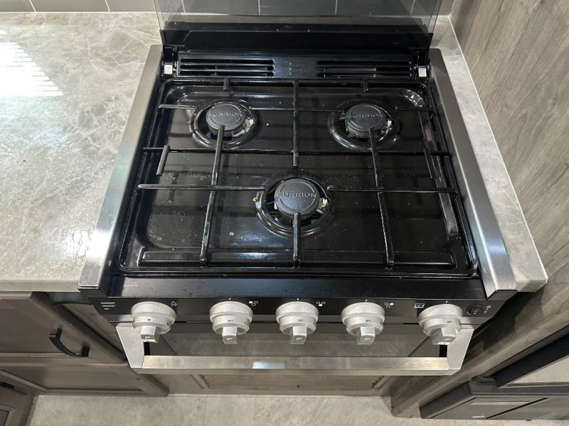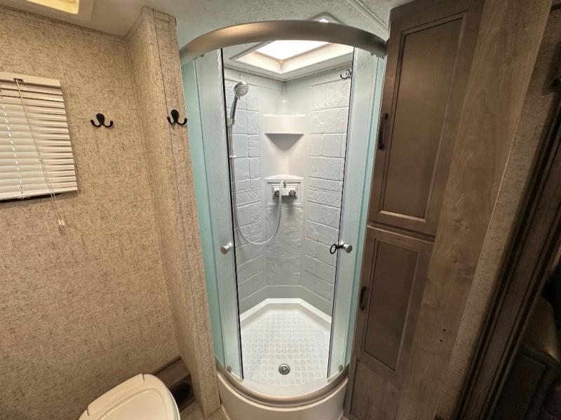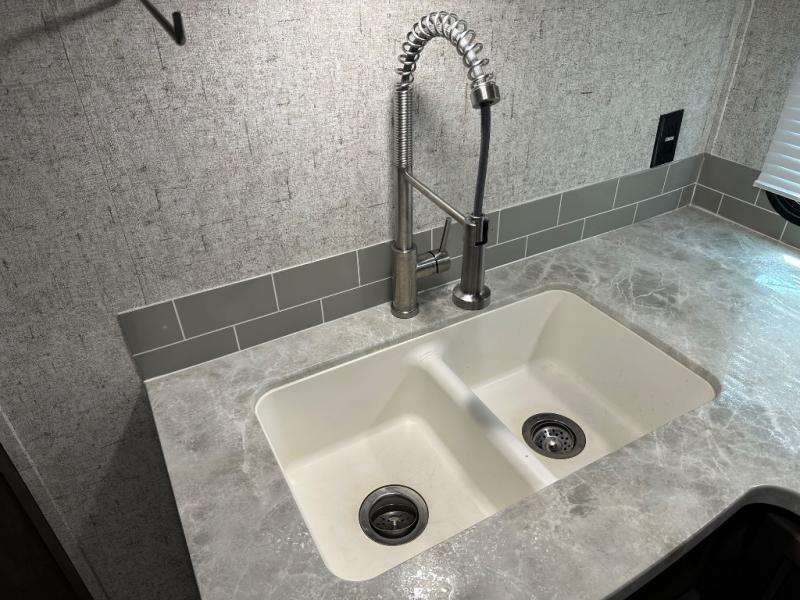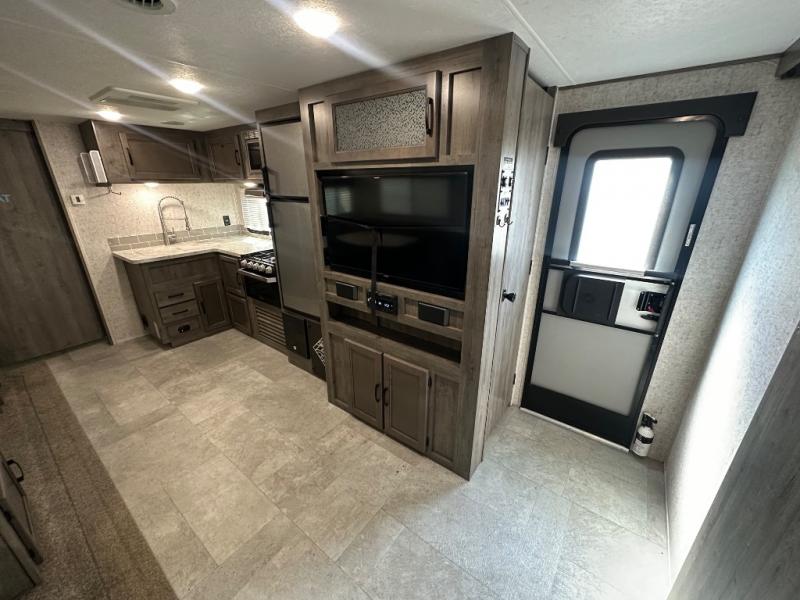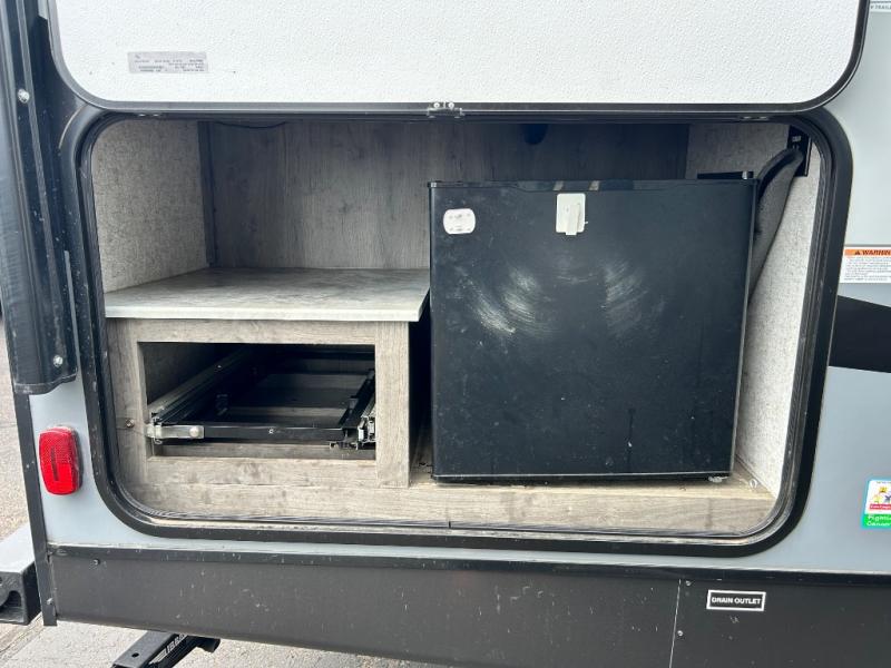 Take one look at this travel trailer and you can be sure you've just found your new RV. You'll love the extra interior space the large slide provides and here you'll find a U-shaped dinette and a hide-a-bed sofa that is great for enjoying meals together, relaxing, and additional sleeping space. You can also choose to switch it out for the optional theatre seating or recliners. The chef of the family will have everything they need to prepare breakfast, lunch, and dinner with a three burner range. Bring along all of your valuables since this unit includes overhead compartments, dual wardrobes in the bedroom, a walk-in closet, plus an exterior pass-through storage for all your camp gear.