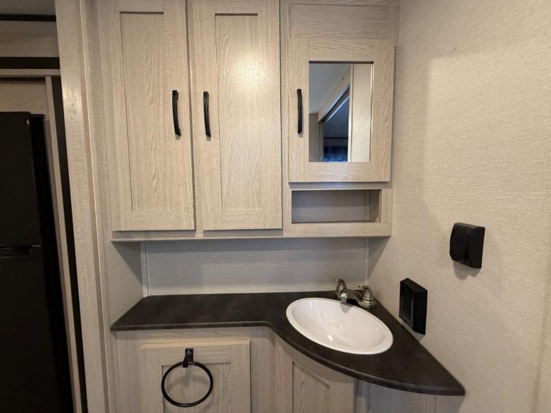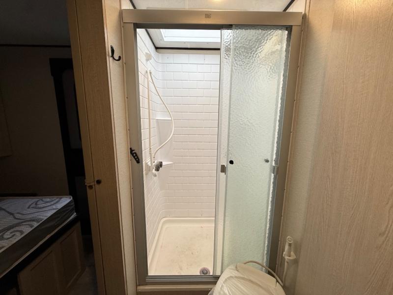 This 8' wide travel trailer is ready to head to the campground when ever you are! In the rear, there is a set of 54" x 74" double bunk beds with a wardrobe behind the 68" x 35" jackknife sofa and storage steps. The entertainment center can be moved so that everyone can easily view it, and behind the center is a pantry/storage area to keep your favorite snacks. The kitchen has a three burner cooktop for you to create your best dishes and a countertop extension to make it easier to prepare them too. The walk-through bathroom can be easily accessed from the front private bedroom which has a queen bed with super storage below it and wardrobes on either side, as well as an entrance/exit door to the unit!