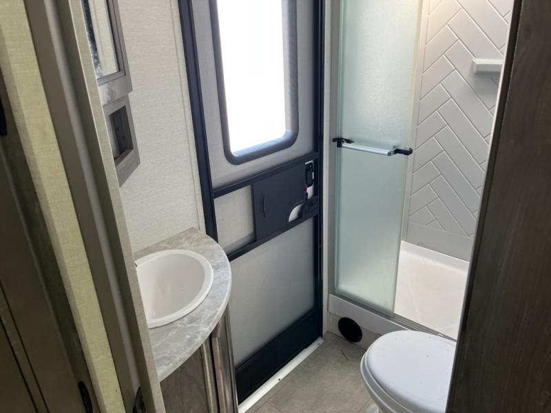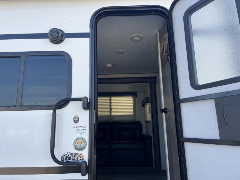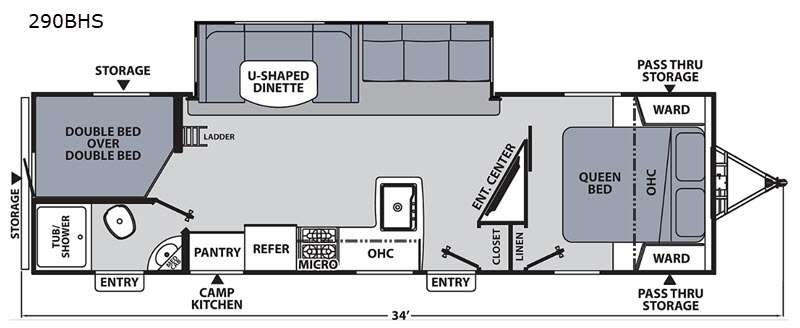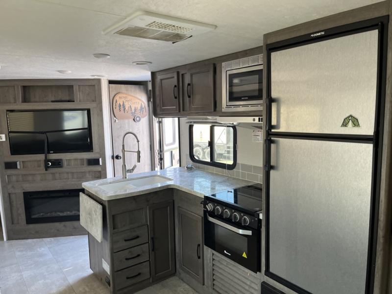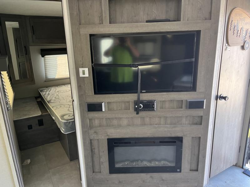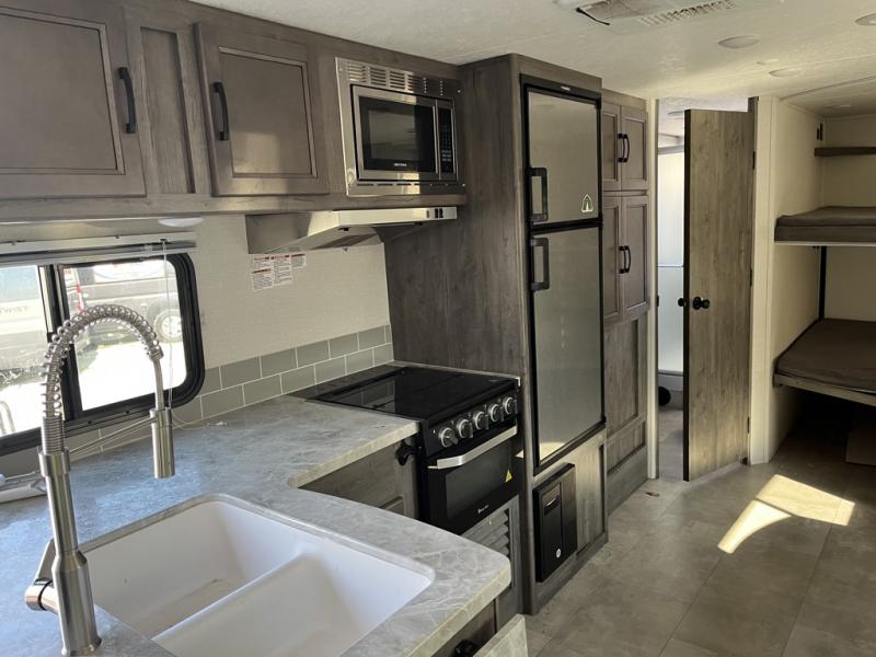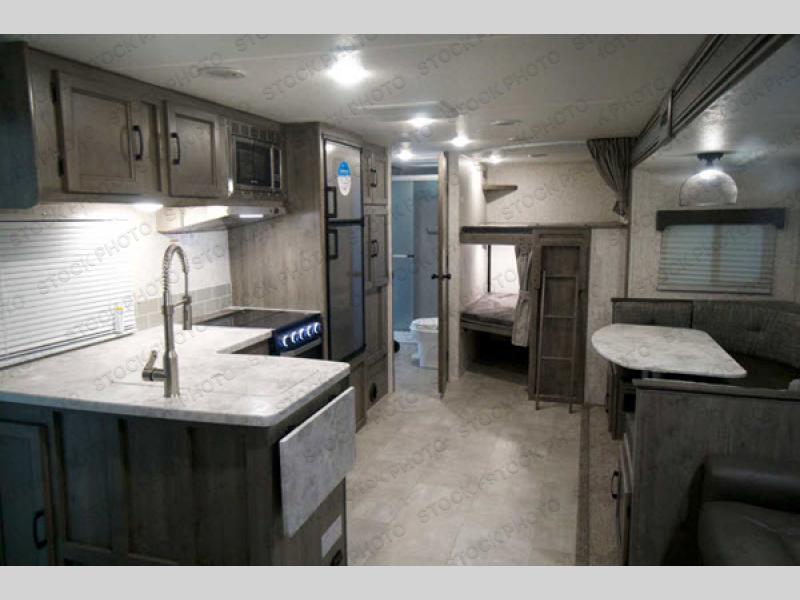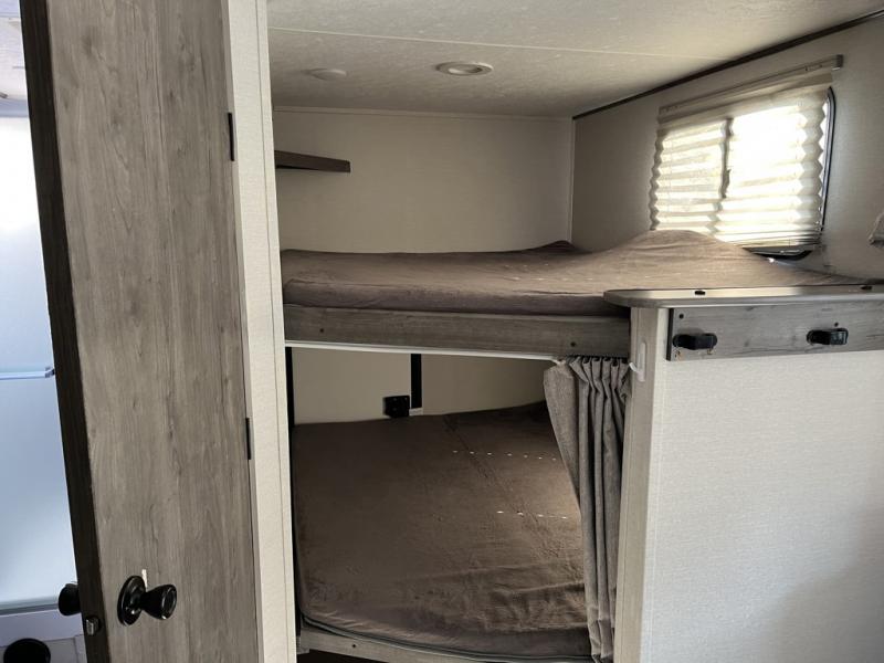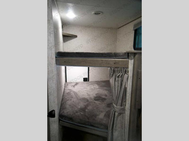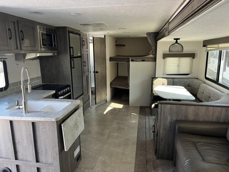 Your family will love everything about this travel trailer, from the double bunk beds for the kids, to the front private bedroom for mom and dad, plus dual entry doors for a smooth flow of traffic. Gather around the U-shaped dinette for game night, relax on the sofa with a good book, or head outdoors to sit under the 20' power awning. There is even an exterior camp kitchen where you can grill up hot dogs and burgers. This model also includes plenty of storage space, including dual wardrobes in the bedroom, a pass-through compartment, plus additional outside storage for your tools or yard games!
