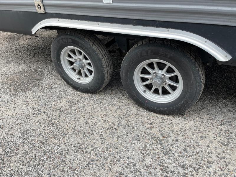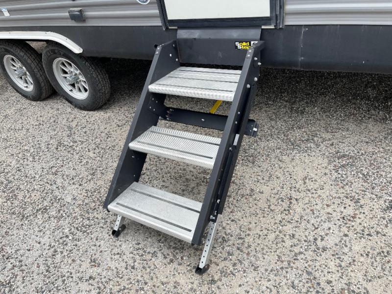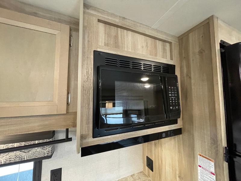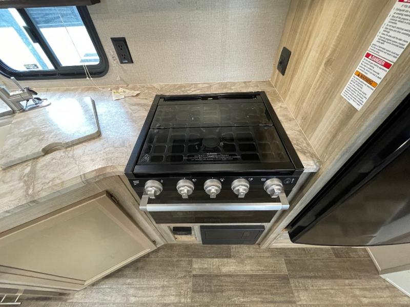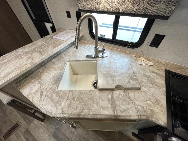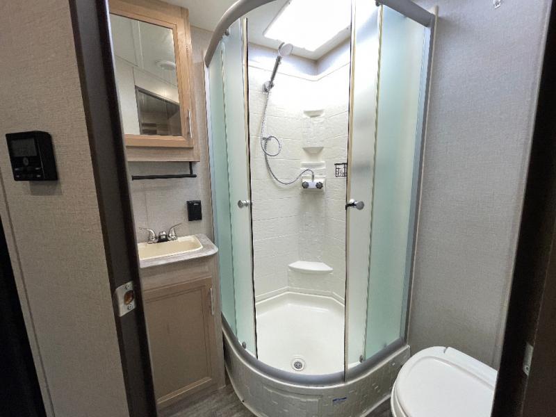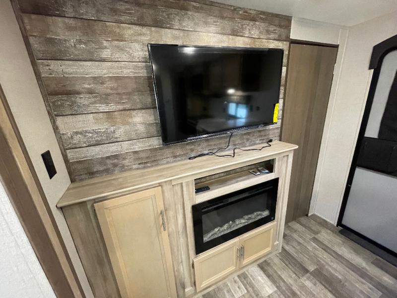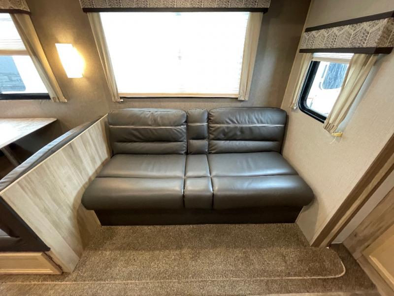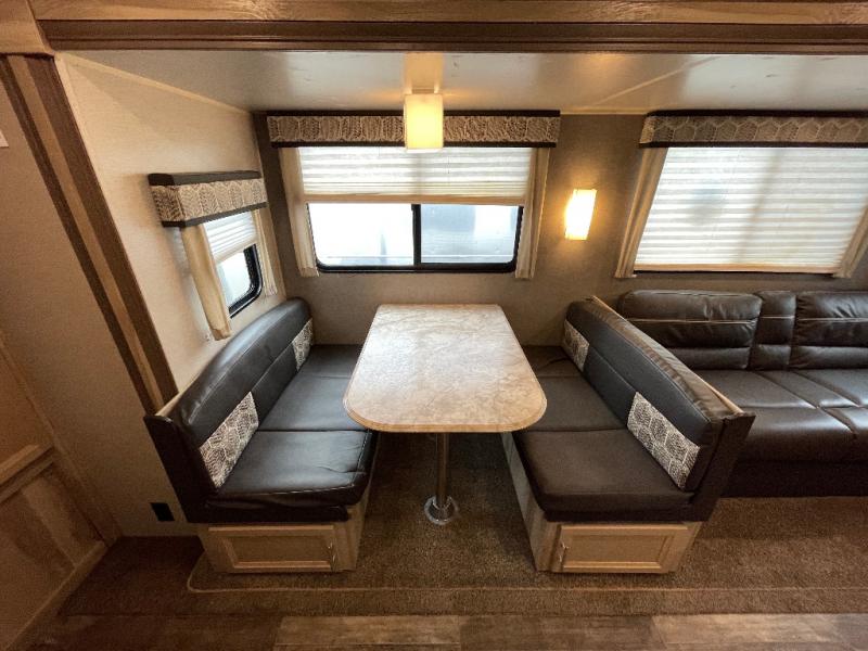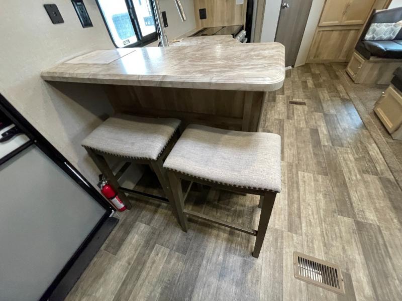 This popular couple's trailer provides a full-size super slide with a dinette and sofa, extra-large pantry/wardrobe storage, and a breakfast bar with optional stools. The full bathroom is spacious thanks to the radius shower and offers privacy for your guests. You can take turns cooking with full kitchen amenities, while the other watches the all-in-one entertainment 32" TV with independent dual zone control, or relax under the 15' power awning. And when it's time to sleep, the private front bedroom offers a walk-around queen bed and lots of storage. You can even tow this trailer with your half-ton truck thanks to the towing weight and length.