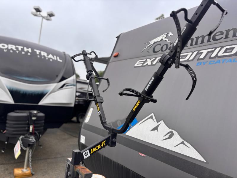 It's time to go off-grid with this Catalina Expedition travel trailer without leaving your comforts behind! You'll love the versatile Murphy bed because you can just fold it up during the day and relax on the sofa. The chef of the family can prepare breakfast on the three-burner range, and the milk and eggs can go back in the refrigerator. The full rear bath also includes a tub/shower and a linen closet allowing you to stay refreshed for whatever is next on your adventure. You will appreciate the outside storage for your gear, the outdoor shower to clean off the dirt, and the bicycle carrier when towing and setting your bikes out of the way. You might even like to add the optional kayak carrier on the roof.