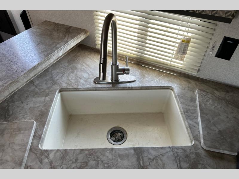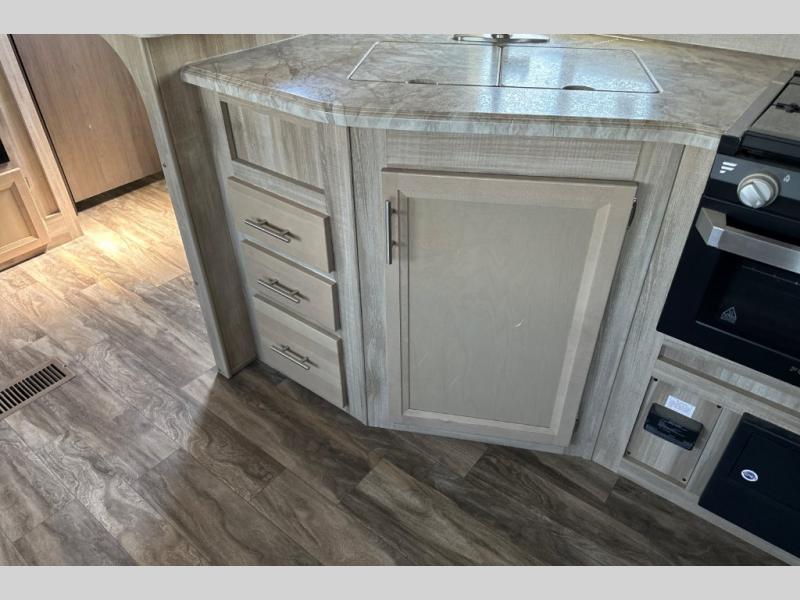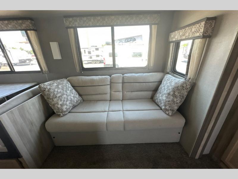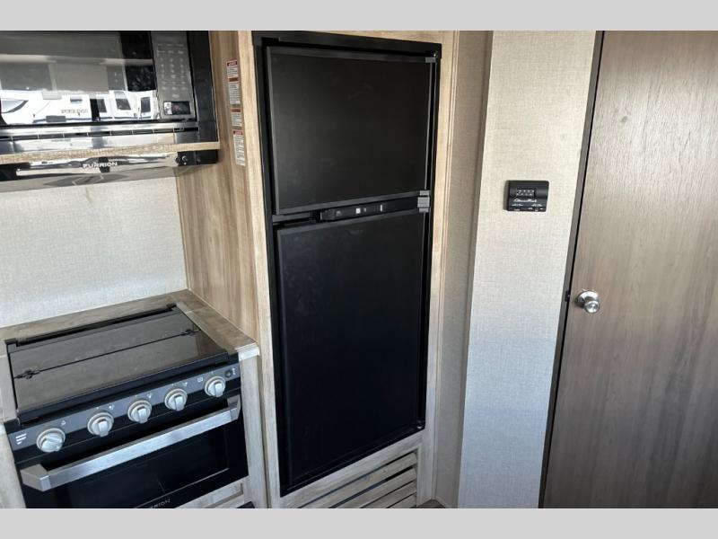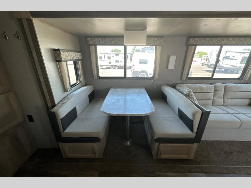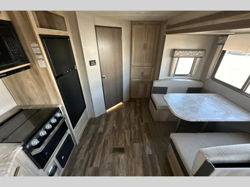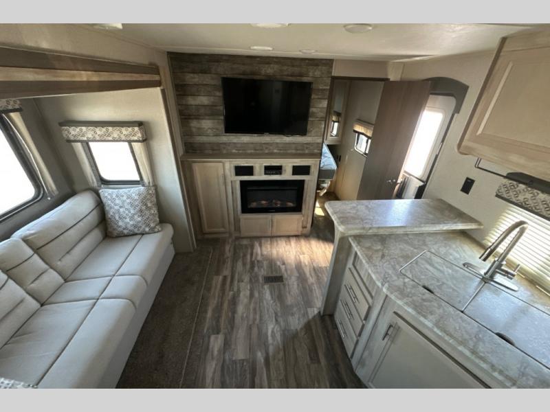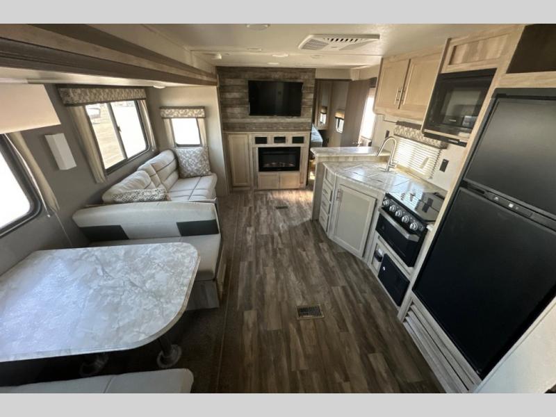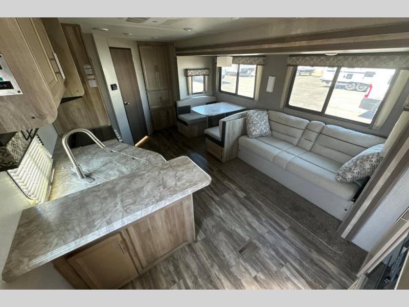 This popular couple's trailer provides a full-size super slide with a dinette and sofa, extra-large pantry/wardrobe storage, and a breakfast bar with optional stools. The full bathroom is spacious thanks to the radius shower and offers privacy for your guests. You can take turns cooking with full kitchen amenities, while the other watches the all-in-one entertainment 32" TV with independent dual zone control, or relax under the 15' power awning. And when it's time to sleep, the private front bedroom offers a walk-around queen bed and lots of storage. You can even tow this trailer with your half-ton truck thanks to the towing weight and length.