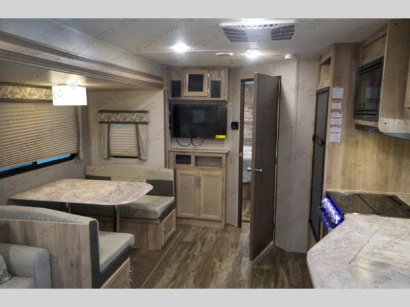 Whether you are couple that enjoys relaxation or a family that seeks adventure, this trailer will sleep at least four when you utilize the sofa and booth dinette. You and your spouse will have their own walk-around queen bed to sleep in privacy as well as have access to the outside with your own exterior entry. When you are outside grab your camping chairs from the pass-through compartment and relax under the electric awning. When you are hungry, the cook can make warm meals with full amenities inside and the 10 cu. ft. refrigerator will hold the beverages and leftovers. There are many more features that will make you want this one, step inside!