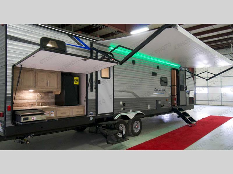 The Catalina Legacy Edition travel trailers by Coachmen RV are constructed with a cambered structural steel l-beam frame, a seamless Alpha roof membrane, full length frame E-coated outriggers, fiberglass insulation throughout, and an enclosed, fully sealed underbelly for four seasons of traveling. Along the exterior you will find a flip-down Cargo rack with 200 lb. capacity, a power awning with multi-color LED lighting and a remote, two JBL Elite speakers, a battery disconnect switch on the A frame and an LP quick connect port. The interior offers seamless Thermofoil countertops throughout, an under-mount farm style sink, a slim line range hood, and Congoleum Woodplank linoleum flooring for style and durability. Choose your favorite today and enjoy comfort and style where ever you decide to camp!