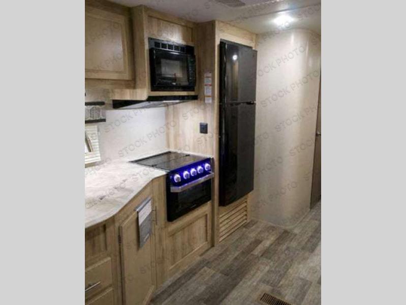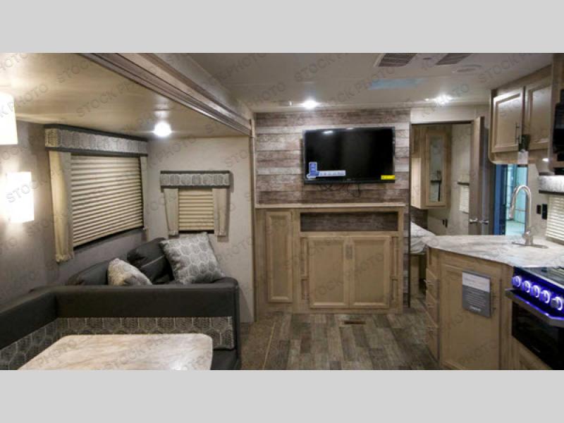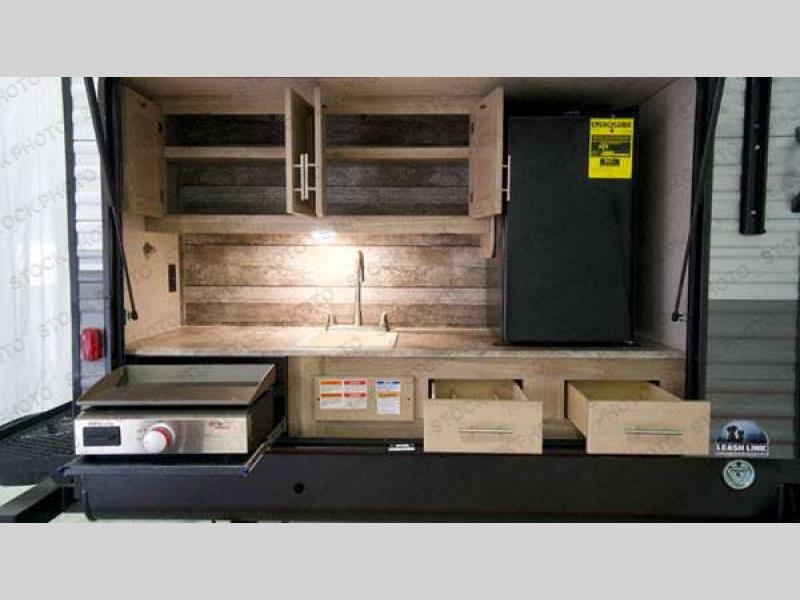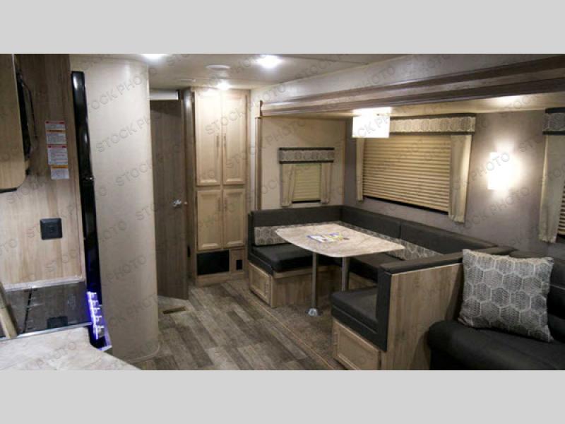 A larger family will love all the space in this trailer with a slide out in the bunkhouse and a second slide out in the main living area! The kids will claim their own bunk bed or COA cube futon to sleep on at night and they will find storage fro their things in the wardrobes and cabinets. You will have dual wardrobes in the private bedroom on the opposite side, and your own walk-around queen bed. The outside full-size camper kitchen might be one of your favorite features or maybe its the 21' electric awning with the choice of LED lighting color to keep the party going into the night. On the chilly evenings, hang out inside at the U-shaped dinette or sofa and watch the 39" LED TV with dual zone entertainment sound bar and optional fireplace. And the inside kitchen has full amenities.