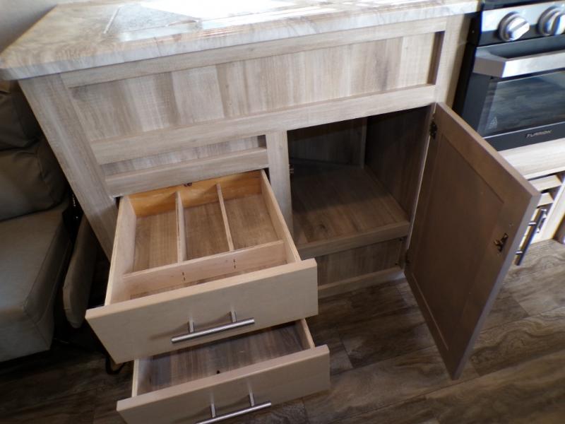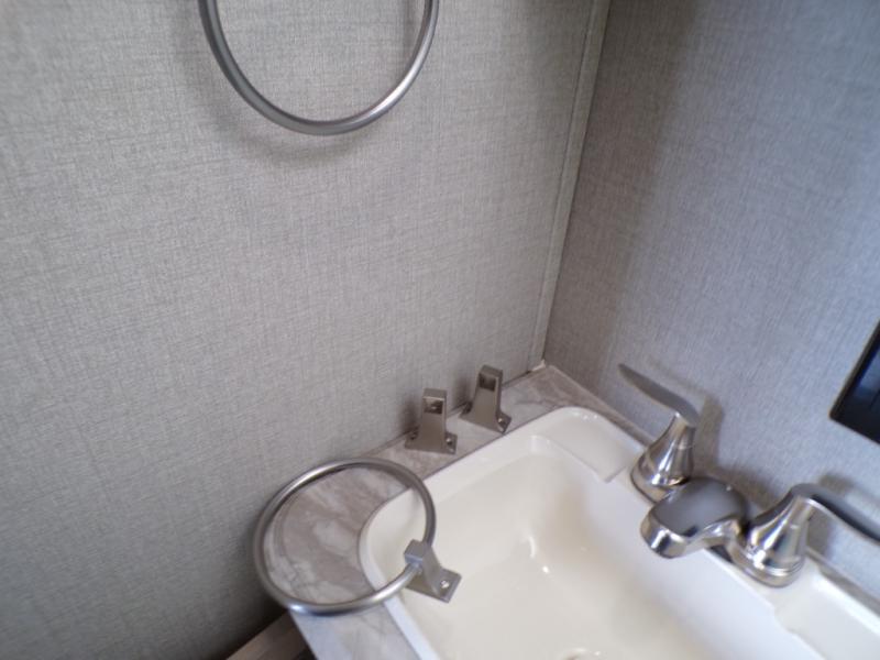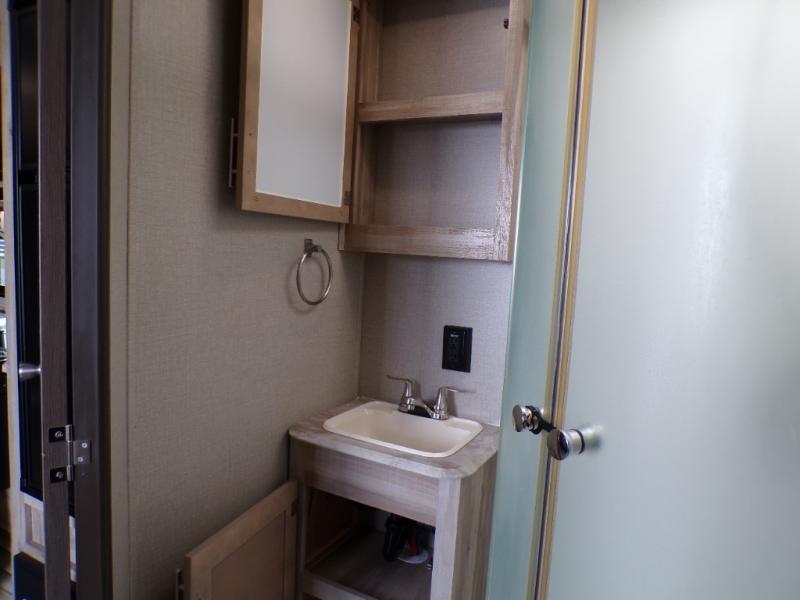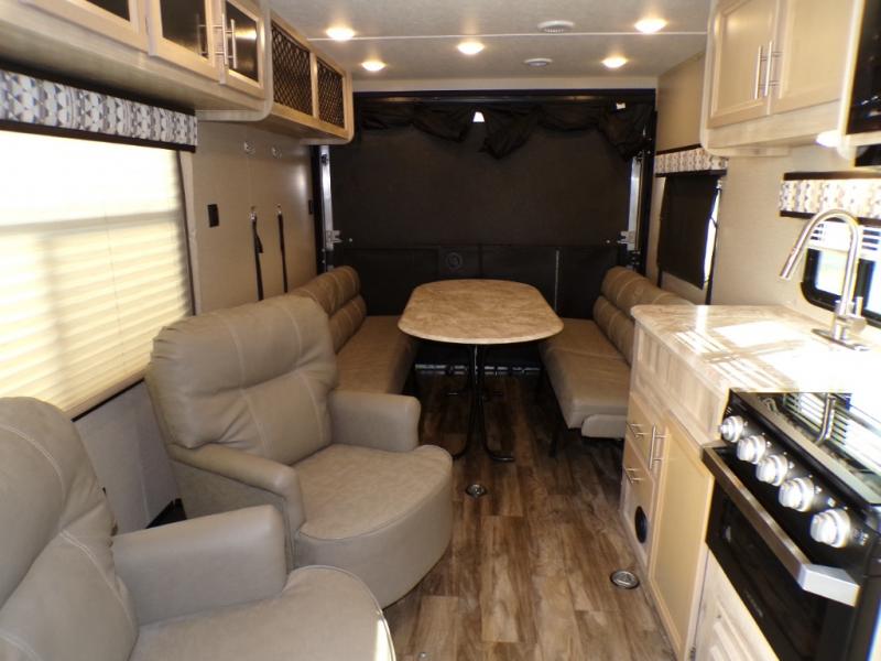 There are many reasons that you will want to own this Catalina Trail Blazer toy hauler, but one of those reasons is the great walk-through bathroom! Since there are entry doors on either side of this bathroom, you can access it from the main living area as well as from the front private bedroom. There is also a little bit of extra space in the bathroom since it spans the width of the trailer, and the shower skylight keeps this area bright. You'll definitely be spending most of your time out on the trails riding your bikes or out on the lake paddling your kayaks, but when you do come back inside this trailer, you will be met with two lounge recliners and two fold-down sofas with a dinette table in between so that you can just relax and recharge.