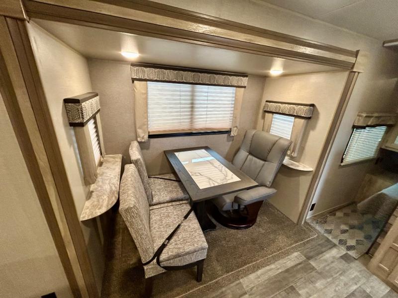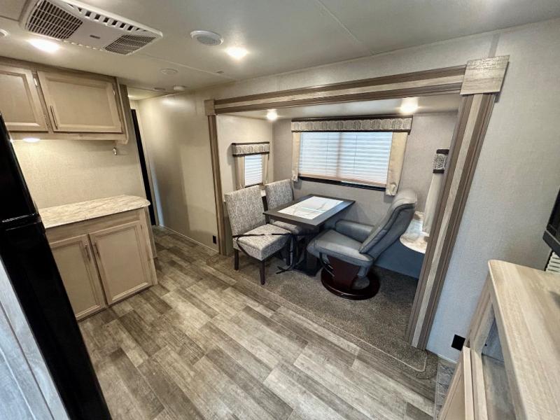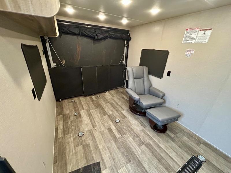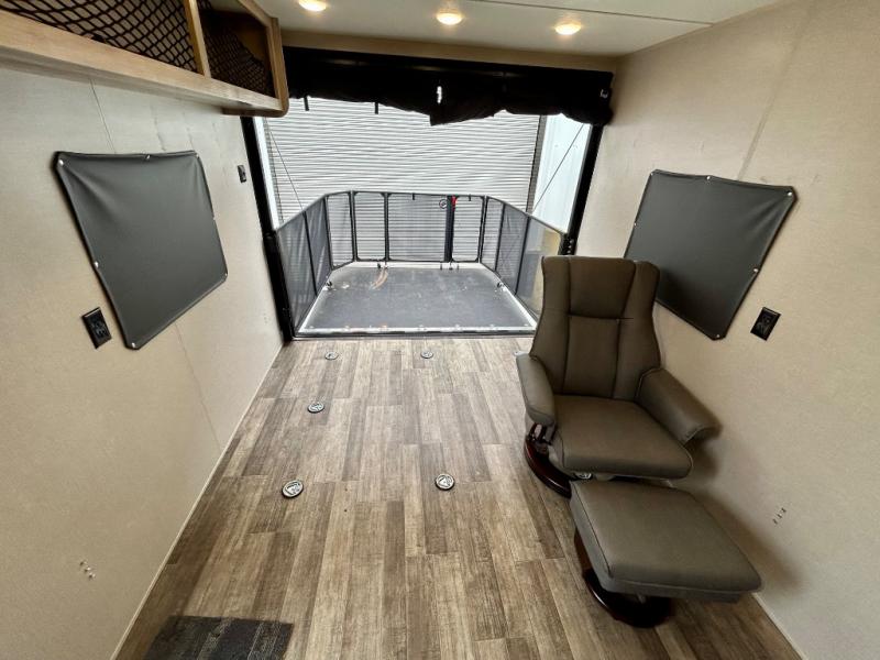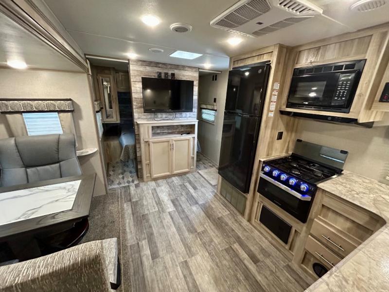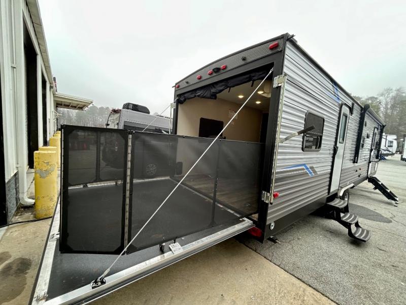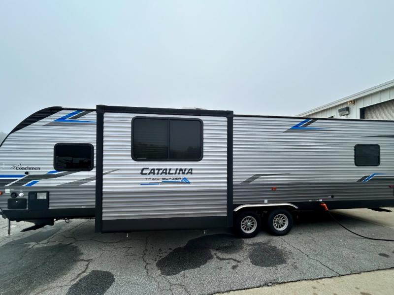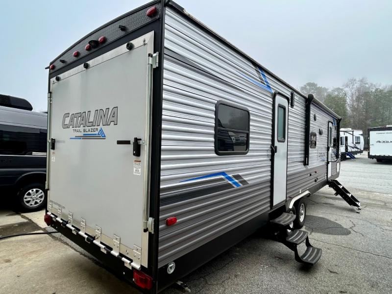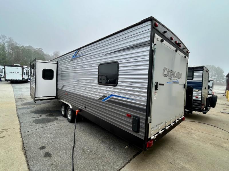 The Coachmen Catalina Trailer Blazer toy hauler puts the fun in functional! Not only do you have the convenience of an excellent toy hauler, but you also have an abundance of amenities within the trailer itself. With a long list of interior features, there isn't much that has been left out, and the exterior features are also desirable, plus there are new 2021 features added. You will find a power awning with multi-color LED lighting and a remote, an upgraded graphics package, an all-in-one entertainment TV with an independent dual zone control, upgraded JBL Elite exterior speakers with LED lighting, magnetic baggage door latches, and an enclosed and fully sealed underbelly. The interior offers you new linoleum flooring, bedrooms USB surface mounts, an upgraded slim design range hood, an all-in-one monitor panel system, and under-bed storage. Plus, if you choose to add the optional party deck to your unit, you can have endless summer gatherings.