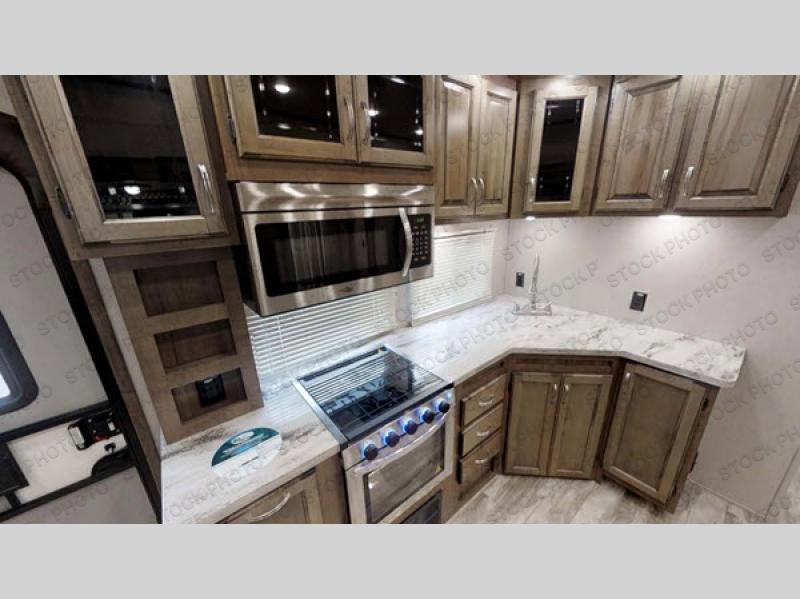 This five slide out and unique dual entry Chaparral will be the talk of the campsite each time you get away. Having a separate living area with a full wall entertainment center and plenty of seating with two tri-fold sofa slide outs and theater seats will make this a popular spot inside. Near the bathroom there is a second entry door on the opposite side of the main entry which makes it easy to access the bathroom or the rear bedroom. The bedroom offers a queen bed slide or you can choose an optional king, and a slide out wardrobe with drawers, plus there is a second wardrobe that has been prepped for a washer and dryer option. And the separate kitchen offers all the amenities needed to make a holiday meal and you can dine together at the free standing table with four chairs, plus there is a handy closet and two pantries, and more storage.