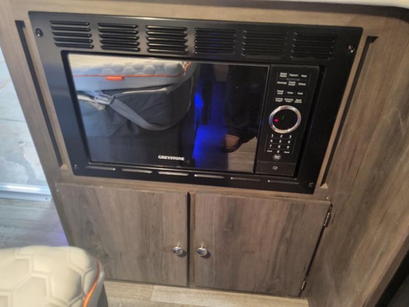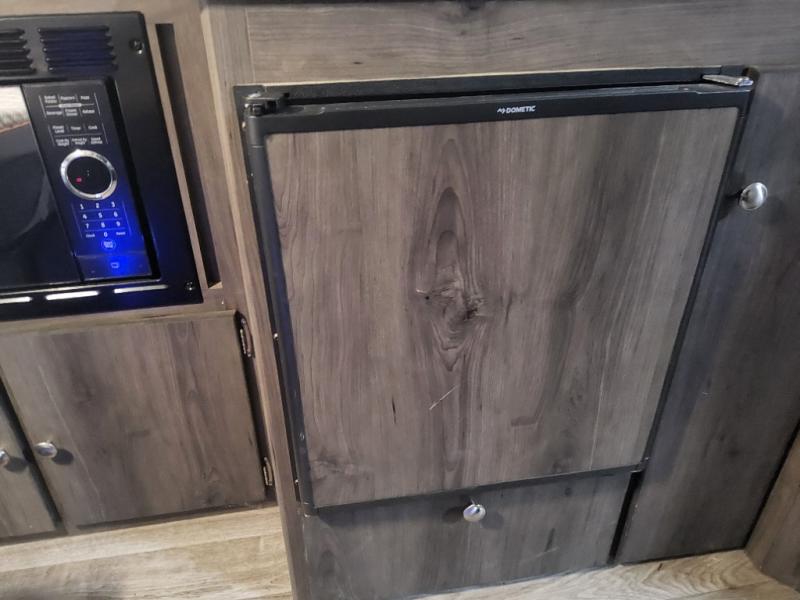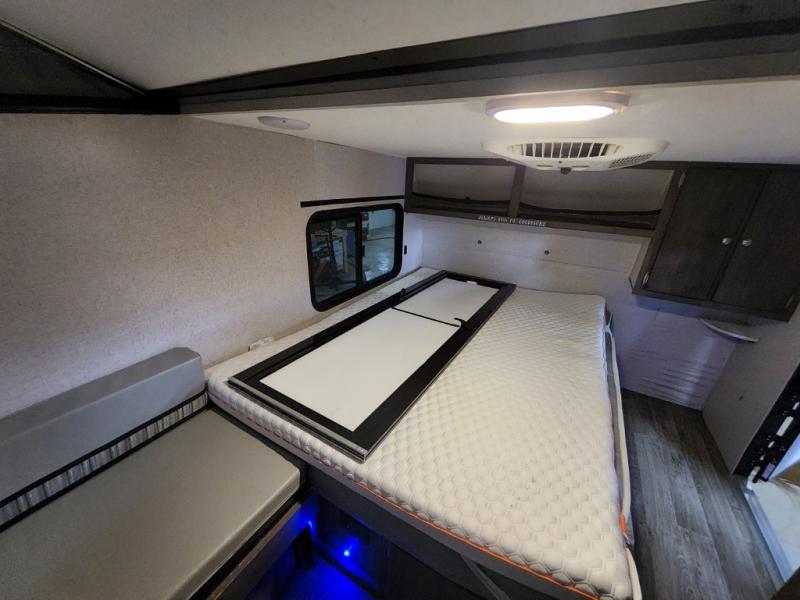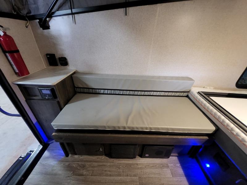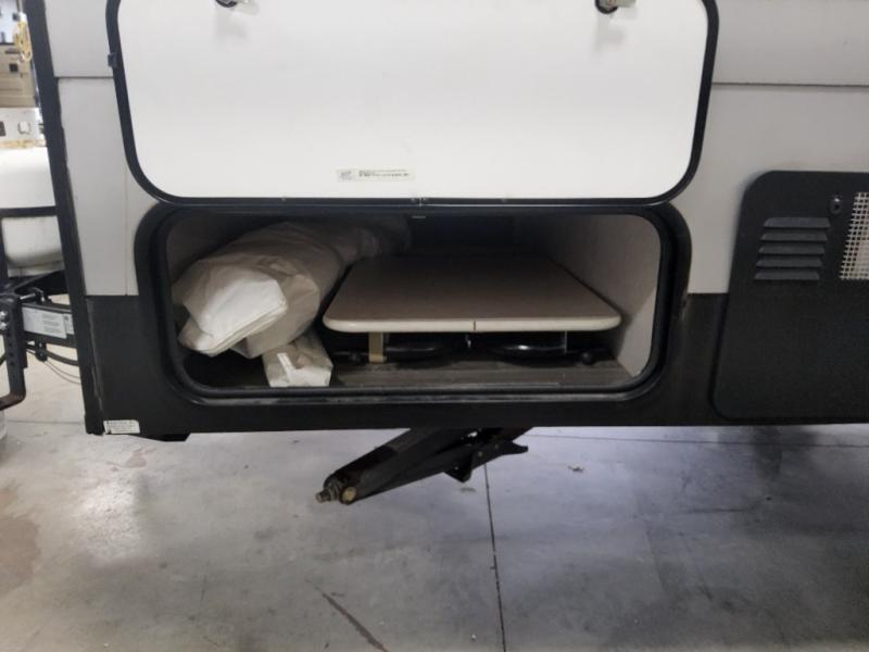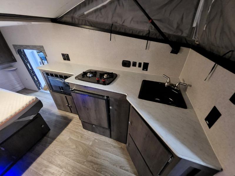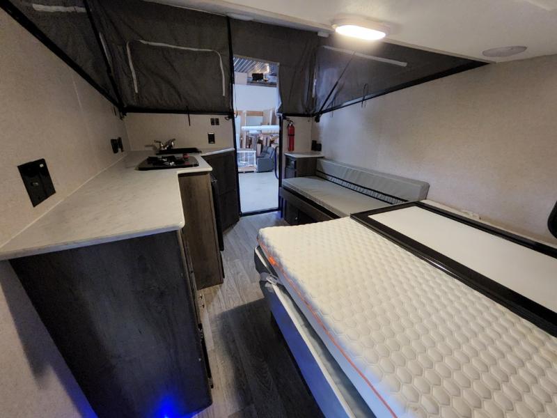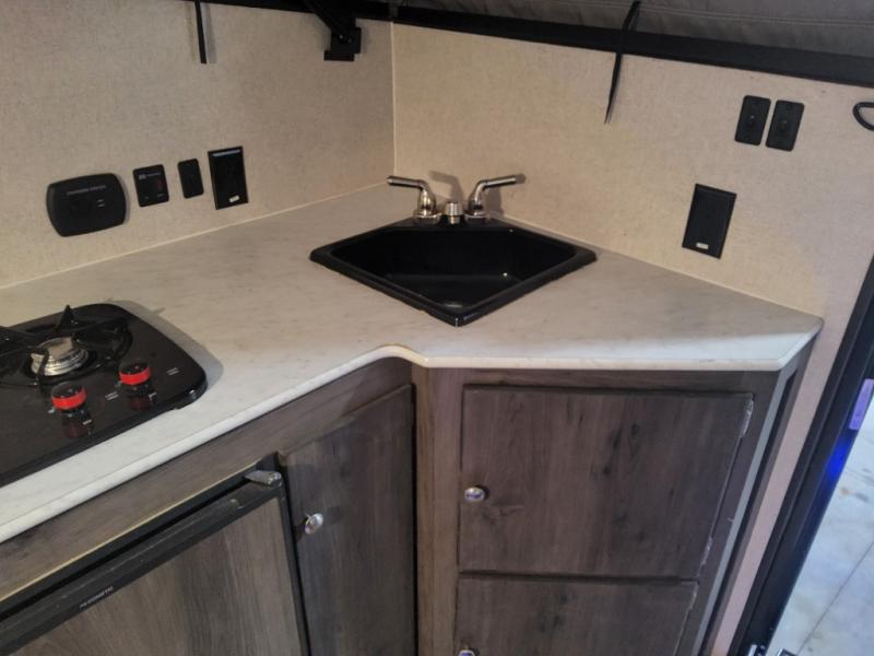 Last minute plans to explore the outdoors can happen with this camper! Even when you are headed to the campsite, you might need to get to something from inside the camper at a stop. Just use the side bike door without having to raise the roof. You and your spouse will have a full size bed to sleep on and the sofa might even accommodate one more person. You can make warm meals on the two burner range, wash dishes and brush your teeth using the sink, and store leftovers in the three-way refrigerator underneath. You might even like to add the optional Off-Road package providing 15" off-road tires and a spare, extended frame jacks, and off-road lifted axles, and/or more options like an air conditioner, an exterior wall mount LP grill, or "Toylock" cargo security system.