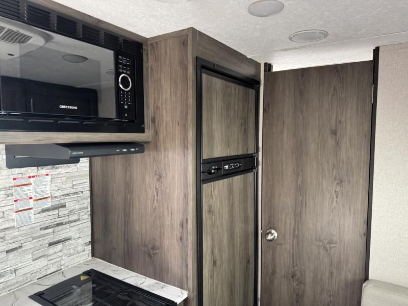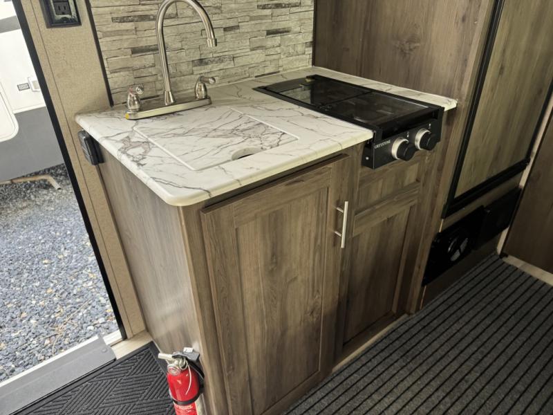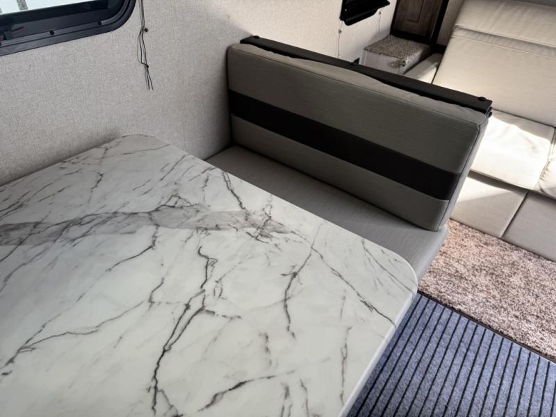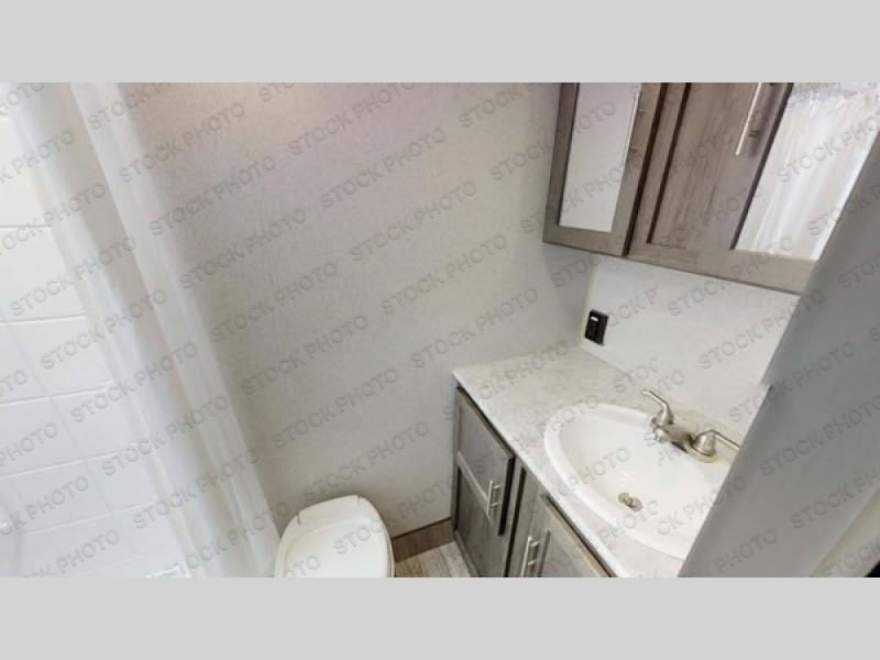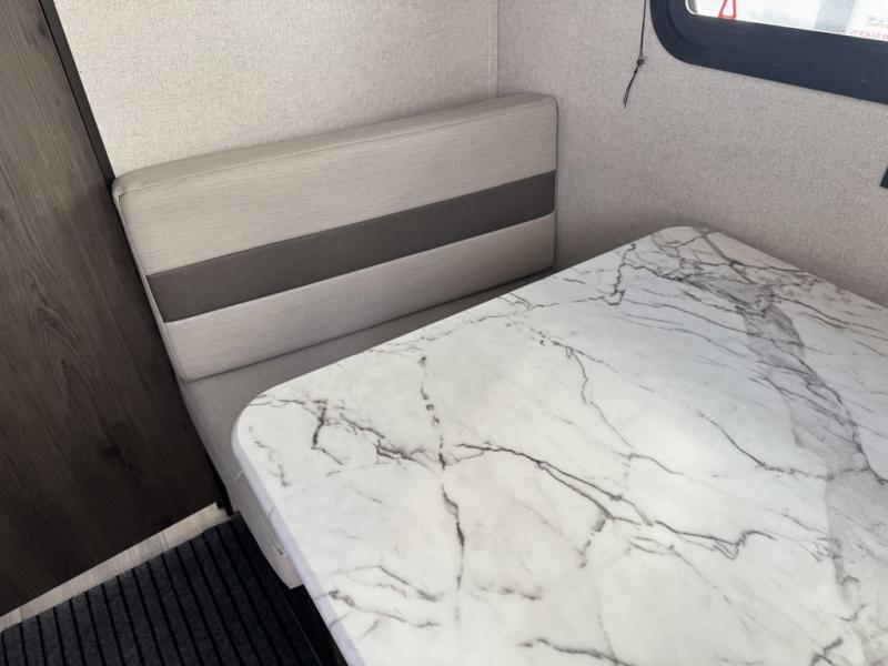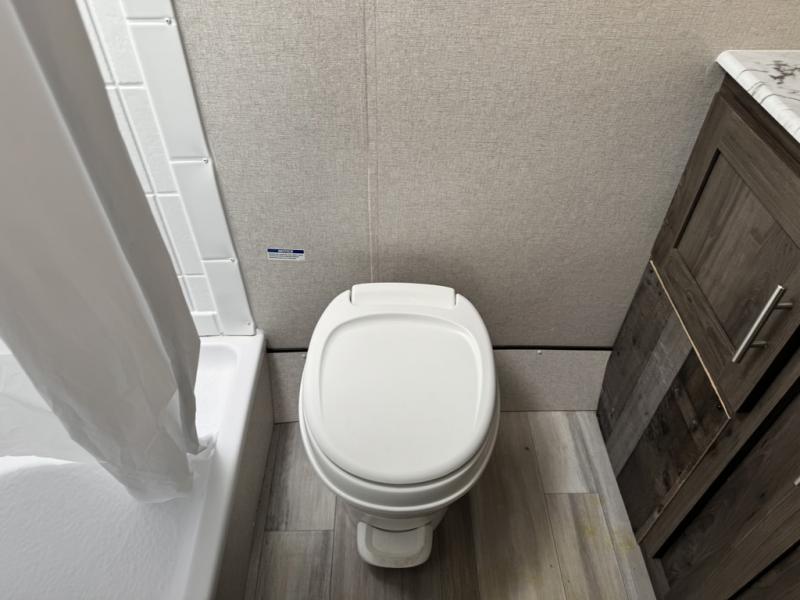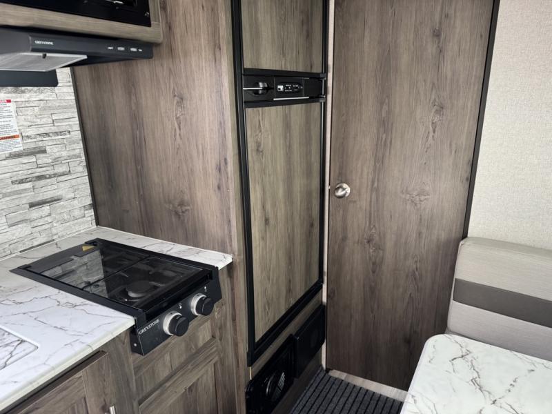 The rear bathroom in this Clipper Ultra-Lite travel trailer has everything you need to start each morning clean and fresh! With a two-burner stove and a 7-cu. ft. gas/electric refrigerator, you can whip up any delicious meal. Once you have prepared it, you can head to the booth dinette and enjoy eating it there comfortably, plus it can transform into an extra sleeping space. The front RV queen bed welcomes you to a good night's rest, but if you're not ready to head to bed quite yet, then you can relax outside underneath the 12' power awning with LED lights and exterior speakers!