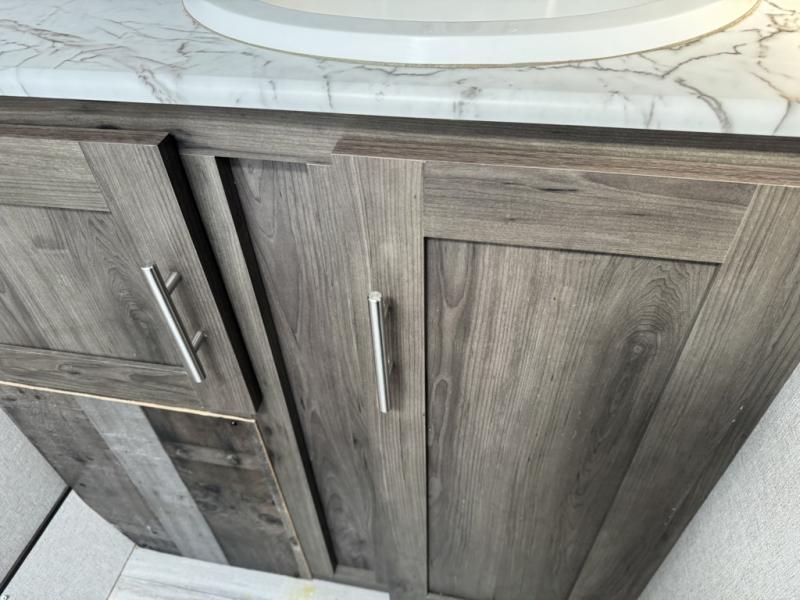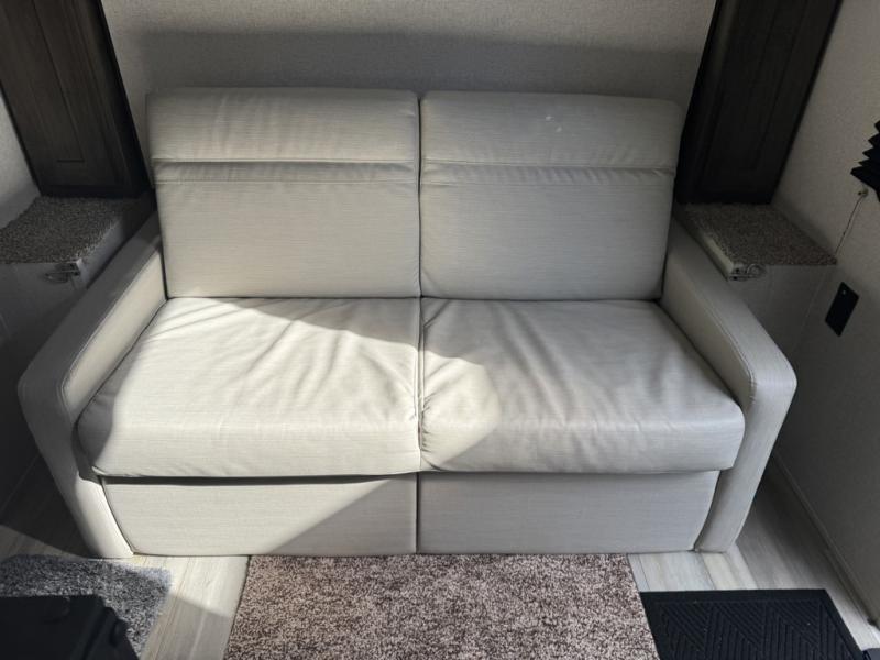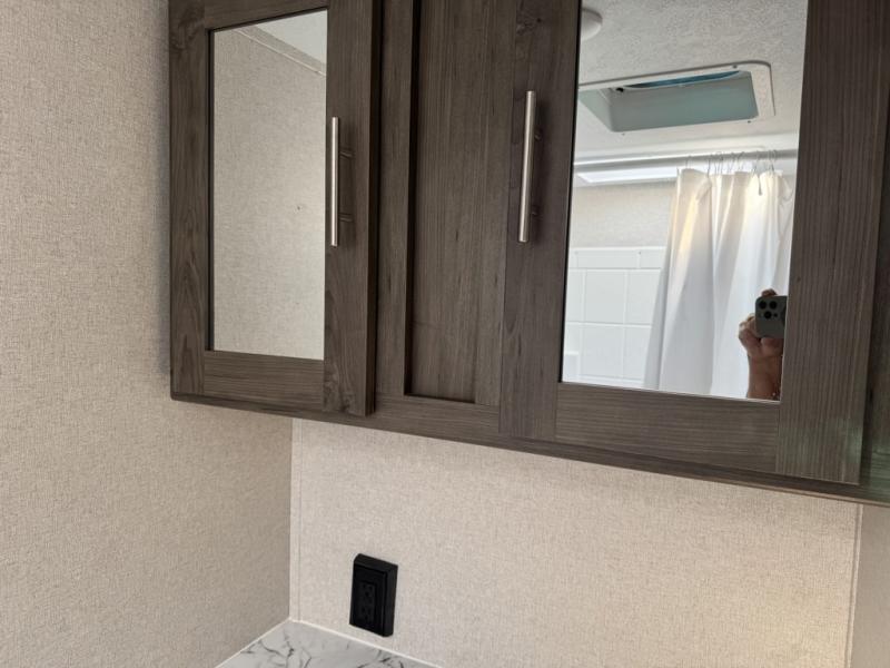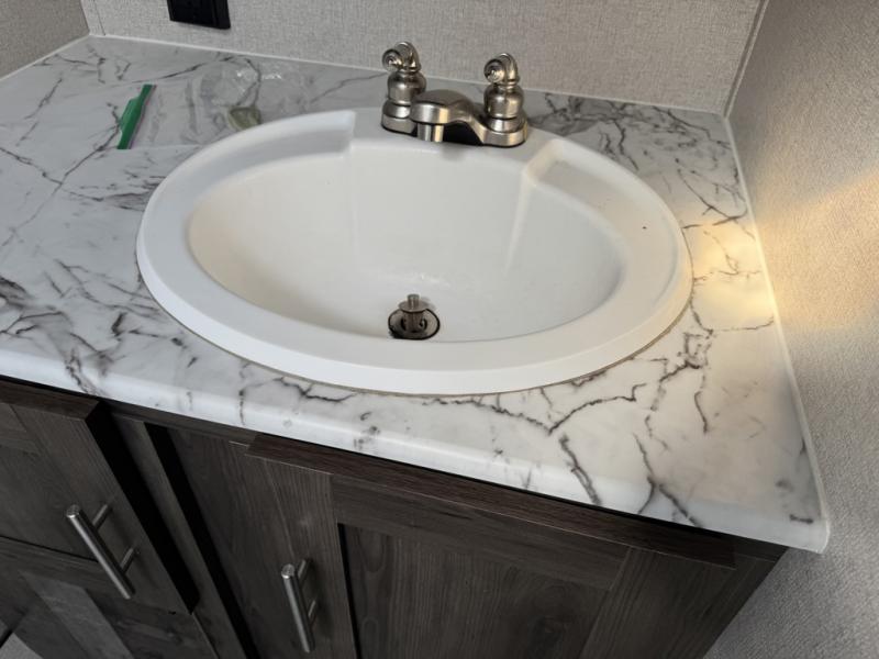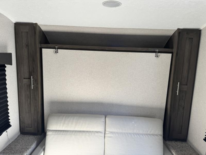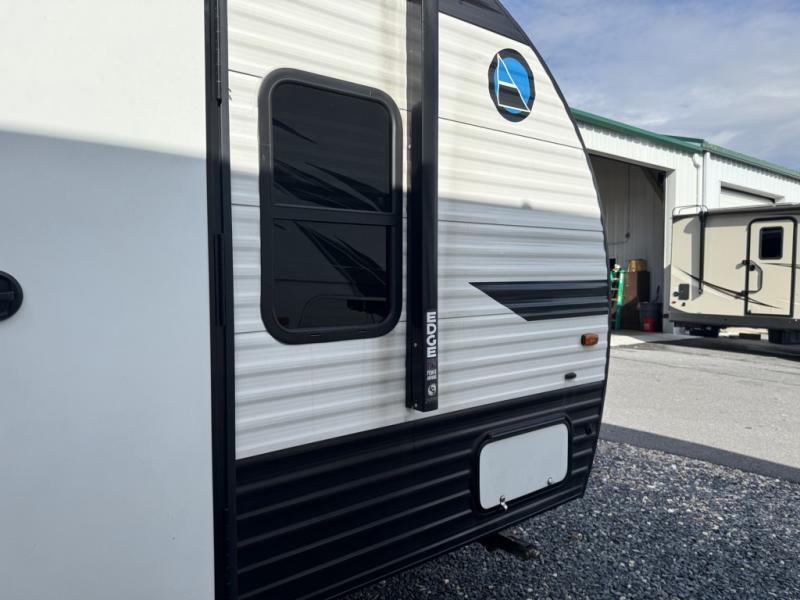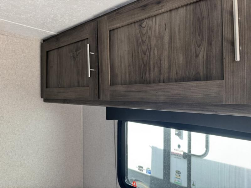 The rear bathroom in this Clipper Ultra-Lite travel trailer has everything you need to start each morning clean and fresh! With a two-burner stove and a 7-cu. ft. gas/electric refrigerator, you can whip up any delicious meal. Once you have prepared it, you can head to the booth dinette and enjoy eating it there comfortably, plus it can transform into an extra sleeping space. The front RV queen bed welcomes you to a good night's rest, but if you're not ready to head to bed quite yet, then you can relax outside underneath the 12' power awning with LED lights and exterior speakers!