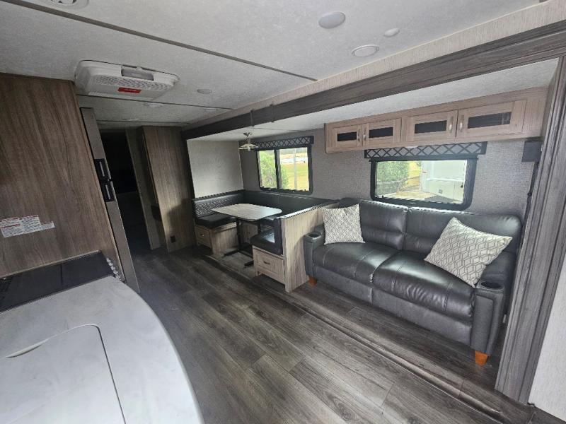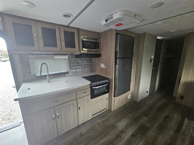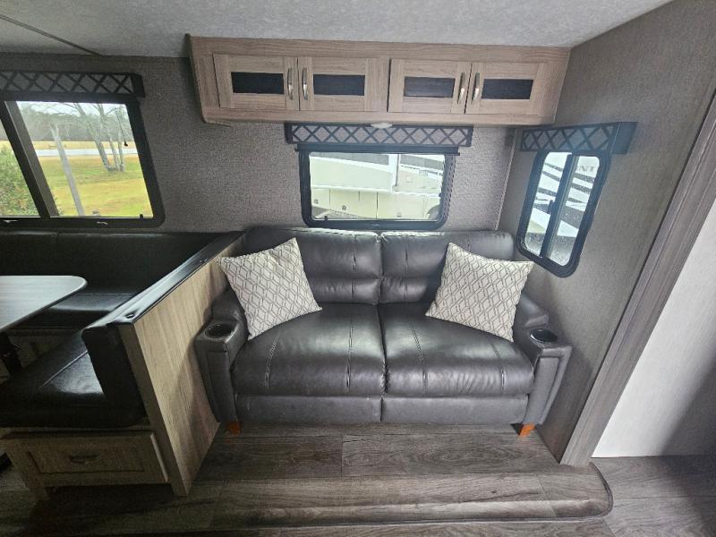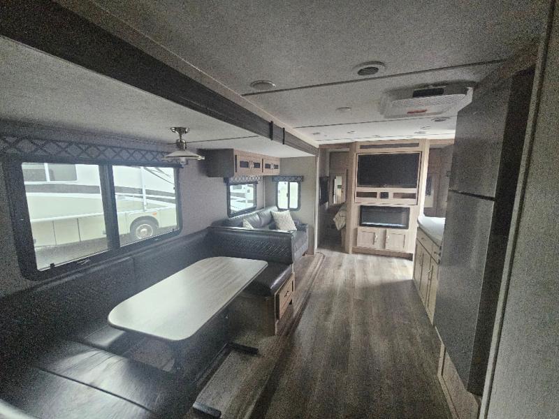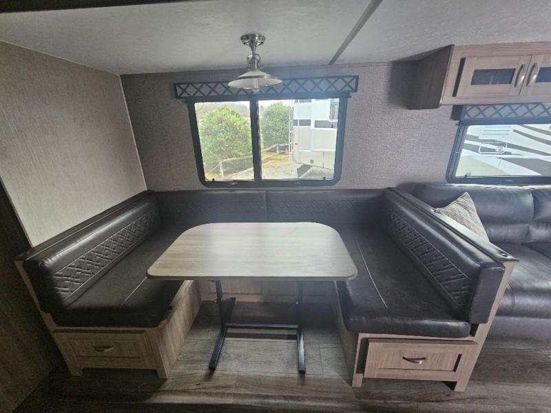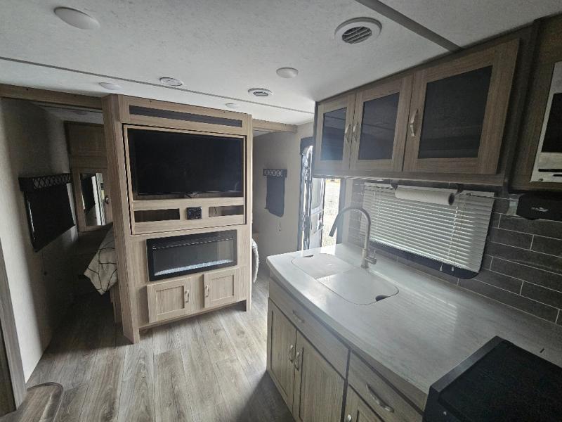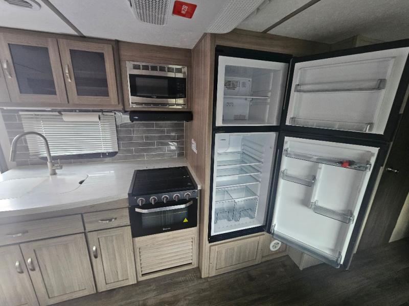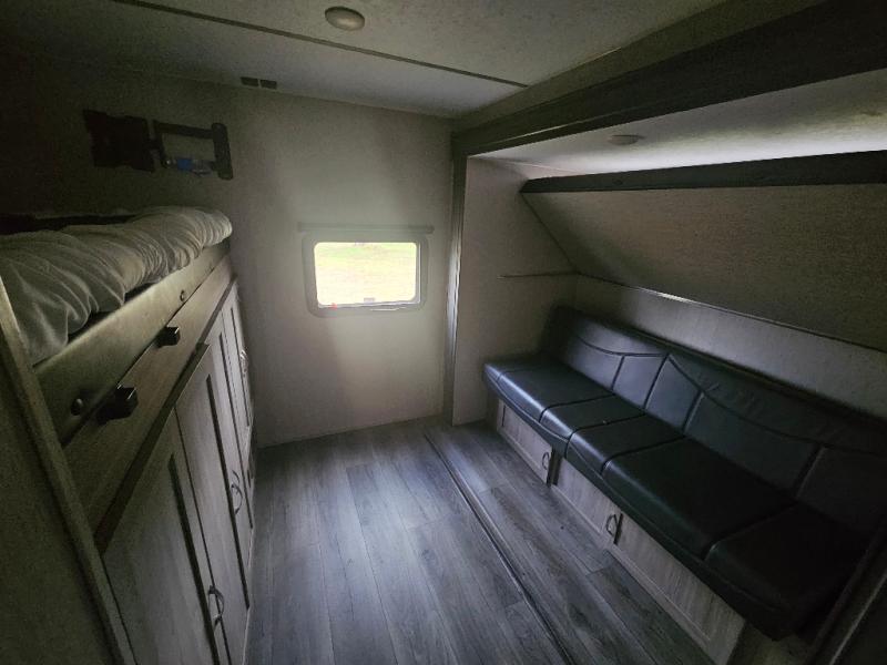 Whether you enjoy cooking inside or outside, you will be able to choose where you cook each time with this Freedom Express Liberty Edition travel trailer! This trailer has an exterior camp kitchen and an interior kitchen with a double-door refrigerator, an oven with a glass-top stove, and a microwave. The kids will claim the bunkhouse for themselves to play games at the table while sitting on the J-cube sofa or even on the floor with the extra space provided by the slide out. The main living area offers furniture to dine, visit, and sleep on, plus a fireplace for those chilly nights. And the USB ports in the bedroom and bunkhouse will keep the phones charged and ready for the next adventure.