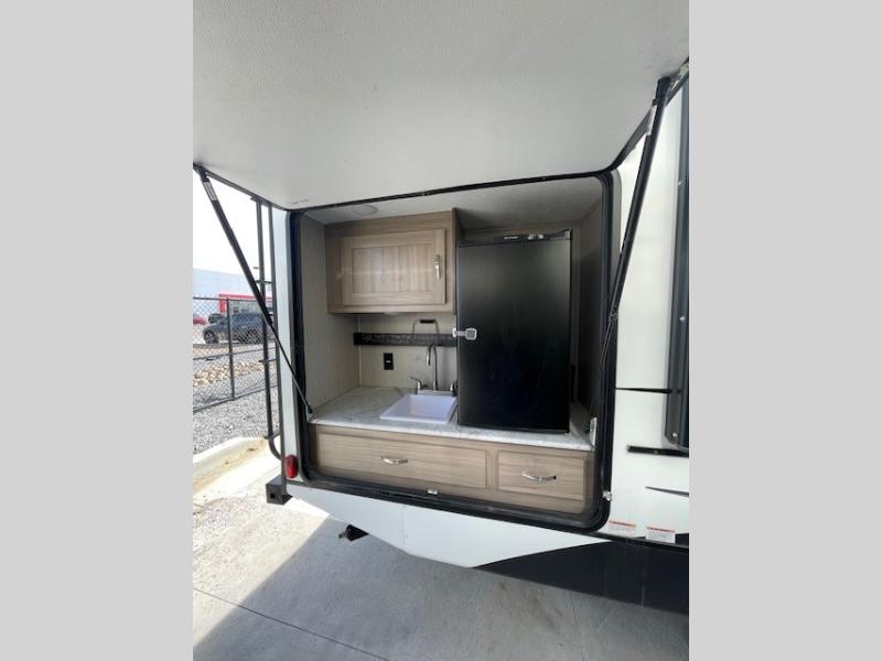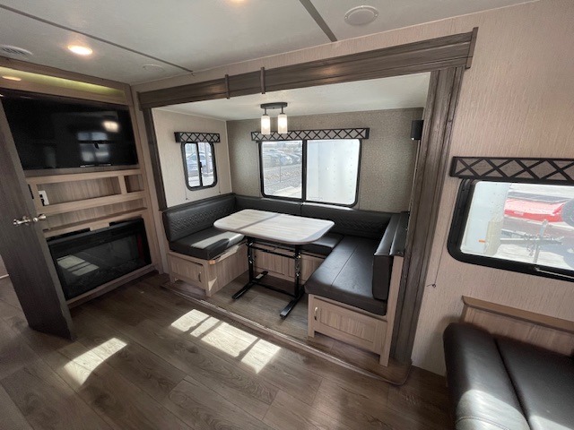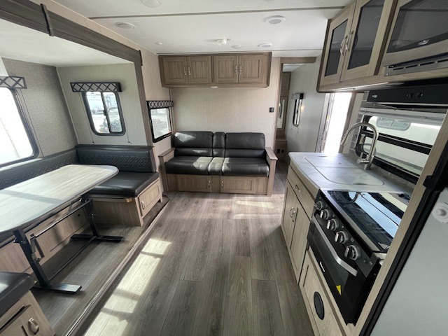 This Freedom Express Ultra Lite travel trailer allows you to relax like you do at home with more interior space thanks to the slide out in the living area. You'll appreciate the front private bedroom with a queen bed and wardrobes for your clothes. The kids can make their beds either on the U-shaped dinette or the sofa once folded down for the night. This unit features a full rear bath with a 32" radius shower and a linen closet for towels. If you enjoy cooking outdoors, then imagine making dinner for everyone at the outdoor camp kitchen!