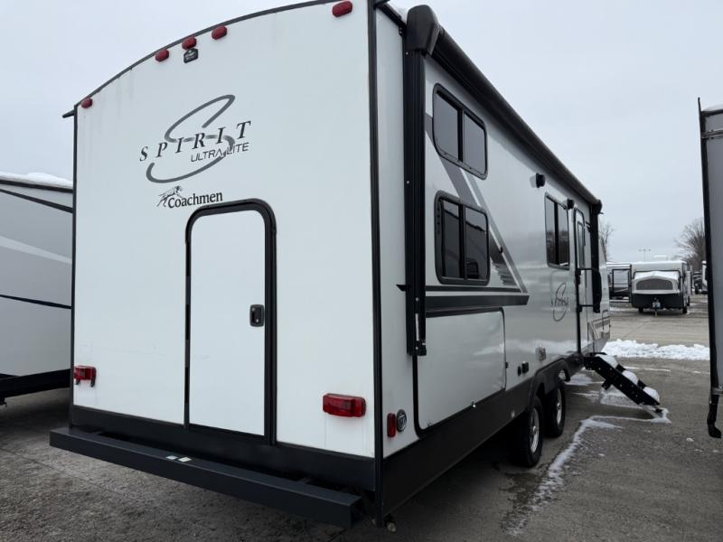 The Coachmen Northern Spirit Ultra Lite travel trailer is here to make your camping life simpler! No matter how small, even the tiniest details make all the difference, and these trailers come with a full list of features that will enhance every camping experience. Some of those features are the motion-activated floor lights, the lighted USB ports, the kid's convenience center, the exterior dog leash clip, the exterior fishing pole storage, and the wireless phone charger. These trailers have been prepped for Wi-Fi, cable/satellite, a back-up camera, and solar panels. The exterior dog wash is useful for rinsing your puppy off after spending an afternoon playing in the dirt and mud. The exterior speakers also present an afternoon of fun.