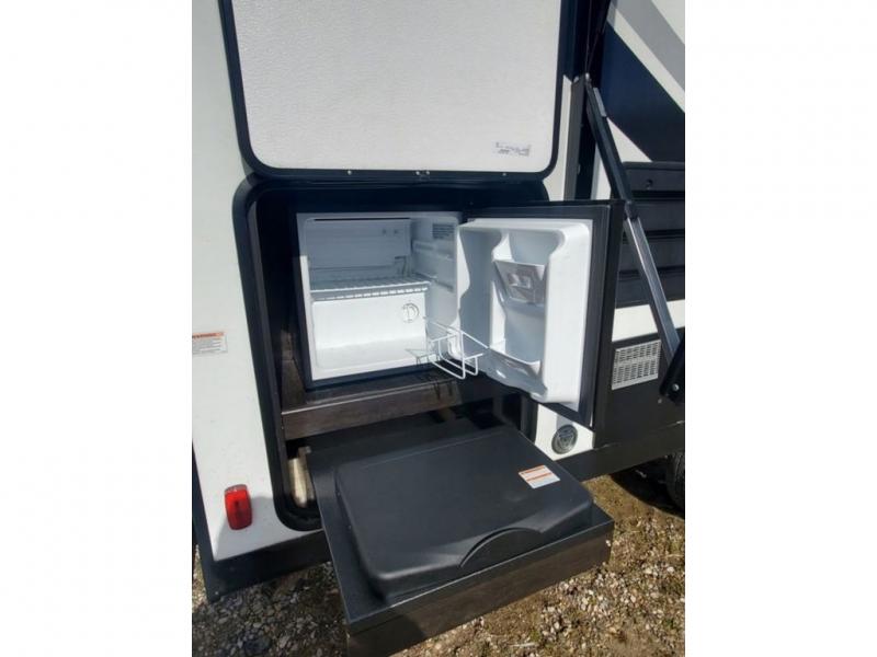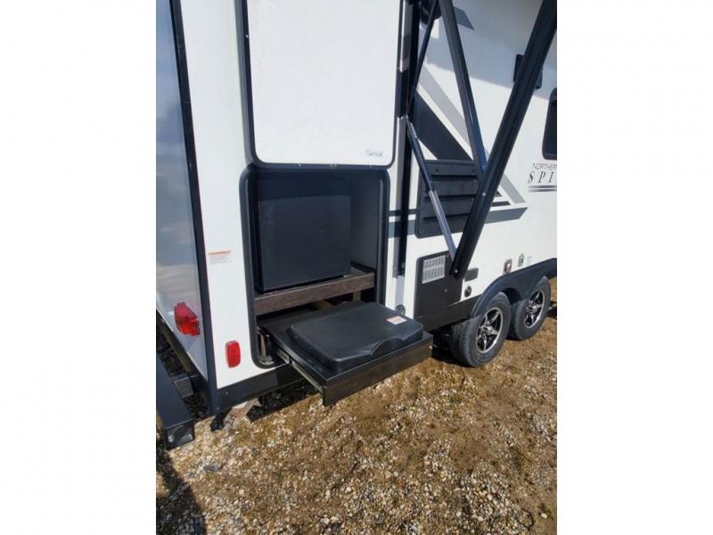 The Coachmen Northern Spirit XTR travel trailer is what makes camping so easy! You'll find great convenience having a 100W solar panel, and the exterior speakers and power awning create an inviting space to spend your time with other campers. Each model has a heated and enclosed underbelly, and there is a front rock guard to protect the exterior. There are a couple of features that will make you happy if you own a pet, like the exterior dog wash and the exterior dog leash clip, and the panoramic front window will provide you with an extra place to view your surroundings.