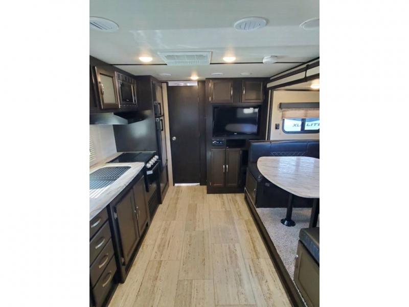 This Northern Spirit XTR travel trailer is the perfect unit for a family of four. Mom and dad will appreciate their own private bedroom, and the queen bed with Max Bed Storage can hold extra blankets or the luggage. Each morning, the kids can enjoy their breakfast around the U-shaped dinette before heading outside to play. This area at night can also be converted into convenient sleeping space. This model features plenty of storage space, including a pantry for snacks, an exterior pass-through storage for larger camp gear, and dual wardrobes in the bedroom.