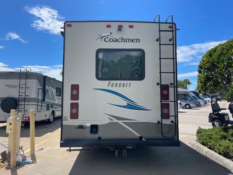 This Coachmen Pursuit motorhome is perfect for a family or group of friends up to eight individuals. You have a RV king bed in the rear private bedroom which also has access to the dual entry bath, a 68" sofa with storage, a booth dinette, and a drop down bunk above the cab. There are even bunk beds with a wardrobe the kids are sure to love! There are not only places for your family to sleep, but there are also plenty of places for storing their things while you are away on vacation. Plus, there is entertainment for everyone between the LED TV in the living room, the 32" LED TV in the bedroom, and the exterior LED TV!
