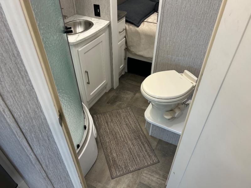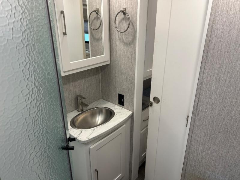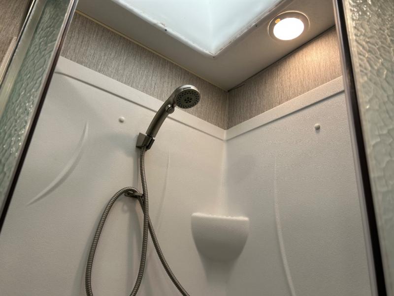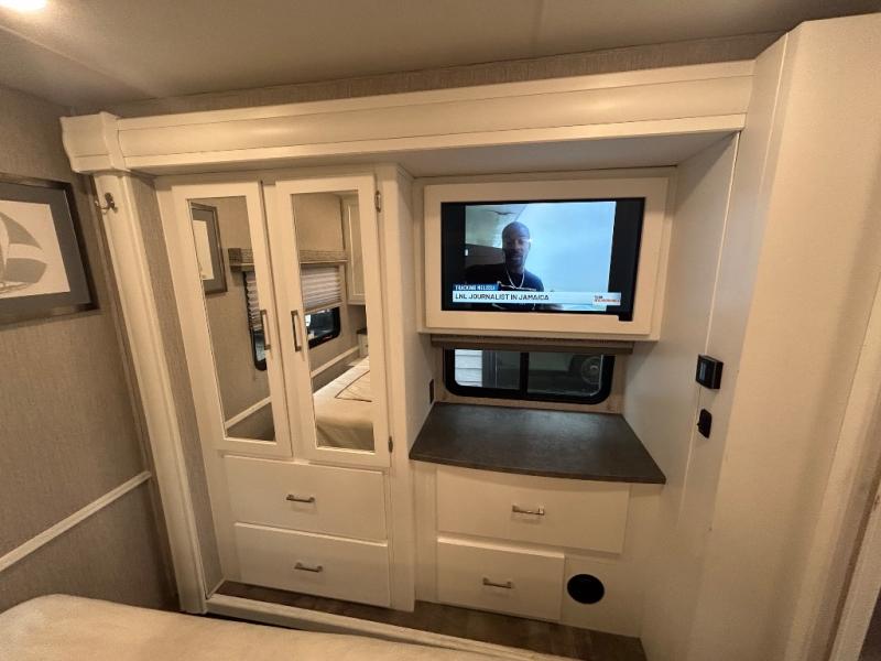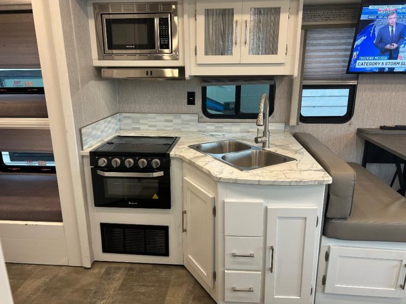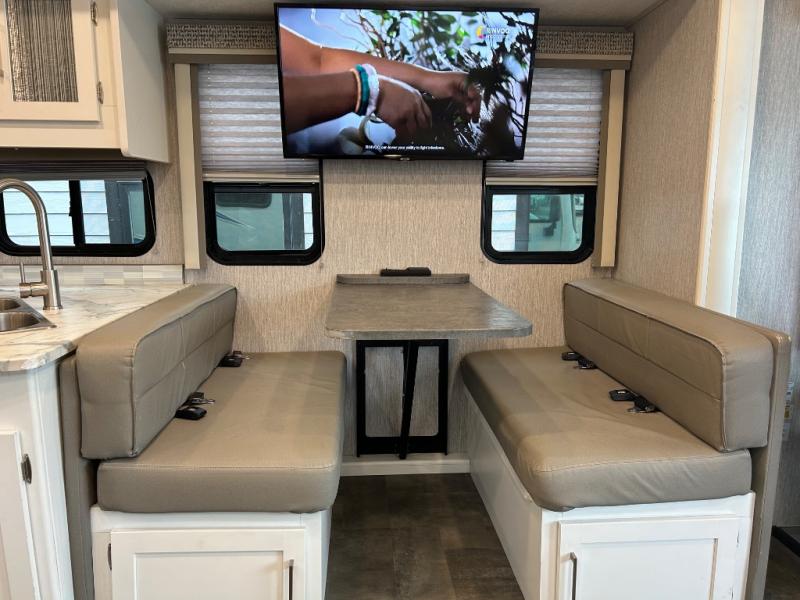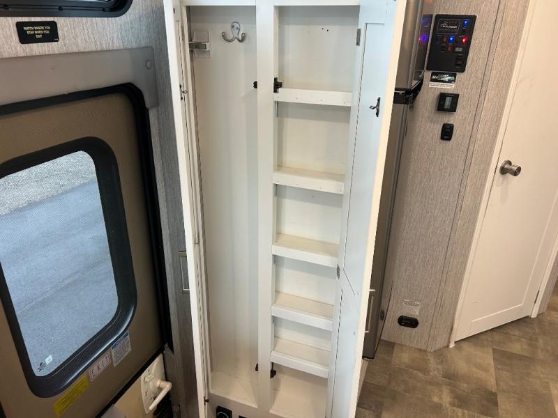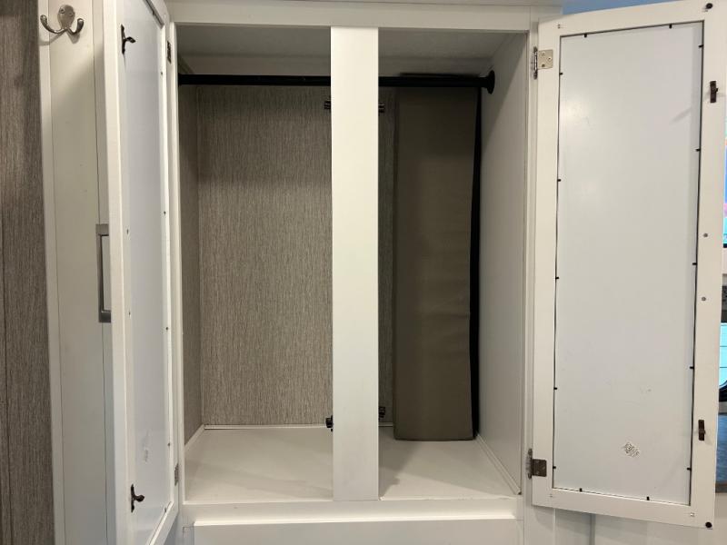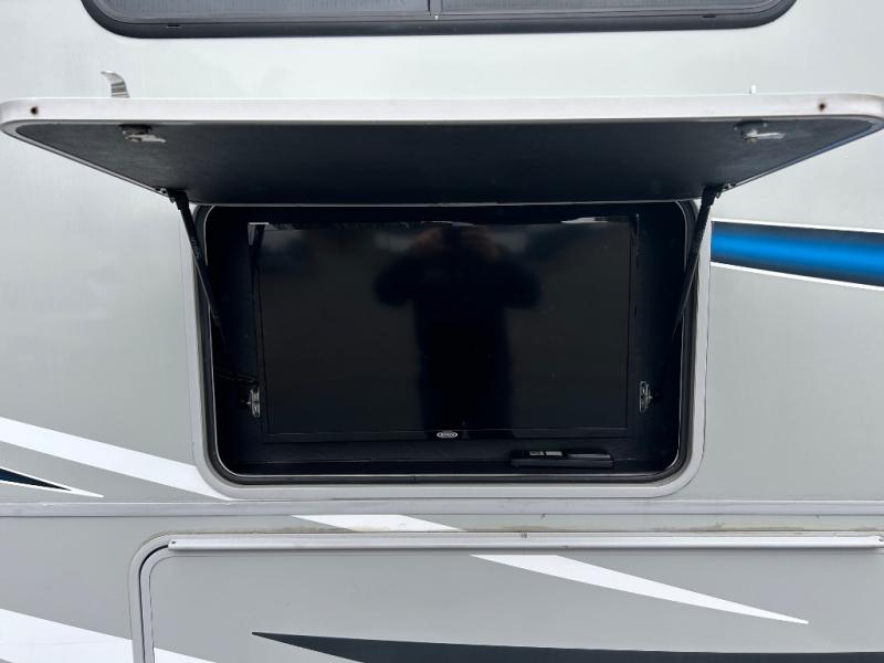 This Coachmen Pursuit motorhome is perfect for a family or group of friends up to eight individuals. You have a RV king bed in the rear private bedroom which also has access to the dual entry bath, a 68" sofa with storage, a booth dinette, and a drop down bunk above the cab. There are even bunk beds with a wardrobe the kids are sure to love! There are not only places for your family to sleep, but there are also plenty of places for storing their things while you are away on vacation. Plus, there is entertainment for everyone between the LED TV in the living room, the 32" LED TV in the bedroom, and the exterior LED TV!