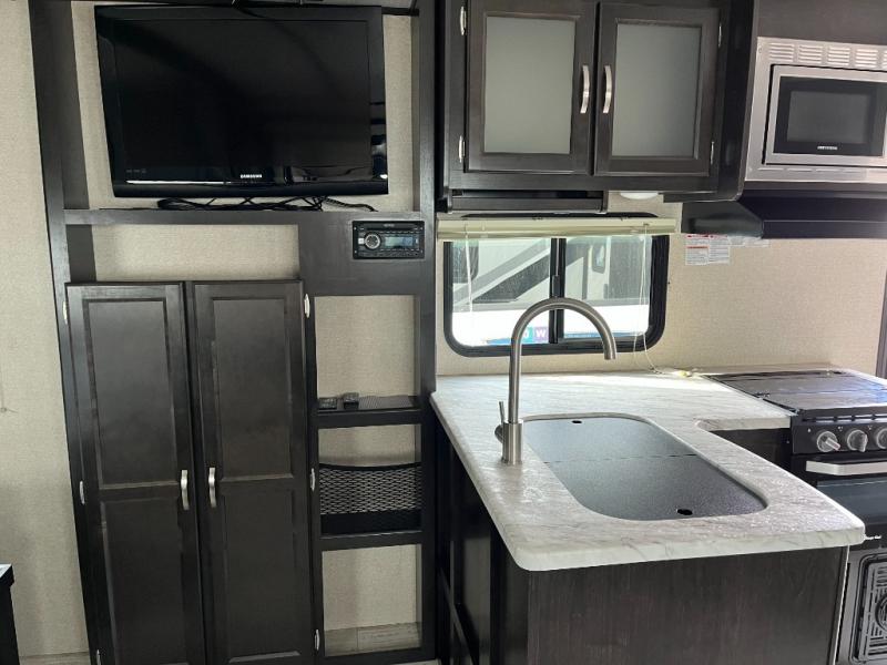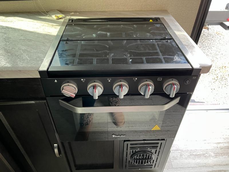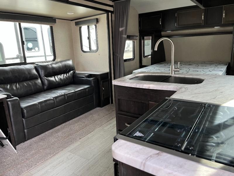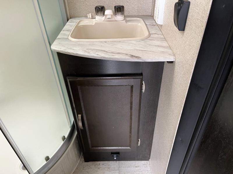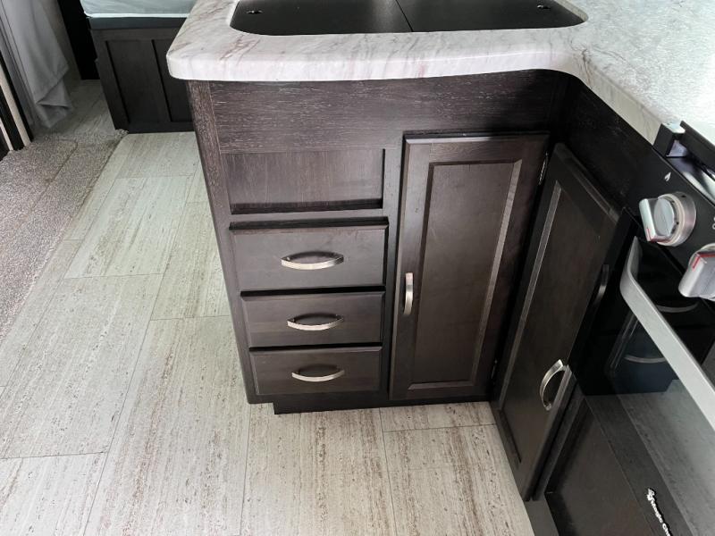 Step inside and appreciate the welcoming layout that makes efficient use of every square inch. The main living area features a comfortable dinette and seating that’s perfect for meals, game nights, or relaxing after a day of exploring. Natural light pours in through large windows, brightening the space and offering scenic views of your campsite.