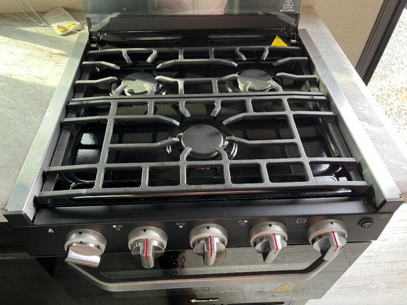 The kitchen is practical and functional, with a cooktop, microwave, refrigerator, sink, and plenty of cabinet storage. Meal preparation becomes simple and enjoyable, whether you’re fixing quick breakfasts or cooking hearty dinners for family and friends. Easy-to-reach storage ensures your cookware and essentials stay organized throughout your journey.