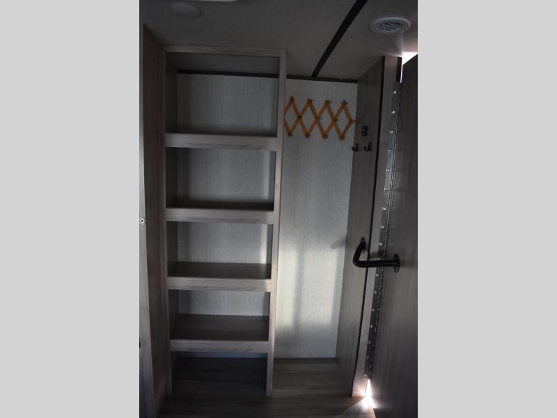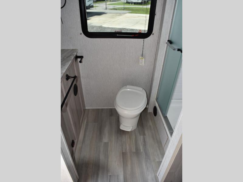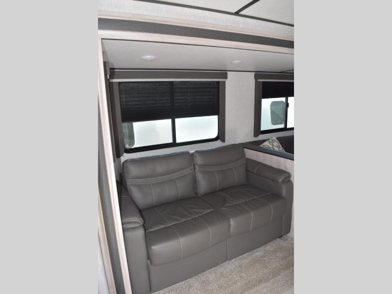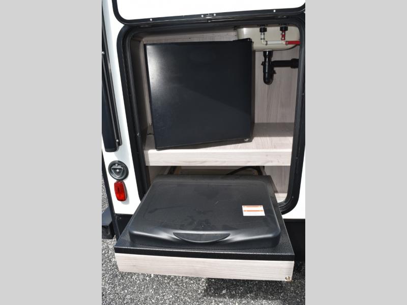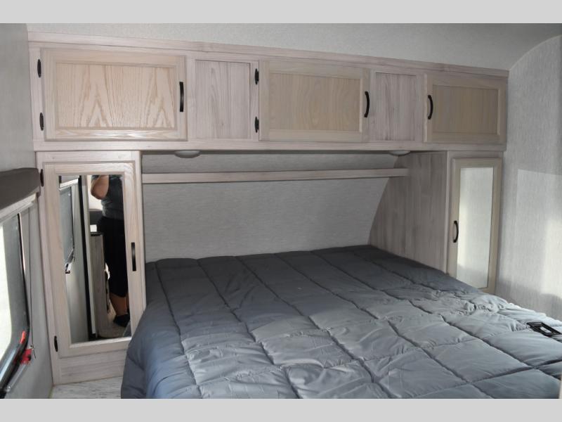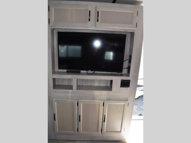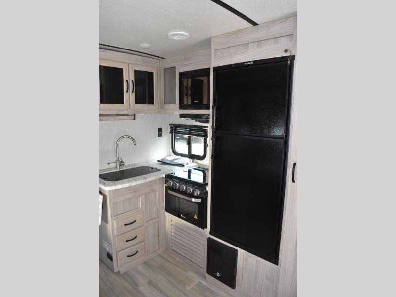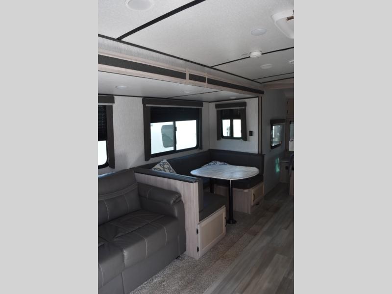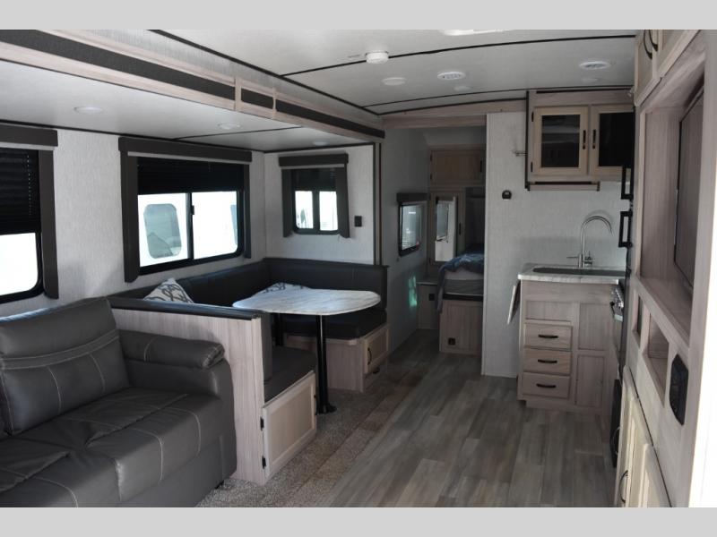 This Spirit Ultra Lite travel trailer works for a couple or a family since it has a private bedroom including a queen-size bed and clothing storage and a large slide in the main living area with furniture that doubles as sleeping space for extra campers. The kiddos can play with the dog on the floor while you and your spouse relax on the sofa or at the U-shaped dinette. Prepare dinner indoors on the three-burner cooktop, or use the outside kitchen if the weather is nice. After a day of hiking, you'll want nothing more than to clean up before bed, and the full rear bath will allow you to do just that. This model also includes a pet center, which is a convenient food and water storage area for your favorite animal.