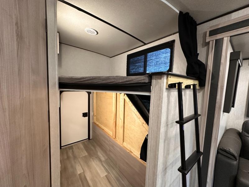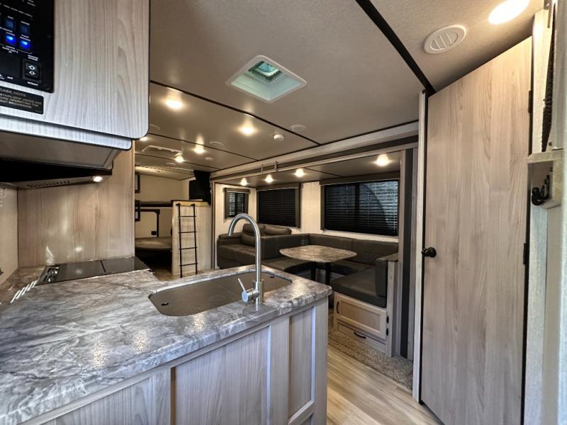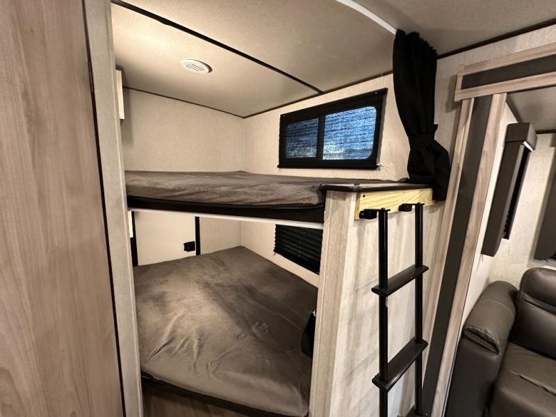 This Spirit Ultra Lite travel trailer offers you double-size bunk beds with two kids' convenience centers, a large slide that gives you more living space, and a U-shaped dinette and sofa that give you more sleeping space. If you flip up the lower double-size bunk in the rear, you will find extra storage with access from the exterior so that you can bring along your bikes, folding chairs, or coolers. The dual entry doors conveniently allow you to access the main living area or the full bathroom from outside so that you can get in and out without missing any of the fun. This model also includes Max Bed storage, an entry tool center, and plenty of exterior storage in the pass-through storage center.