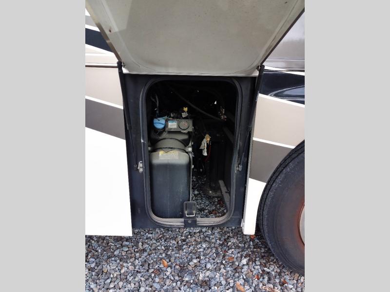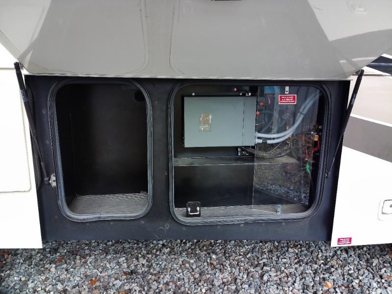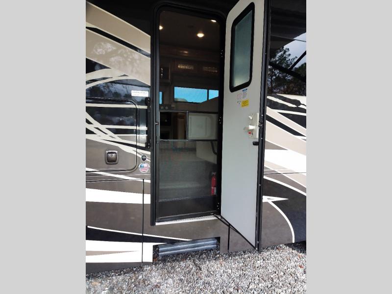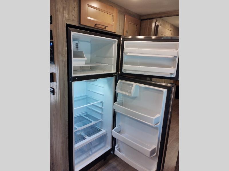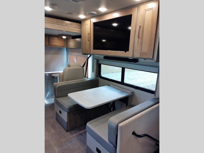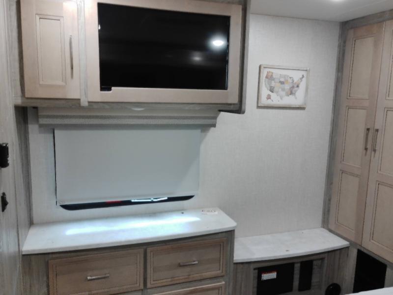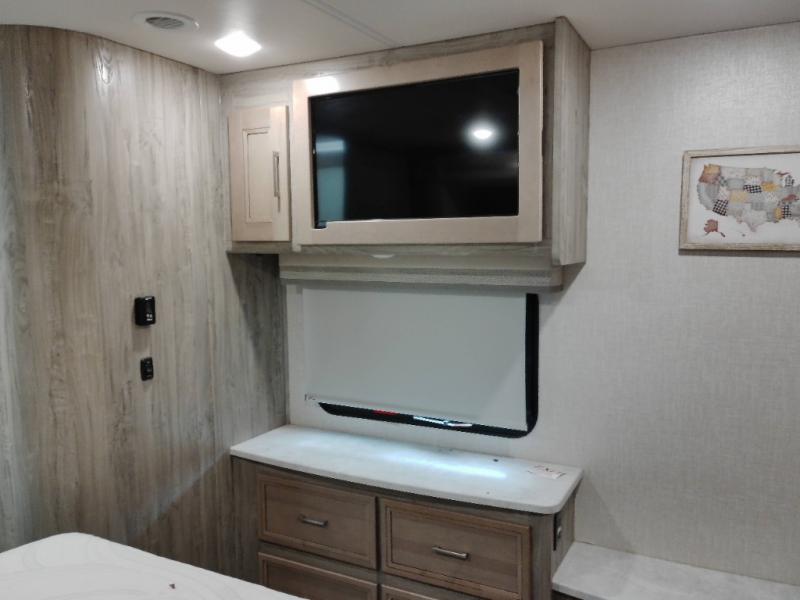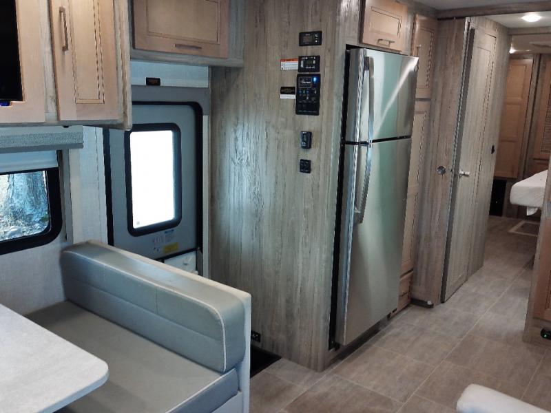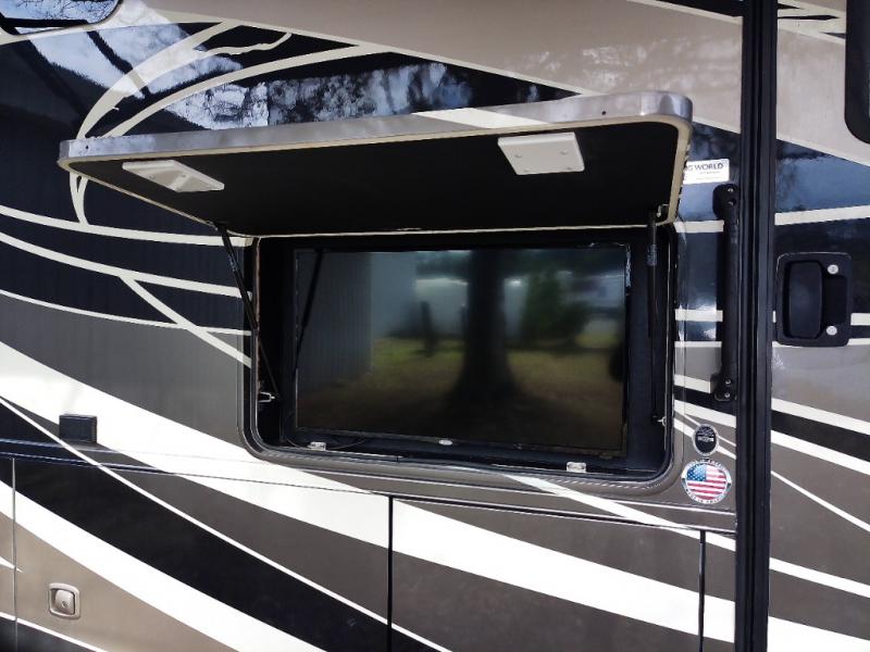 Plan to see the country in this comfortable motorhome that will feel just like home. The large slide out in the main living area will provide added interior space, and your crew will find seating space on the booth dinette or theater seating. This model includes a three burner cooktop with a glass cover, a residential refrigerator, plus two pantries for snacks and paper goods. You can be sure to get a great night's rest on the king bed slide out and you'll appreicate two wardrobes for all your clothes. You won't have to worry about missing out on your favorite shows because this model includes three TV's; a 40" TV above the dinette, a 32" TV in the bedroom, and an exterior TV!
