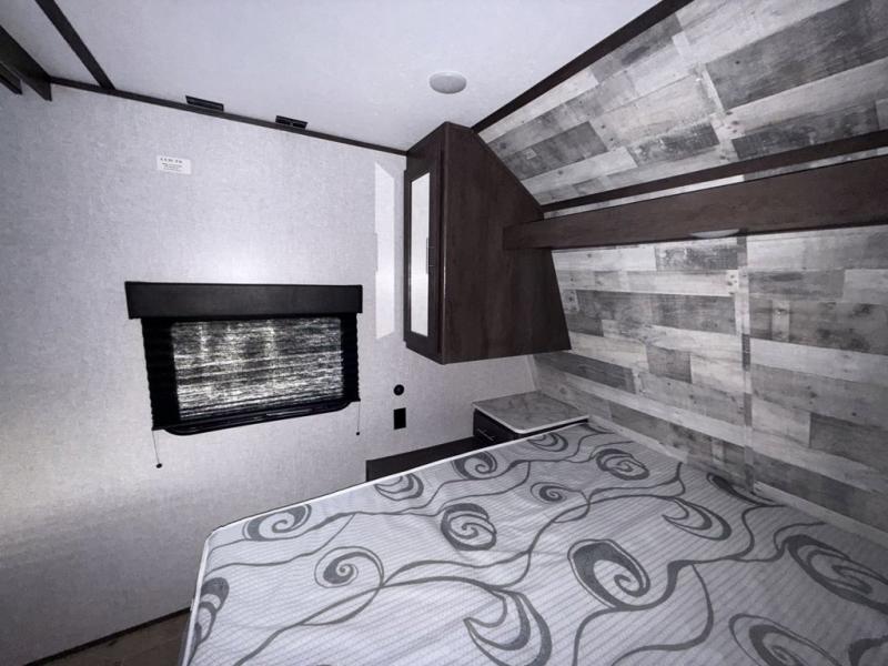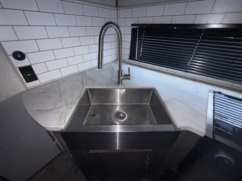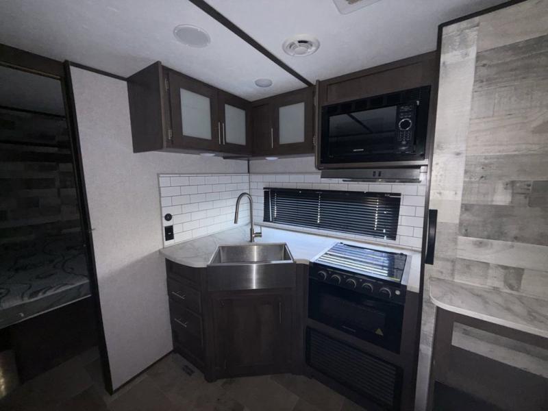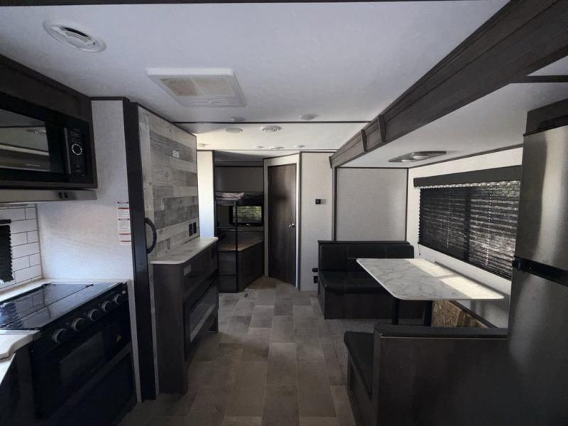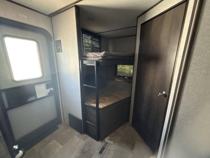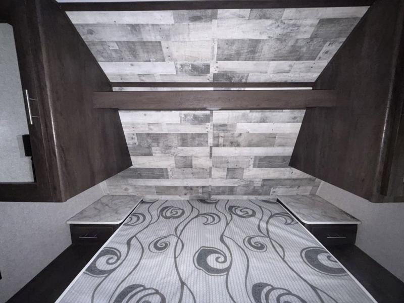Your family of seven or eight will love this trailer with double-size bunk beds for four, a queen bed for two and a U-shaped dinette for one or two more! The cook will love the large farm sink when washing up after making a meal with the kitchen amenities, and the large pantry behind the hinged entertainment center is super handy when packing for a trip. The outside kitchen is a great addition to the trailer since you can cook while watching the kids play around the campsite. And the 16' power awning offers an additional living space protected from the elements.