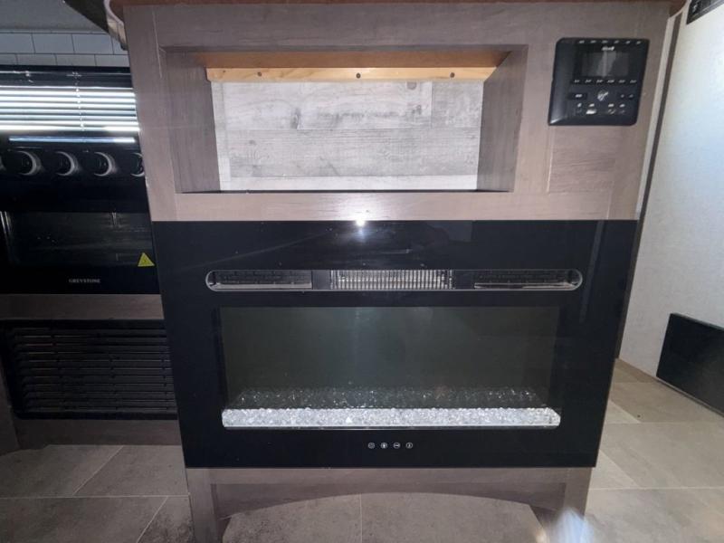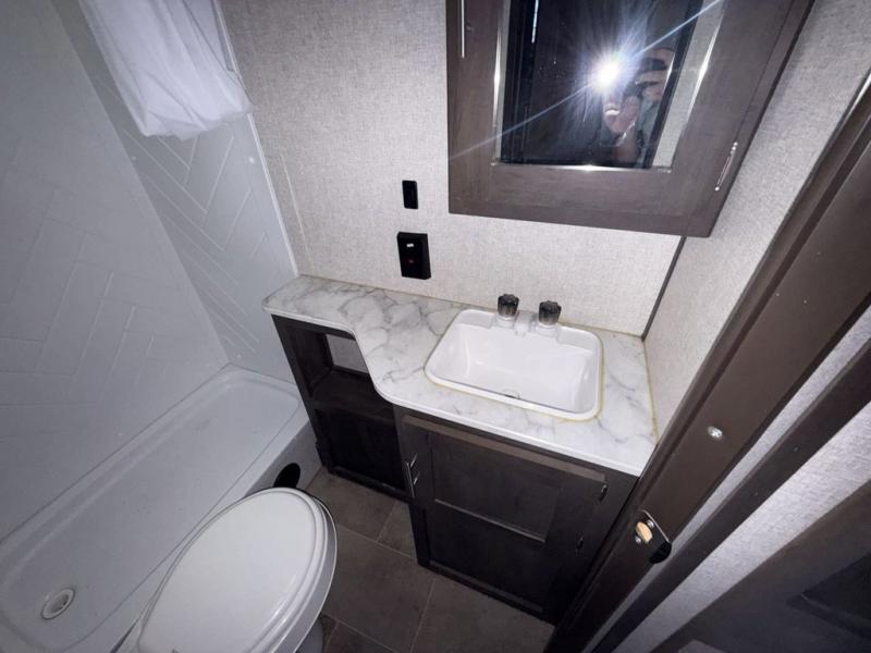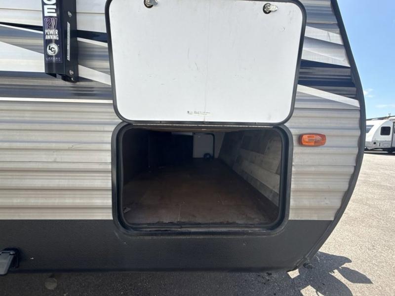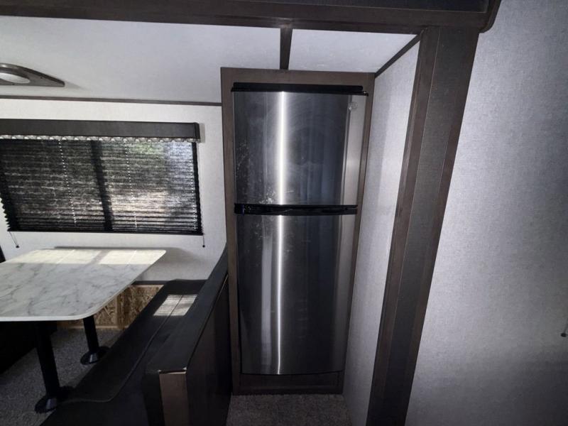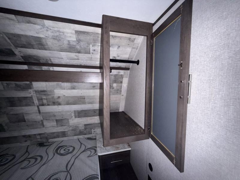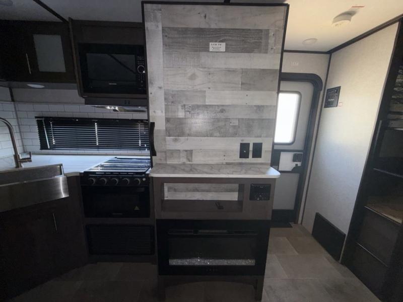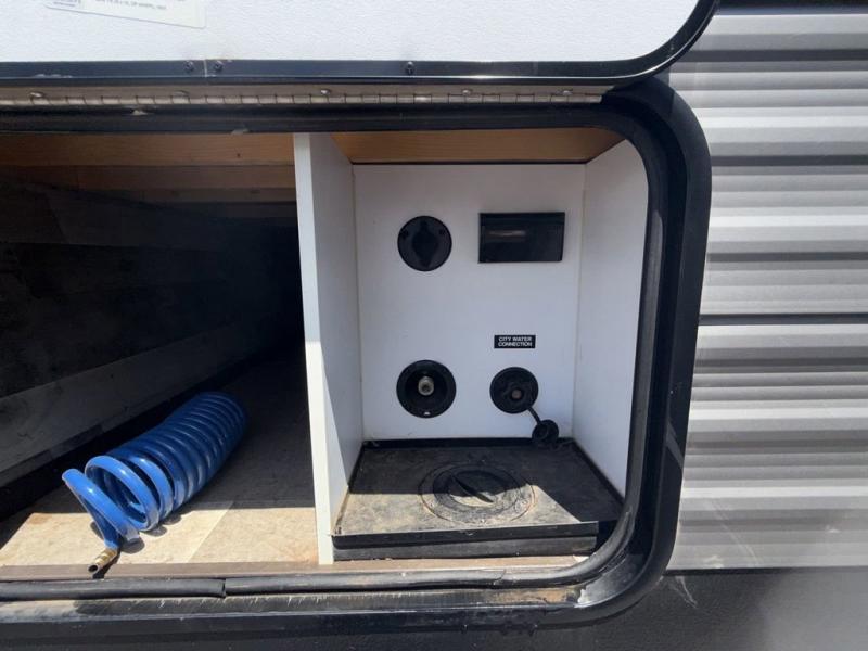 Your family of seven or eight will love this trailer with double-size bunk beds for four, a queen bed for two and a U-shaped dinette for one or two more! The cook will love the large farm sink when washing up after making a meal with the kitchen amenities, and the large pantry behind the hinged entertainment center is super handy when packing for a trip. The outside kitchen is a great addition to the trailer since you can cook while watching the kids play around the campsite. And the 16' power awning offers an additional living space protected from the elements.