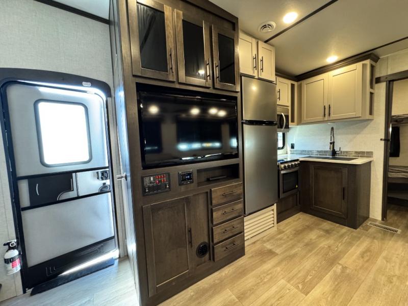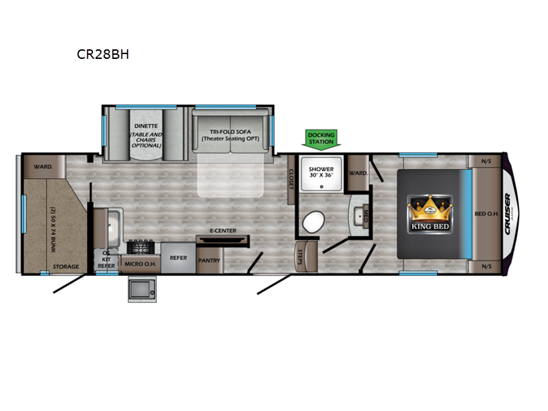 The 2021 CrossRoads Cruiser Aire CR28BH is a mid-sized fifth wheel designed for families, especially those who want a bunkhouse layout. At just over 32 feet long, it balances living space, storage, and towability while still offering room for up to 10 people to sleep comfortably.