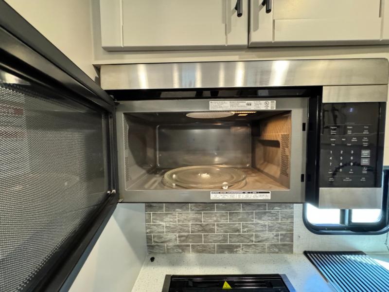Kitchen: Fully equipped with three-burner stove, oven, microwave, refrigerator, and counter space.