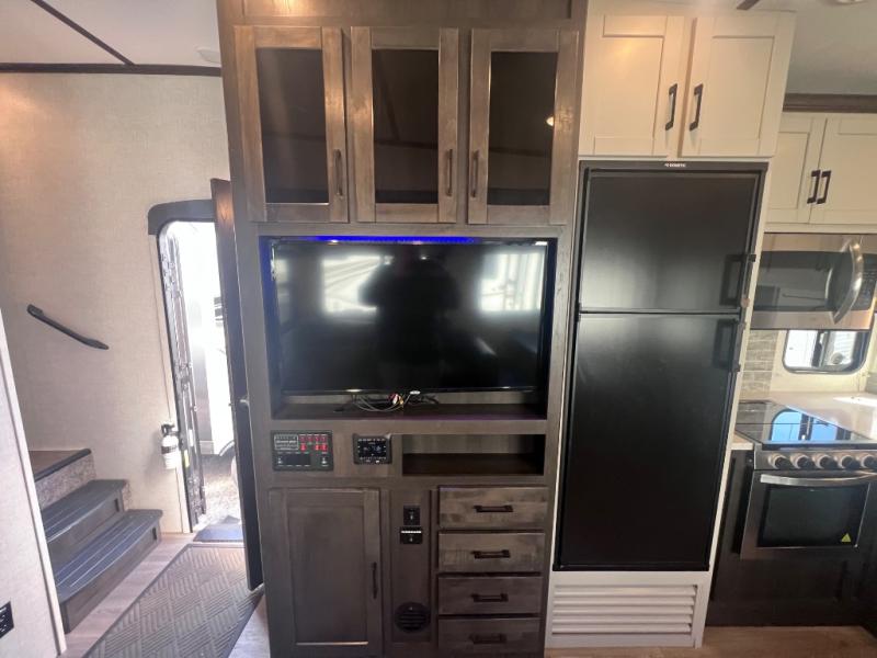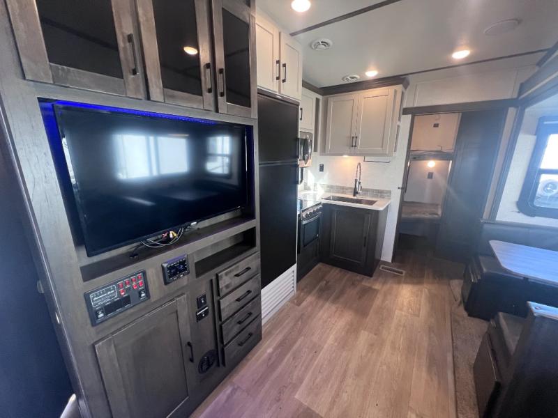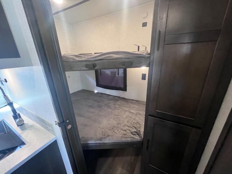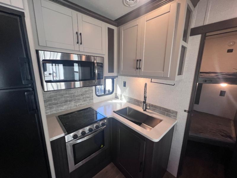 What makes a fifth wheel great? Spacious living areas, abundant sleeping space, and convenient features; you'll find them all in this unit! The little ones or your friends are sure to love the double-size bunks, plus there is storage under the bunks with outside access for convenience. The large slide out in the main living area provides the chef of the family space to cook a meal, or they may want to cook on the outside kitchen if the weather is nice. You will appreciate your seating options in this model, including the optional table and chairs in place of the booth dinette, and the optional theatre seating in place of the tri-fold sofa. Everyone can clean up in the full bath each day, and the front private bedroom with a king bed will feel just like home!