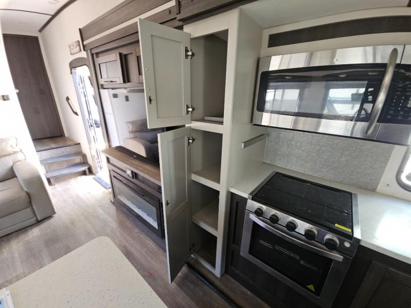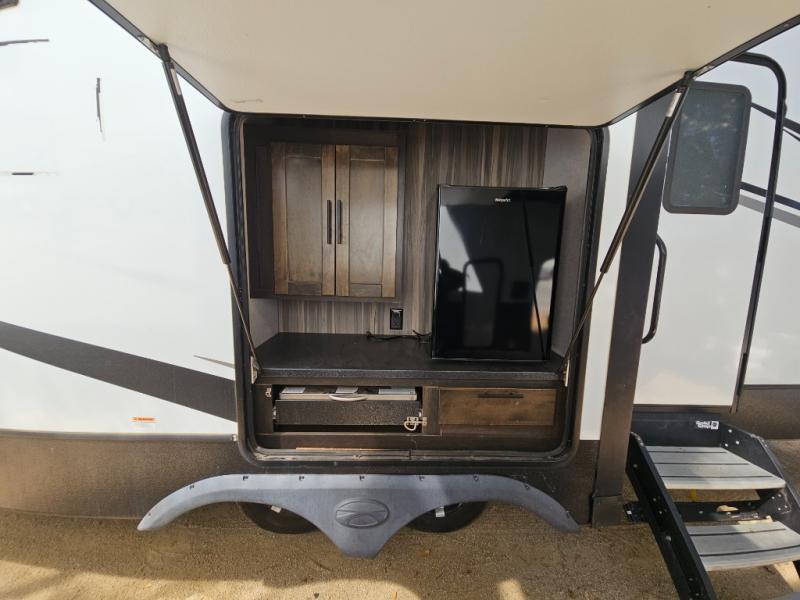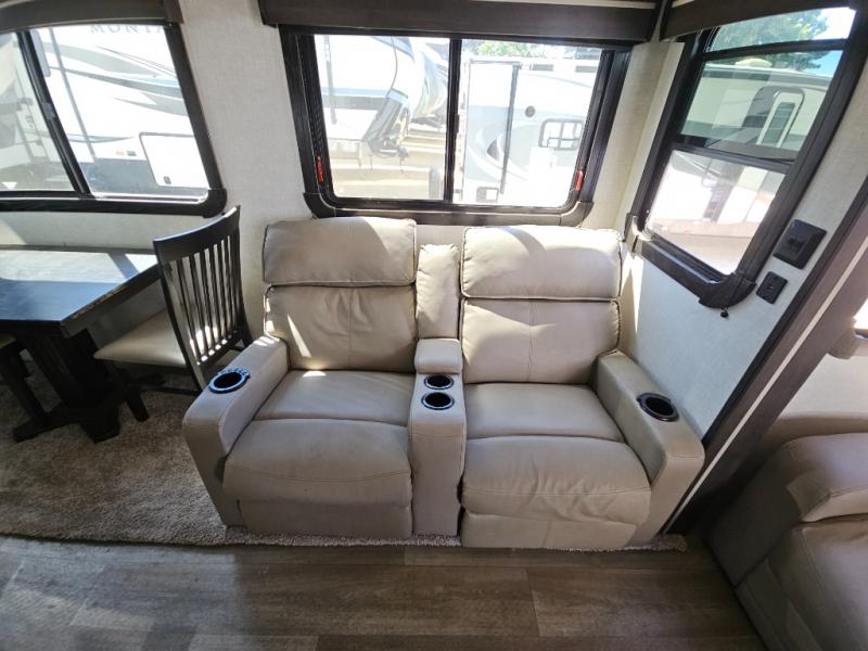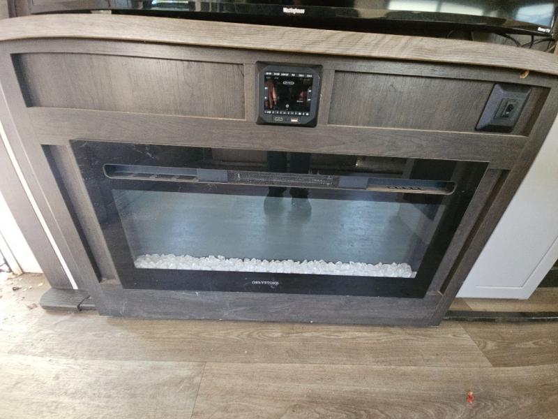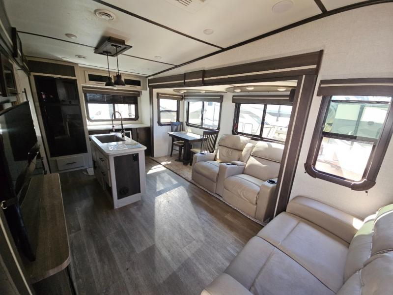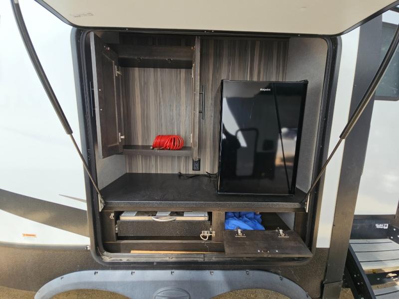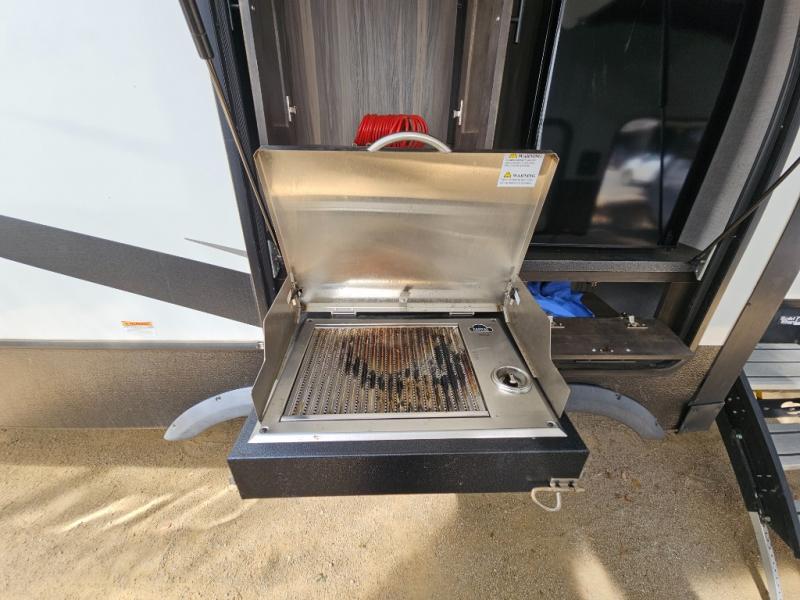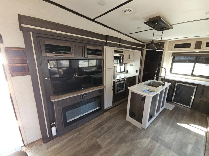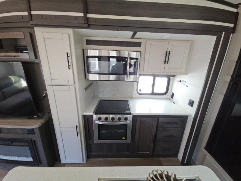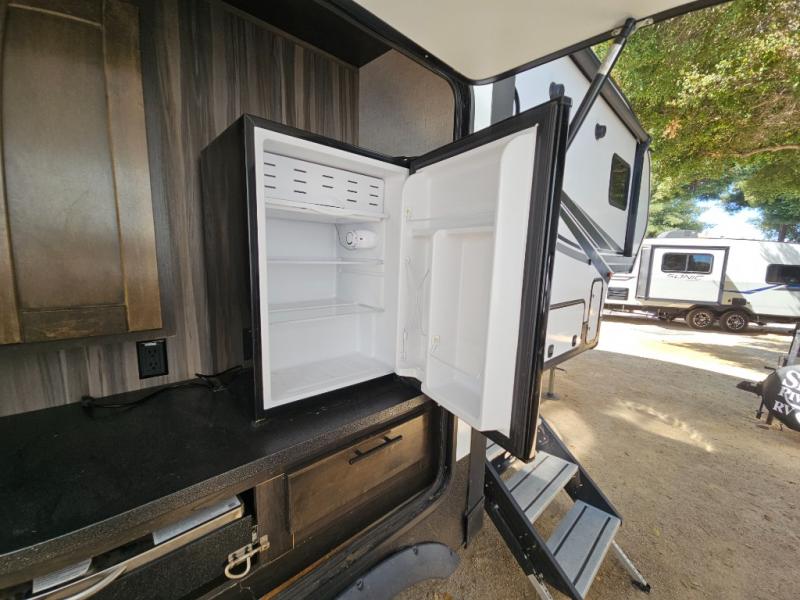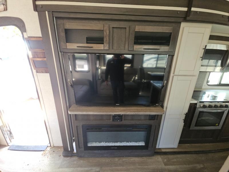 This fifth wheel features at-home comforts for relaxing vacations. The theater seats are directly across from the entertainment center and fireplace for a cozy evening indoors, and the dual opposing slides here create an open floor plan. The chef of the family will love cooking in the rear kitchen that includes plenty of counter space, a kitchen island, plus a pantry for dry goods and snacks. This model also includes an outdoor kitchen to grill the catch-of-the-day on, and the power awning with LED lights will be the perfect place to relax under. The dual entry bath will create a front master bedroom you are sure to love. Here, the queen bed will provide a great night's rest, and you'll find extra storage space within the slide out!