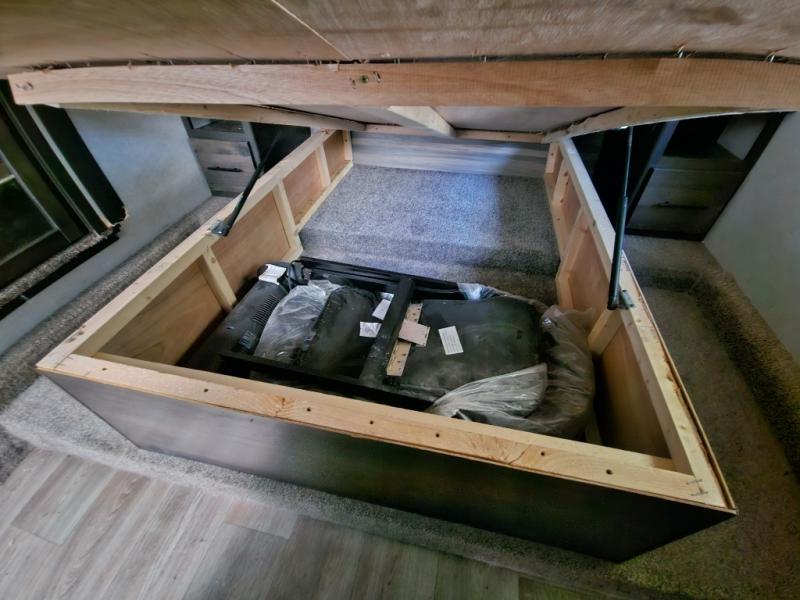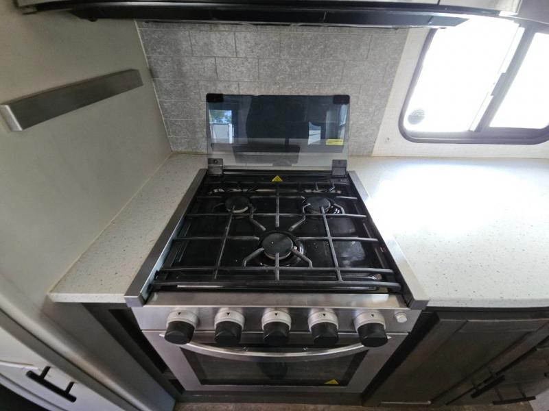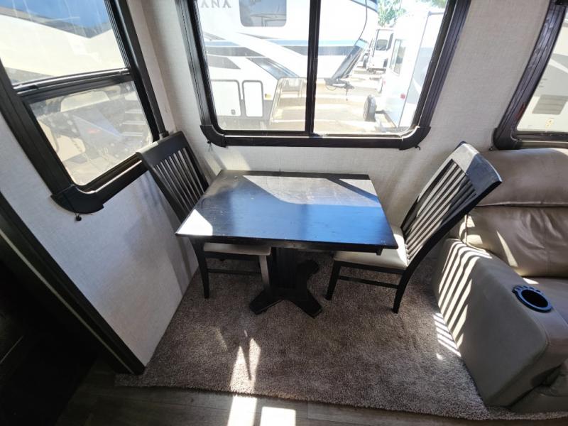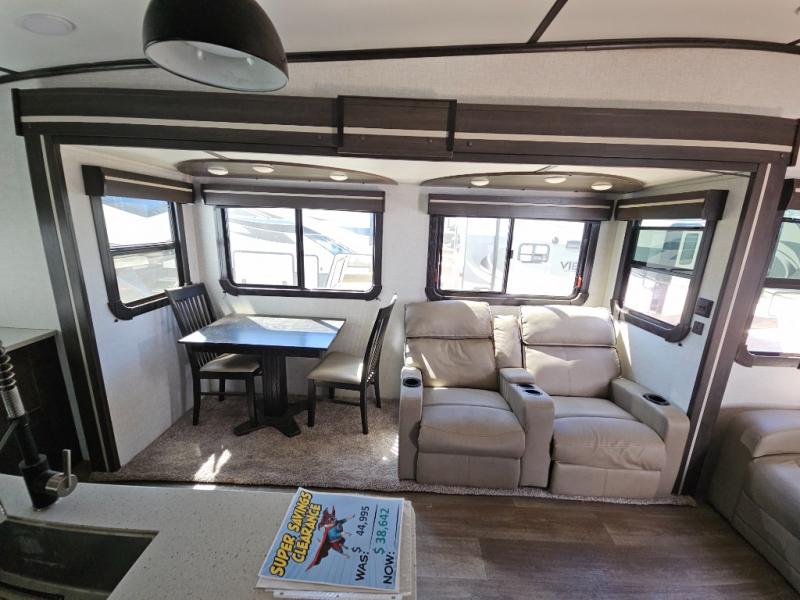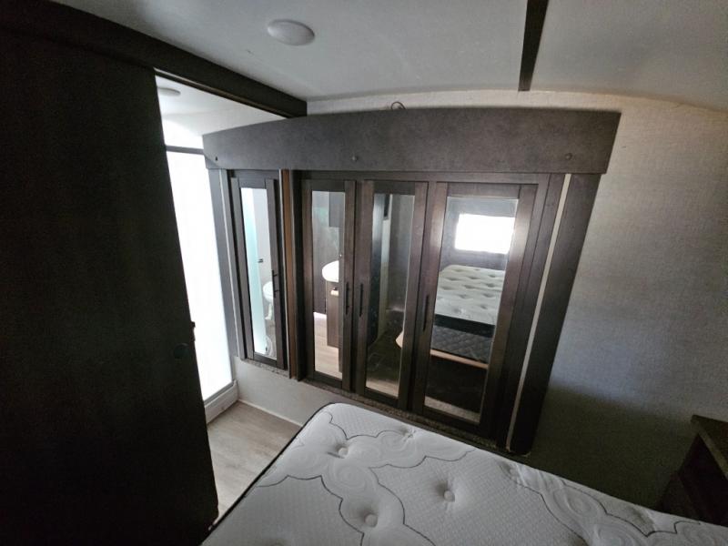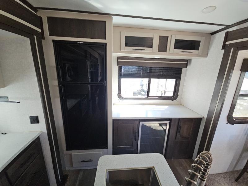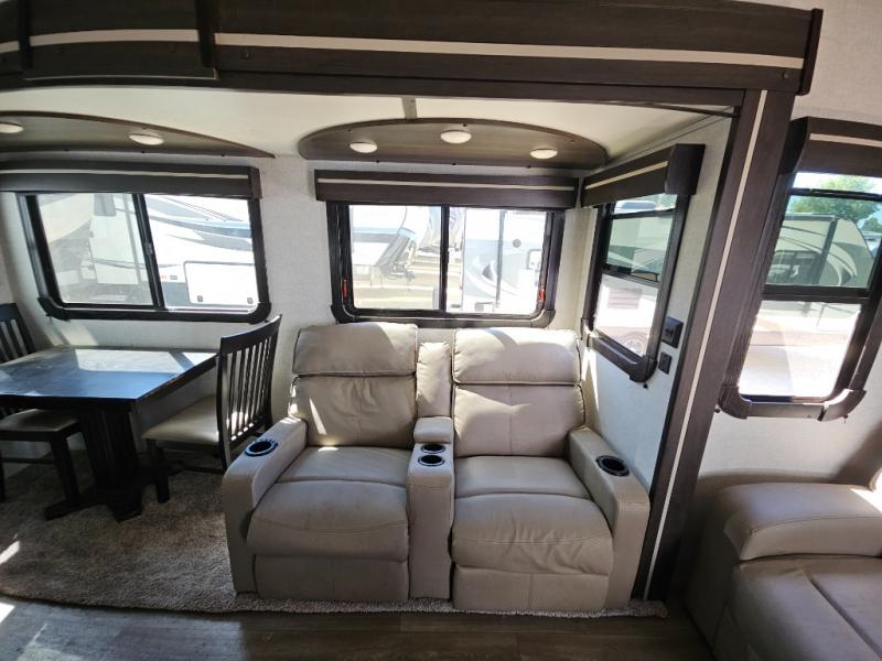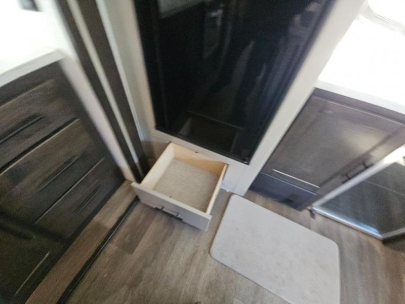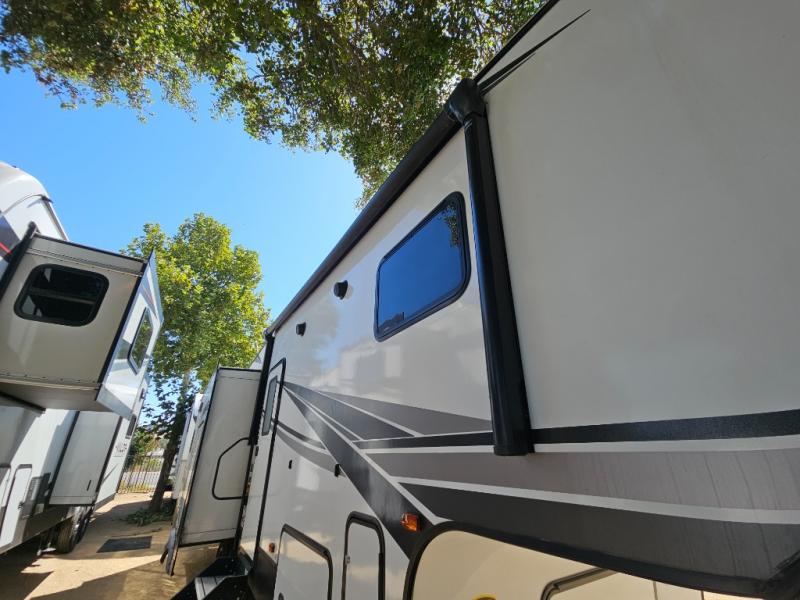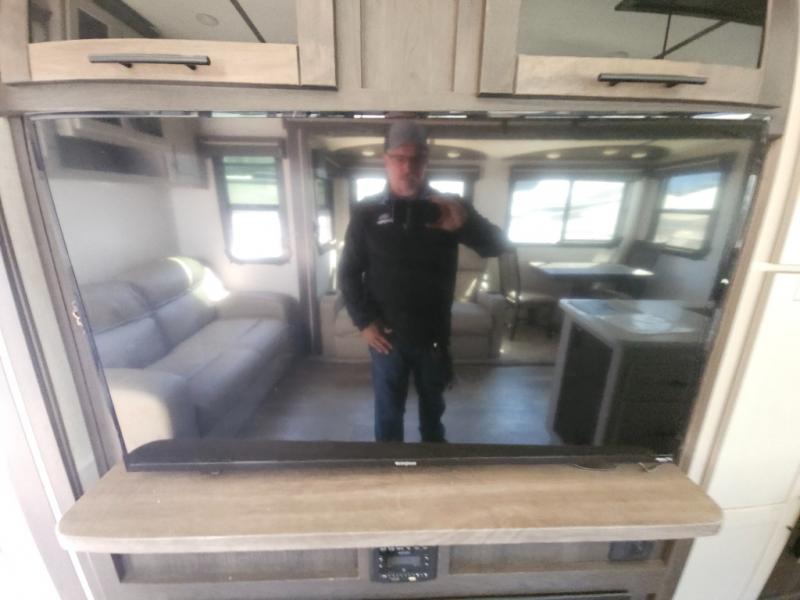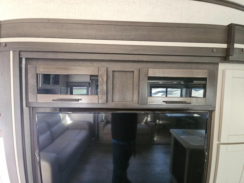This fifth wheel features at-home comforts for relaxing vacations. The theater seats are directly across from the entertainment center and fireplace for a cozy evening indoors, and the dual opposing slides here create an open floor plan. The chef of the family will love cooking in the rear kitchen that includes plenty of counter space, a kitchen island, plus a pantry for dry goods and snacks. This model also includes an outdoor kitchen to grill the catch-of-the-day on, and the power awning with LED lights will be the perfect place to relax under. The dual entry bath will create a front master bedroom you are sure to love. Here, the queen bed will provide a great night's rest, and you'll find extra storage space within the slide out!
