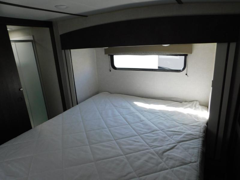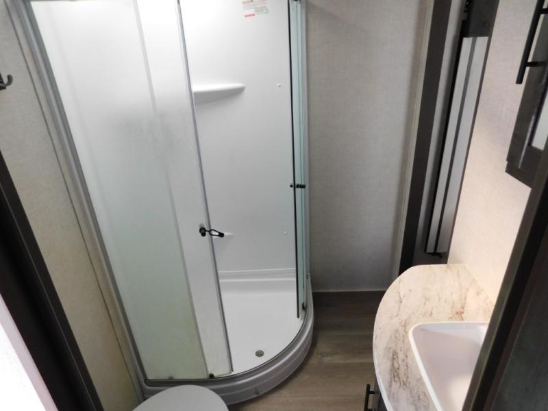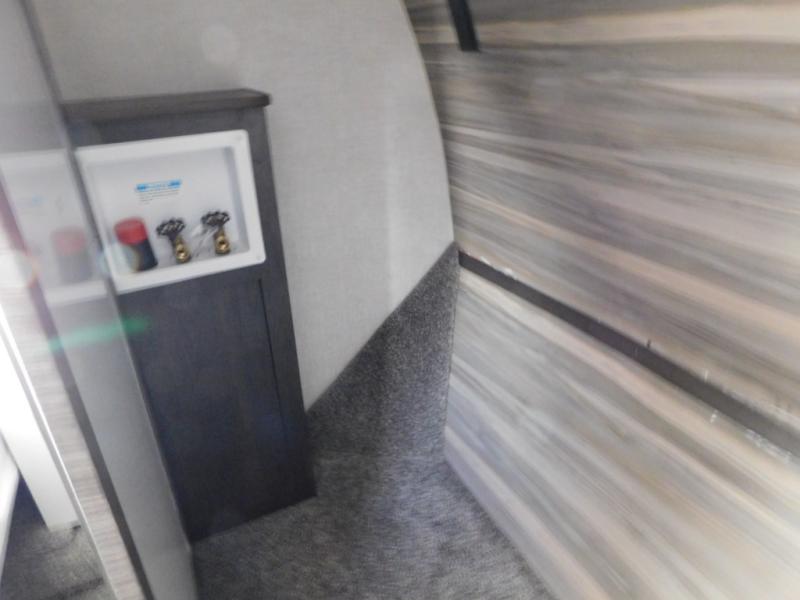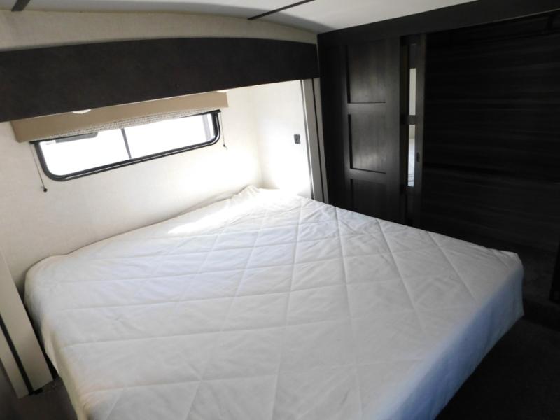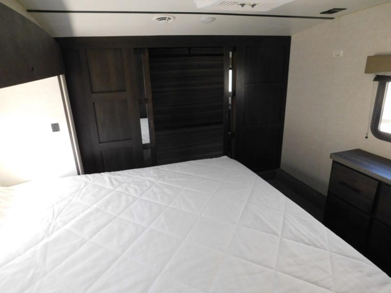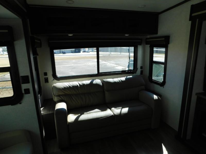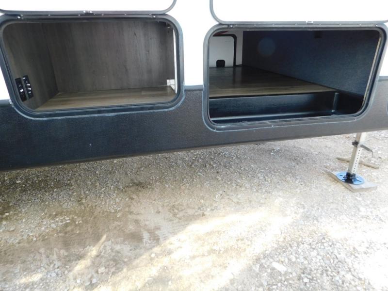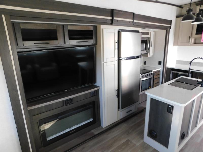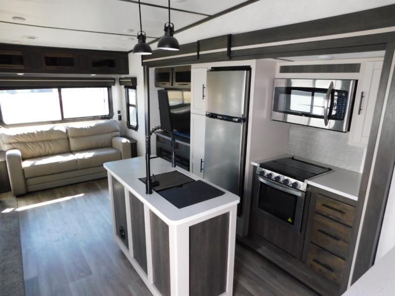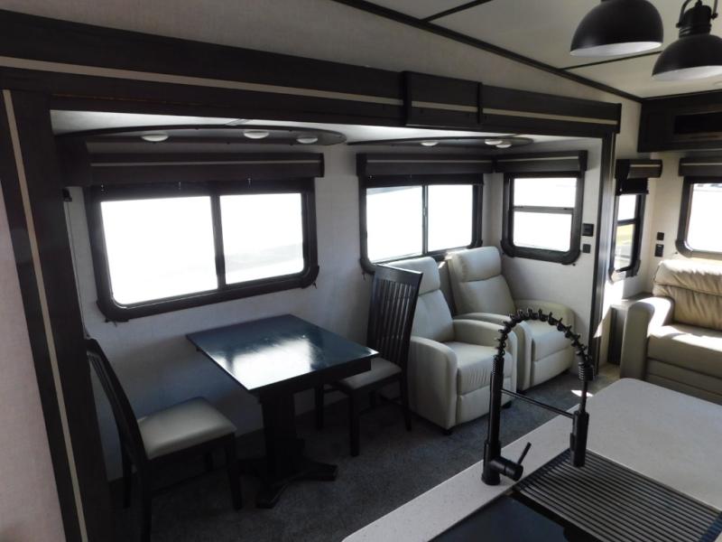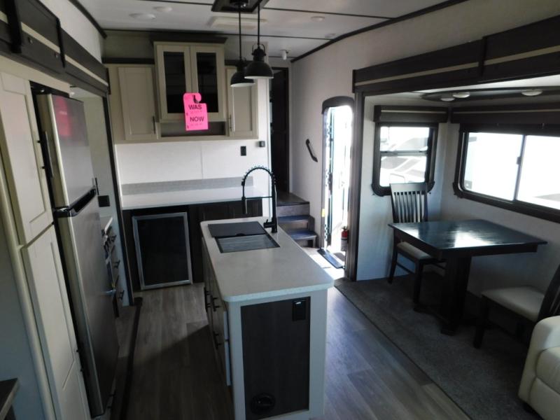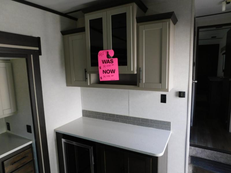 Enjoy your weekends away from the hustle and bustle of the city life in this fifth wheel. Once you arrive at your destination, relax on the power theatre seat and grab a cold drink from the wine fridge. The chef of the group can prepare lunch on the kitchen island, and the little ones can play a board game at the booth dinette. After lunch, head outside to stretch your legs on a trail or two. Everyone can take turns cleaning up in the dual entry bath that includes a skylight to let natural light in. You and your spouse will love the slide out king bed in the front master suite, plus there is a large closet to store clothes and shoes. There is even a space that has been prepped to add an optional washer and dryer!