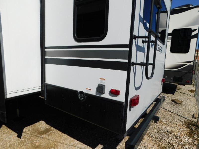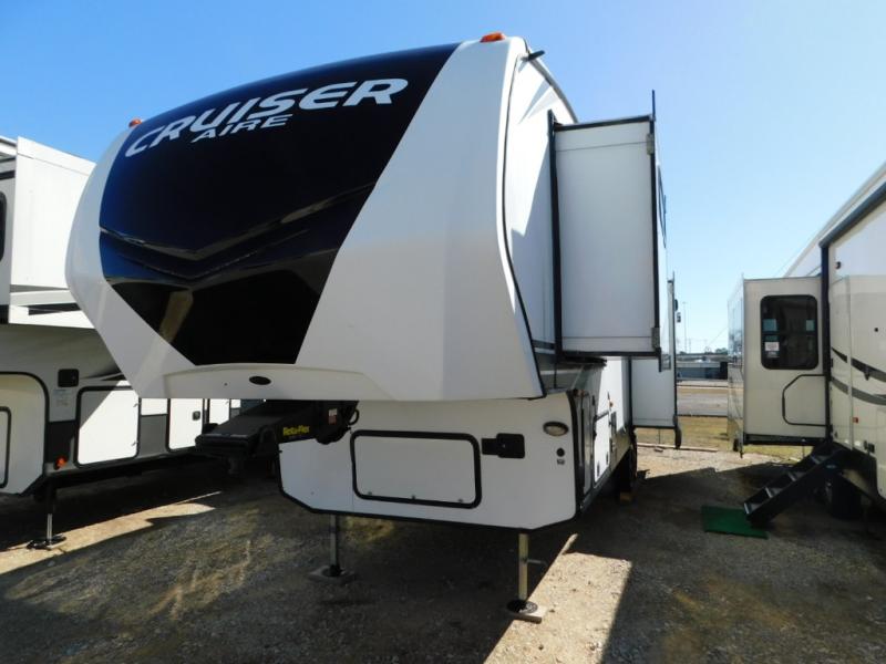 The CrossRoads RV Cruiser Aire fifth wheels and travel trailers have been made with your needs in mind. You will find many conveniences to make camping easier than ever, including Secure Stance entry steps, a Keyed-A-like lock system, a friction hinge entry door with a window, and more! The one piece seamless Super Flex roof includes a rear roof ladder so you can easily clean the top of your unit after a weekend in the woods. You can easily bring along all of your necessities with convenient storages spaces, like the full truck under-bed storage, the spacious bedroom closets, and the exterior heated pass-through storage. The high-rise faucet in the kitchen will make clean-up a breeze, and the hardwood cabinet doors will give that extra touch-of-home!