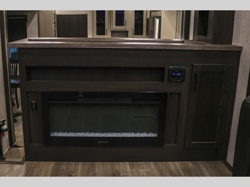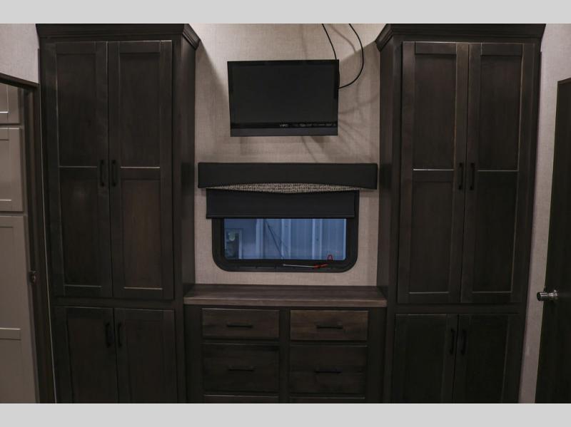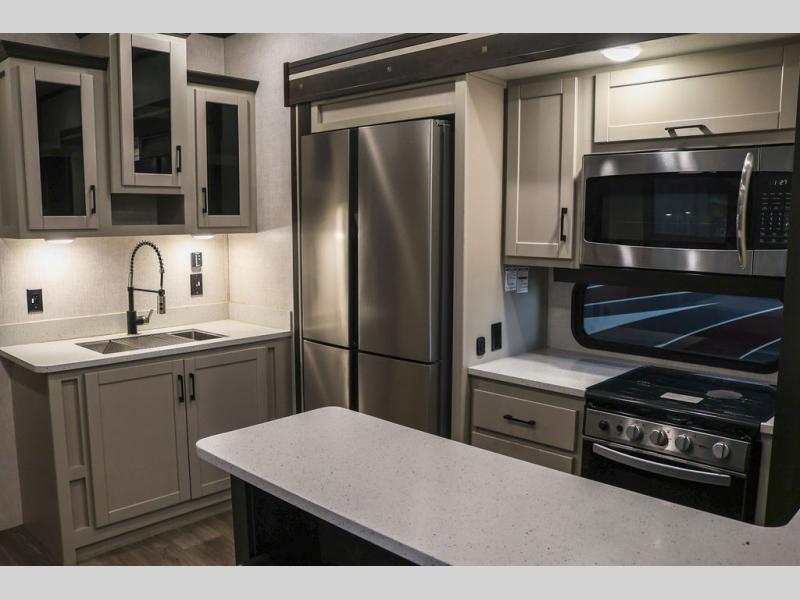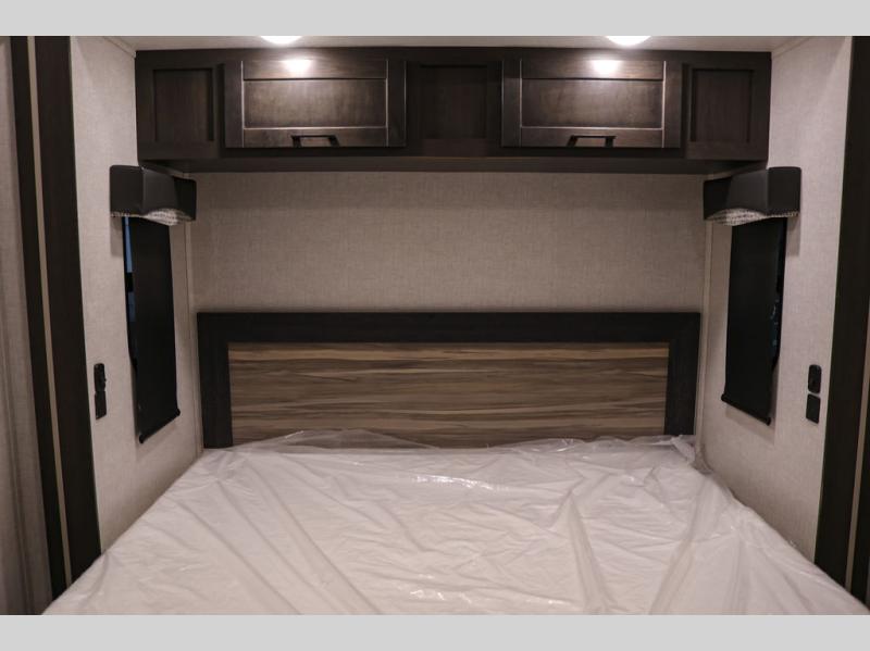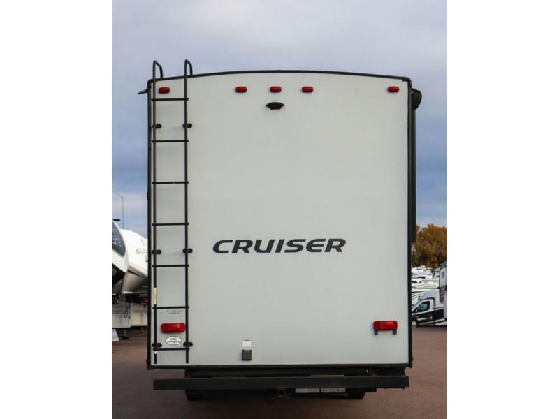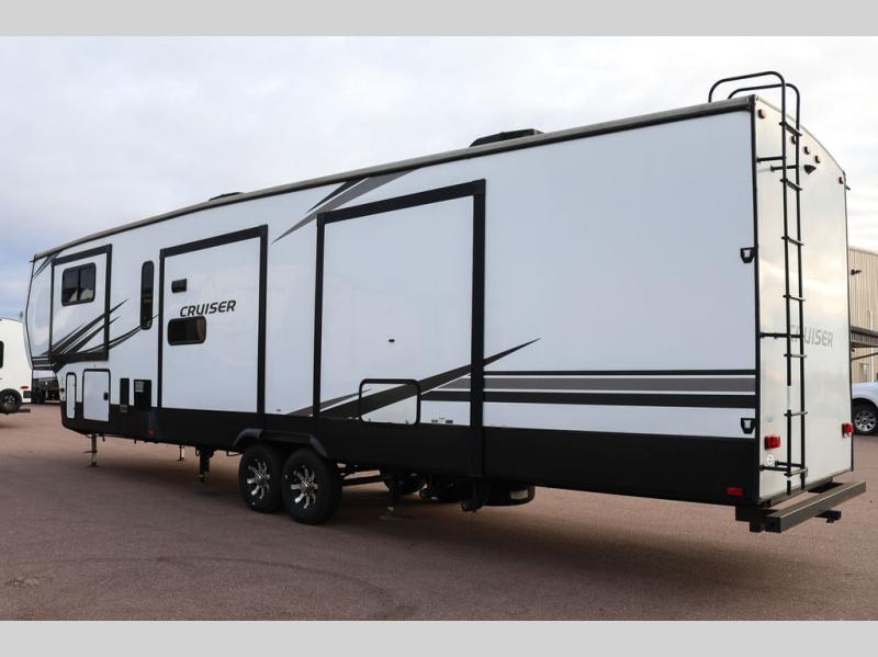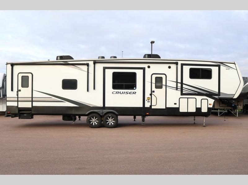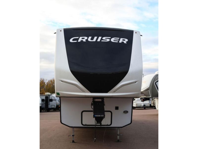 This stunning Cruiser fifth wheel is absolutely packed to the brim with amazing features that will enhance all of your road trips! You won't be at a loss for comfort within this model because the separate living room up front has everything needed for a great movie night, like two tri-fold sofa slides, theater seating, and an entertainment center with a 50" LED HDTV and fireplace. Another extremely comfortable location will be the master suite in the back of this model. The bedroom area has a king bed slide for more space, and the full bathroom that is attached to the bedroom has a dual-sink vanity, as well as the second exterior entry door into this unit. You will also be blown away by the great kitchen features, like the wine bar, hutch, and island peninsula.
