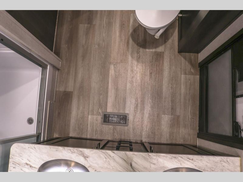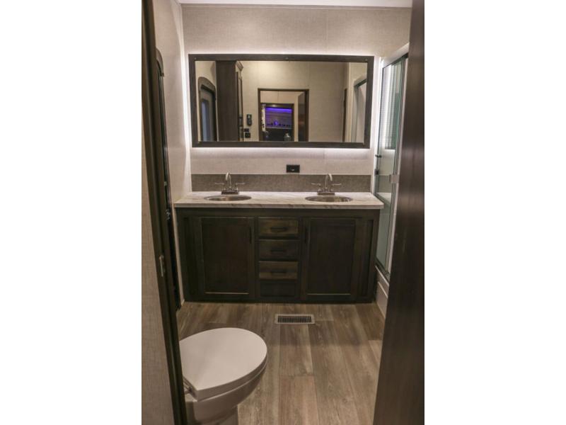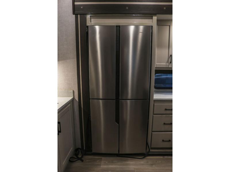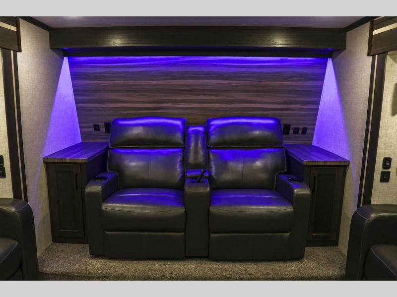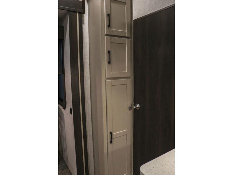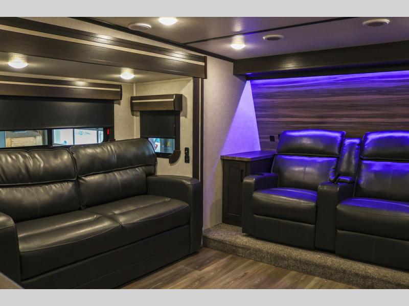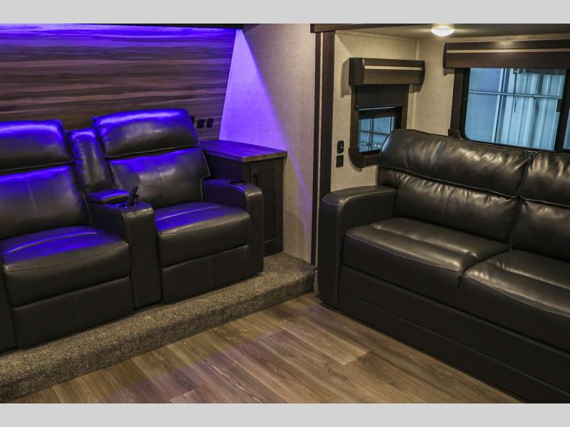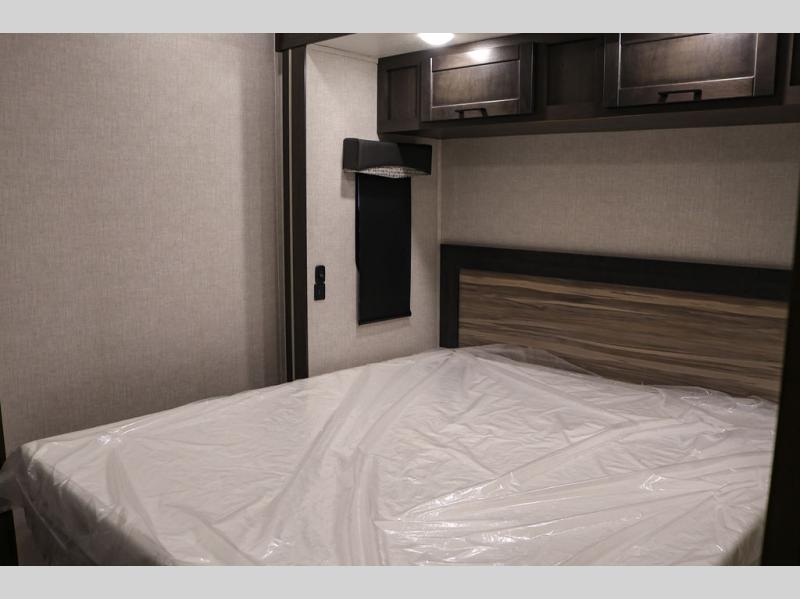 This stunning Cruiser fifth wheel is absolutely packed to the brim with amazing features that will enhance all of your road trips! You won't be at a loss for comfort within this model because the separate living room up front has everything needed for a great movie night, like two tri-fold sofa slides, theater seating, and an entertainment center with a 50" LED HDTV and fireplace. Another extremely comfortable location will be the master suite in the back of this model. The bedroom area has a king bed slide for more space, and the full bathroom that is attached to the bedroom has a dual-sink vanity, as well as the second exterior entry door into this unit. You will also be blown away by the great kitchen features, like the wine bar, hutch, and island peninsula.