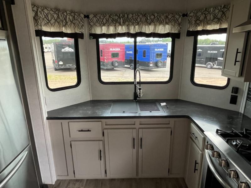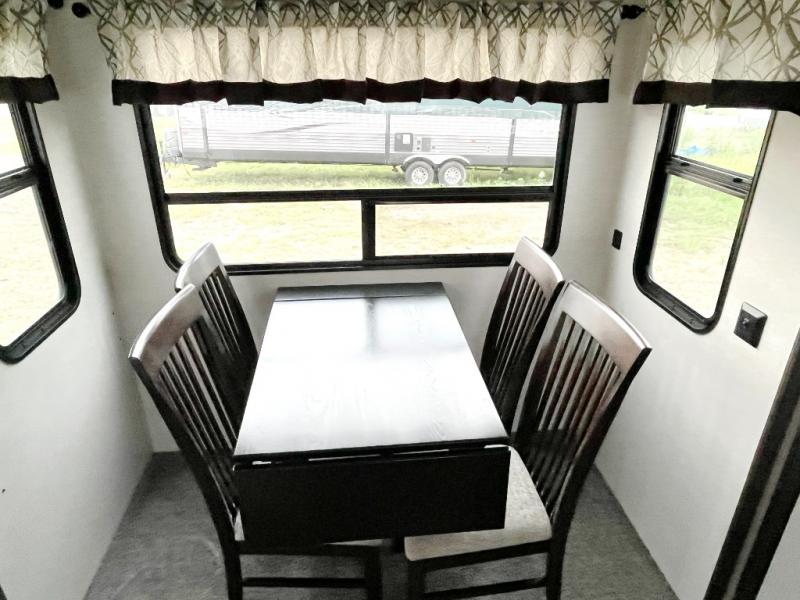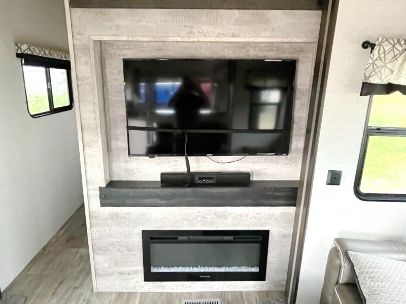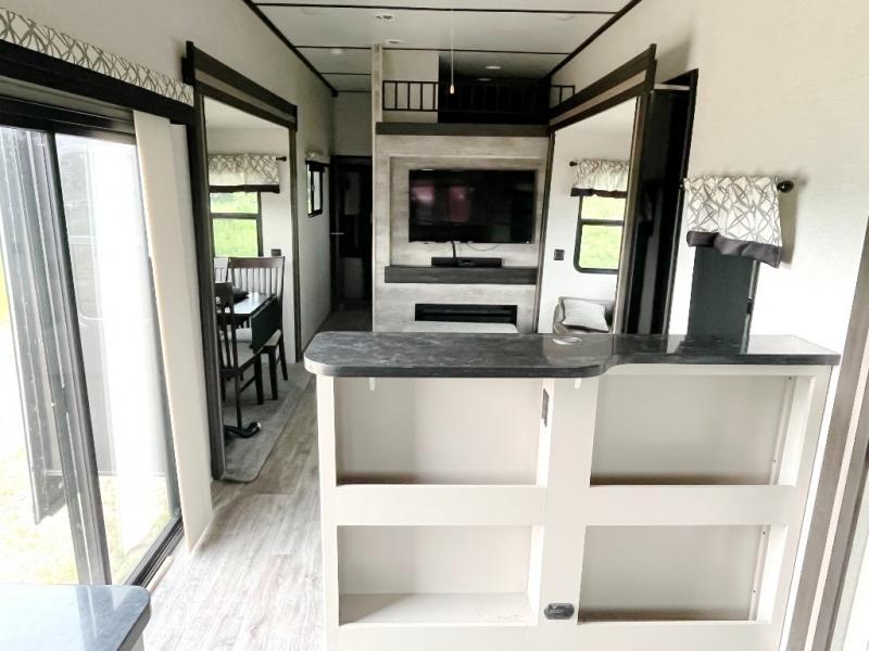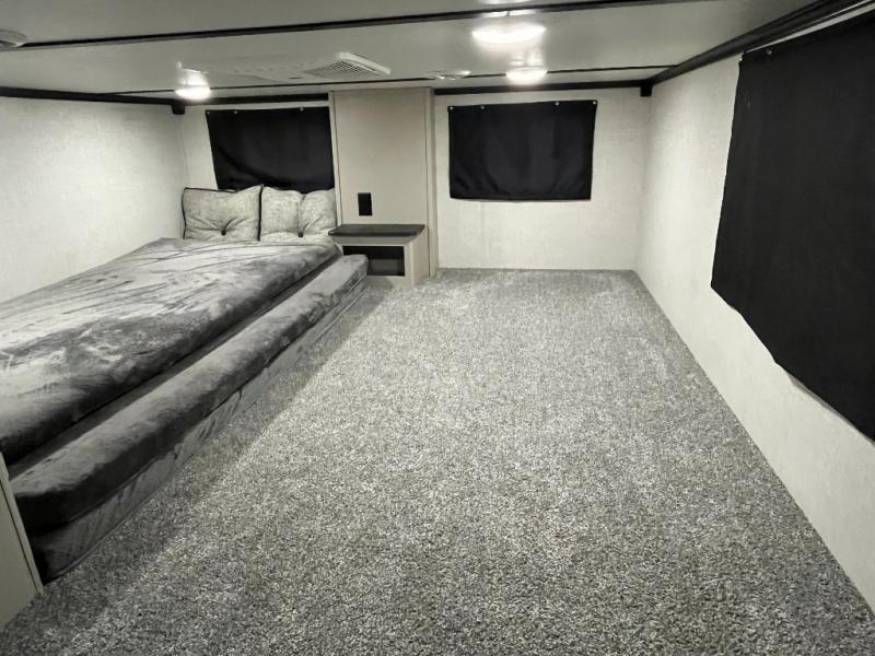 With a double loft area that has three 38" x 74" bunk mats, you can invite all of the grandkids to come on a summer vacation in this destination trailer! Enjoy your own privacy with the rear private bedroom which has a king bed slide, a wardrobe, a dresser, an entertainment center, a closet that is prepped to add an optional washer and dryer, and even one of the dual entry doors. Everyone can freshen up in the full bathroom with the 48" shower, and keep their bellies full with the front kitchen. Inside the kitchen is a three burner cooktop with a range hood above it, plenty of countertop space, a pantry cabinet with microwave, a residential refrigerator, and a bar top with two bar stools that overlooks the middle living area. You can eat your meals together at the free standing table with chairs and bench seating slide then relax on either the 72" sofa slide or theater seating across from the entertainment center with a fireplace and 50" LED HDTV to watch your favorite movies!