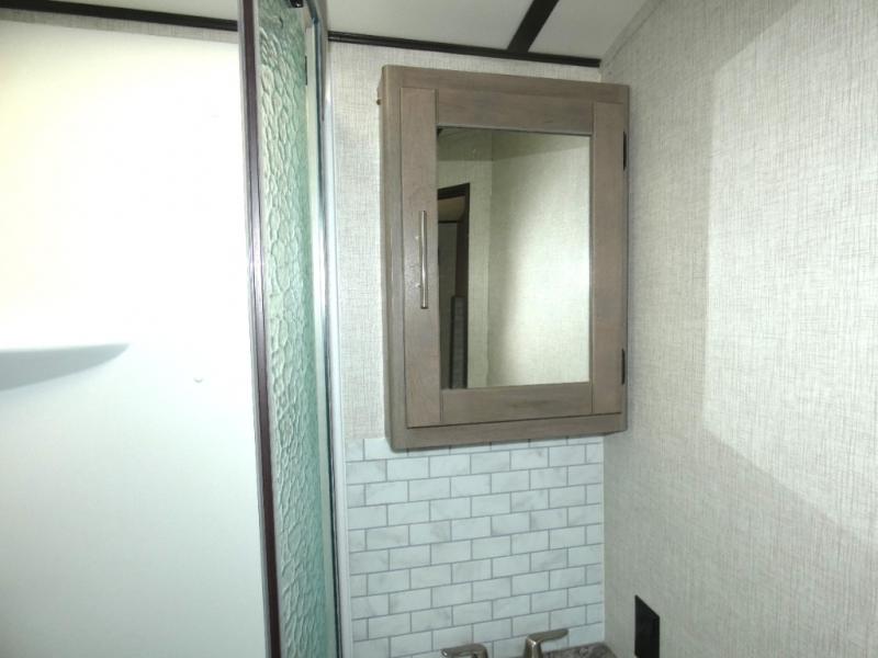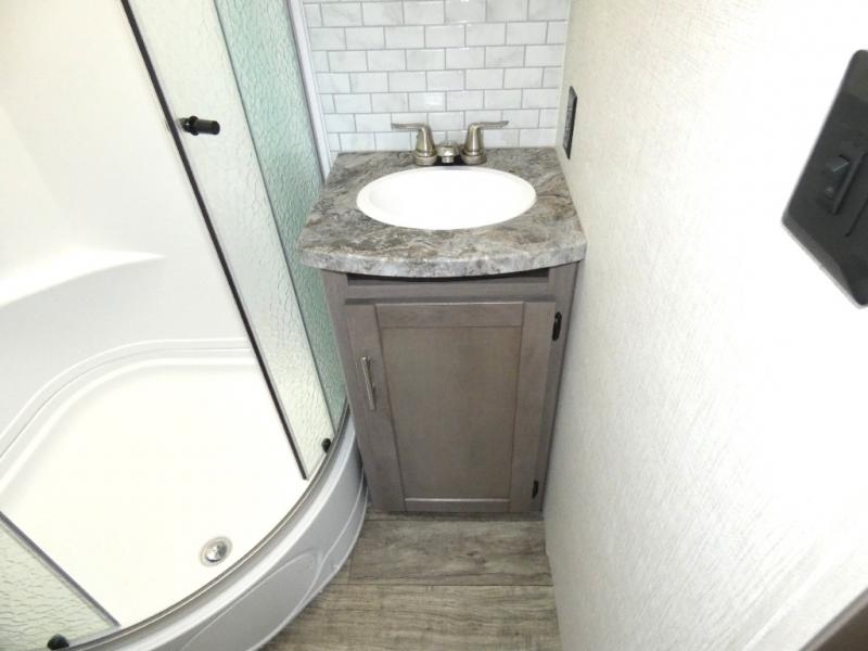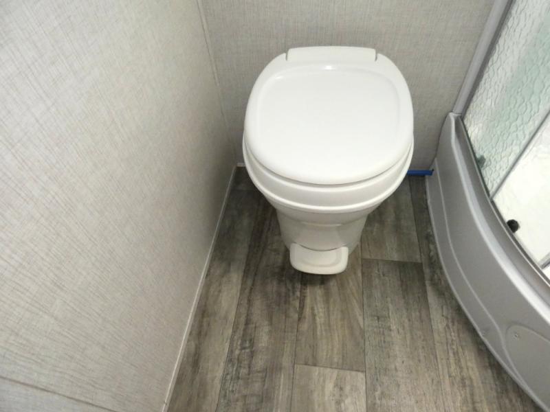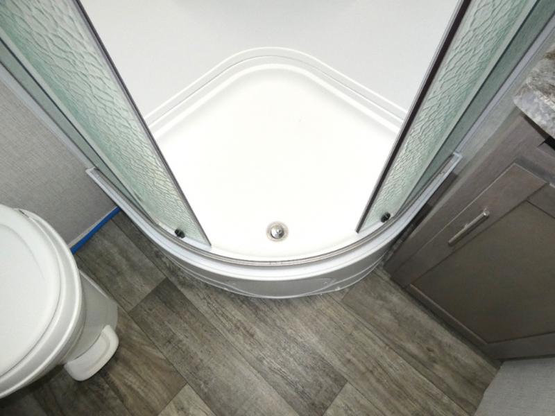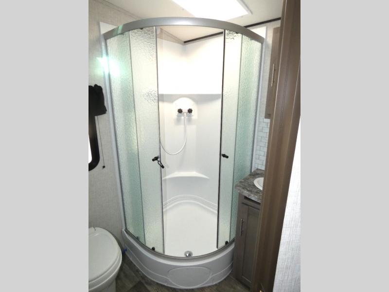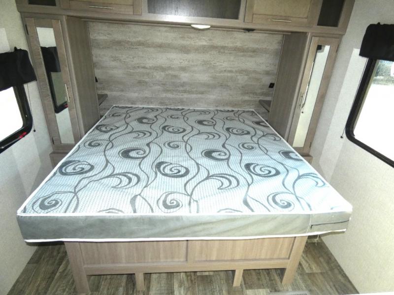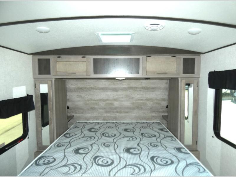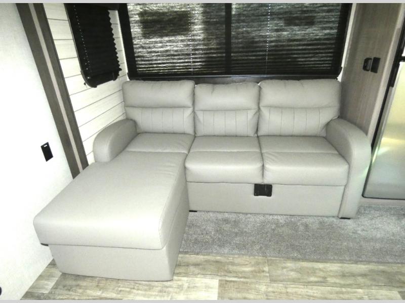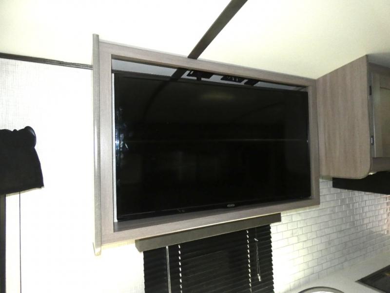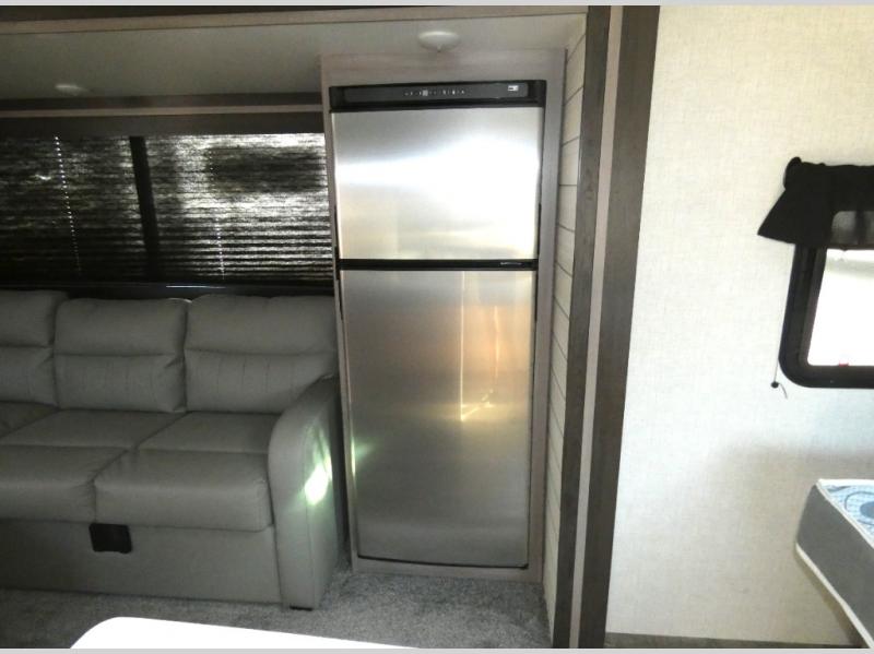 Nothing says luxury like a king bed in the front bedroom, plus a slide out for added interior space. Your crew can relax on the tri-fold sofa and chaise lounge before heading off to find a trail or two. There is a convenient shoe storage and pet station for your furry friends, and the dual wardrobes can store all your clothes for the week. Freshen up in the full bath that includes a shower skylight, then head to the kitchen to prepare a meal on the glass top range or use the handy stainless steel microwave. This model also includes a pantry just as you enter the unit, plus plenty of overhead compartments for all your belongings!